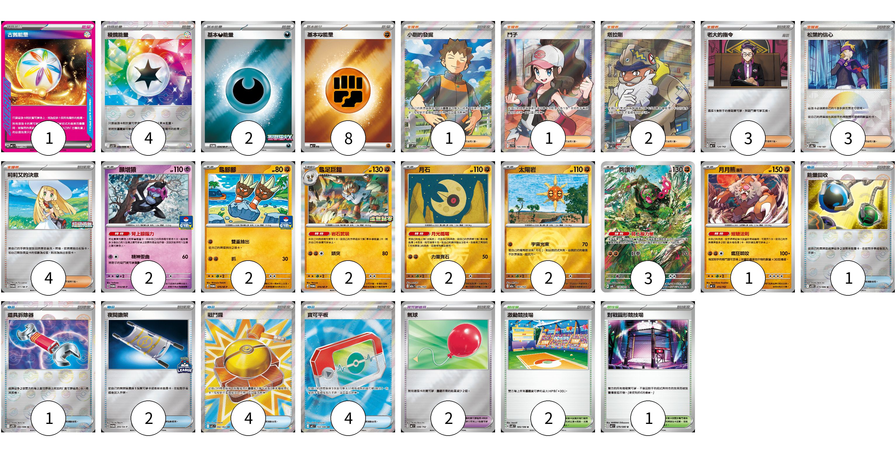 牌組構築方案 以此牌組為基礎新構築牌組 顯示卡面 顯示列表 寶可夢卡(14) 2 2 2 2 2 3 1 寶可夢道具(2) 2 物品卡(12) 1 1 2 4 4 支援者卡(14) 1 1 2 3 3 4 競技場卡(3) 2 1 能量卡(15) 1 4 2 8 寶可夢卡(14) 卡牌名稱 張數 卡牌名稱 張數 願增猿 M-P 014/M-P 02 龜腳腳 M-P 079/M-P 02 龜足巨鎧 M-P 074/M-P 02 月石 M2a 086/193 02 太陽岩 M2a 087/193 02 夠讚狗 SV6 110/101 03 月月熊 赫月 MC 415/742 01 寶可夢道具(2) 卡牌名稱 張數 卡牌名稱 張數 氣球 MC 688/742 02 物品卡(12) 卡牌名稱 張數 卡牌名稱 張數 能量回收 SV11W 079/086 01 道具拆除器 SV11W 080/086 01 夜間擔架 SV-P 204/SV-P 02 戰鬥鑼 M1L 082/063 04 寶可平板 M3 103/080 04 支援者卡(14) 卡牌名稱 張數 卡牌名稱 張數 小剛的發掘 SV9 123/100 01 鬥子 SV11W 166/086 01 塔拉剛 M3 105/080 02 老大的指令 MC 724/742 03 松葉的信心 SV8a 178/187 03 莉莉艾的決意 M-P 011/M-P 04 競技場卡(3) 卡牌名稱 張數 卡牌名稱 張數 激動競技場 SV8 105/106 02 對戰圓形競技場 M2 079/080 01 能量卡(15) 卡牌名稱 張數 卡牌名稱 張數 古舊能量 MC 741/742 01 稜鏡能量 SV11B 086/086 04 基本【惡】能量 M-P 034/M-P 02 基本【鬥】能量 MC FIG 08 以此牌組為基礎新構築牌組 牌組編碼 hnPRbc-jhbsBO-UATiHL copy 列印牌組單 牌組編碼已複製 分享至SNS