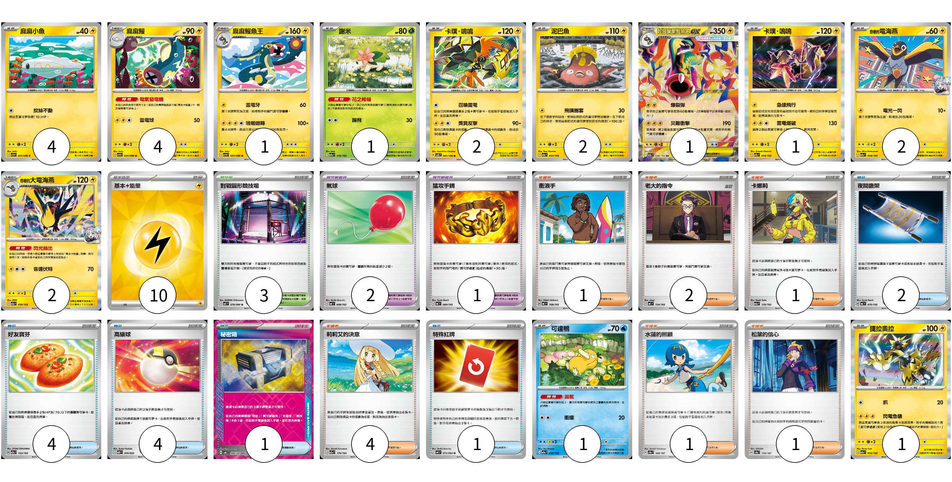 牌組構築方案 以此牌組為基礎新構築牌組 顯示卡面 顯示列表 寶可夢卡(22) 4 4 1 1 2 2 1 1 2 2 1 1 寶可夢道具(3) 2 1 物品卡(12) 2 4 4 1 1 支援者卡(10) 1 2 1 4 1 1 競技場卡(3) 3 能量卡(10) 10 寶可夢卡(22) 卡牌名稱 張數 卡牌名稱 張數 麻麻小魚 SV11B 033/086 04 麻麻鰻 SV11B 034/086 04 麻麻鰻魚王 SV11B 035/086 01 謝米 M2a 012/193 01 卡璞・鳴鳴 SV8 041/106 02 泥巴魚 M2a 050/193 02 超級麻麻鰻魚王ex M2a 049/193 01 卡璞・鳴鳴 M2a 054/193 01 奇樹的電海燕 M2a 058/193 02 奇樹的大電海燕 M2a 059/193 02 可達鴨 M2a 032/193 01 捷拉奧拉 M2a 055/193 01 寶可夢道具(3) 卡牌名稱 張數 卡牌名稱 張數 氣球 MC 688/742 02 猛攻手鐲 MC 689/742 01 物品卡(12) 卡牌名稱 張數 卡牌名稱 張數 夜間擔架 MC 670/742 02 好友寶芬 M2a 153/193 04 高級球 MBD 014/022 04 秘密箱 SV6 092/101 01 特殊紅牌 M4 072/083 01 支援者卡(10) 卡牌名稱 張數 卡牌名稱 張數 衝浪手 MC 708/742 01 老大的指令 MC 724/742 02 卡娜莉 M2a 170/193 01 莉莉艾的決意 M2a 175/193 04 水蓮的照顧 SV8a 168/187 01 松葉的信心 SV8a 178/187 01 競技場卡(3) 卡牌名稱 張數 卡牌名稱 張數 對戰圓形競技場 M2 079/080 03 能量卡(10) 卡牌名稱 張數 卡牌名稱 張數 基本【雷】能量 SVQP LIG 10 以此牌組為基礎新構築牌組 牌組編碼 hoGdoM-vJOfrC-SeJJmw copy 列印牌組單 牌組編碼已複製 分享至SNS