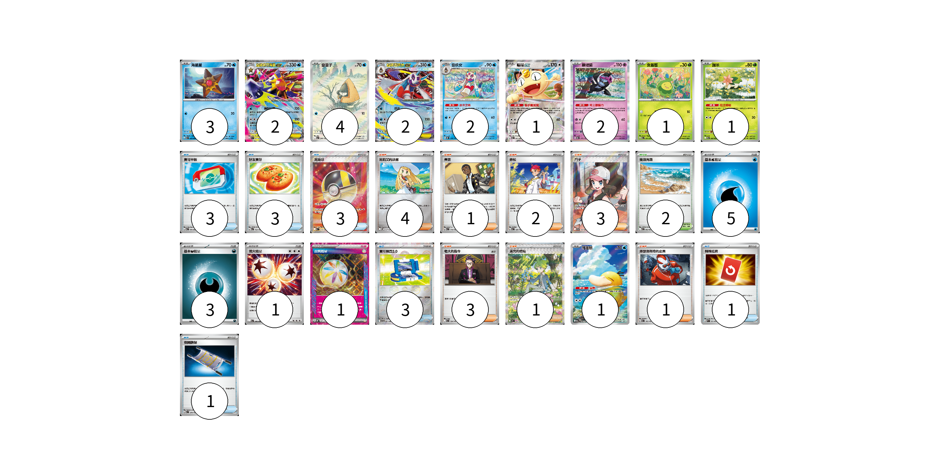 牌組構築方案 以此牌組為基礎新構築牌組 顯示卡面 顯示列表 寶可夢卡(19) 3 2 4 2 2 1 2 1 1 1 物品卡(14) 3 3 3 3 1 1 支援者卡(15) 4 1 2 3 3 1 1 競技場卡(2) 2 能量卡(10) 5 3 1 1 寶可夢卡(19) 卡牌名稱 張數 卡牌名稱 張數 海星星 M3 020/080 03 超級寶石海星ex M3 021/080 02 雪童子 M2a 200/193 04 超級雪妖女ex M2a 036/193 02 雪妖女 SV8a 038/187 02 喵喵ex M3 061/080 01 願增猿 SV8a 075/187 02 含羞苞 M2a 011/193 01 謝米 SV9a 006/063 01 可達鴨 M2a 199/193 01 物品卡(14) 卡牌名稱 張數 卡牌名稱 張數 寶可平板 M3 070/080 03 好友寶芬 M2a 153/193 03 高級球 M2a 216/193 03 寶可裝置3.0 SV11B 081/086 03 特殊紅牌 M4 072/083 01 夜間擔架 MC 670/742 01 支援者卡(15) 卡牌名稱 張數 卡牌名稱 張數 莉莉艾的決意 M-P 011/M-P 04 賽吉 MC 714/742 01 赤松 MC 696/742 02 鬥子 SV11W 166/086 03 老大的指令 MC 724/742 03 滿充的體貼 M1S 091/063 01 庫瑟洛斯奇的企圖 MC 705/742 01 競技場卡(2) 卡牌名稱 張數 卡牌名稱 張數 衝浪海灘 M1S 062/063 02 能量卡(10) 卡牌名稱 張數 卡牌名稱 張數 基本【水】能量 MC WAT 05 基本【惡】能量 MC DAR 03 燃火能量 M2a 191/193 01 古舊能量 SV8a 187/187 01 以此牌組為基礎新構築牌組 牌組編碼 htEUhl-BcRuOO-wSqgBm copy 列印牌組單 牌組編碼已複製 分享至SNS