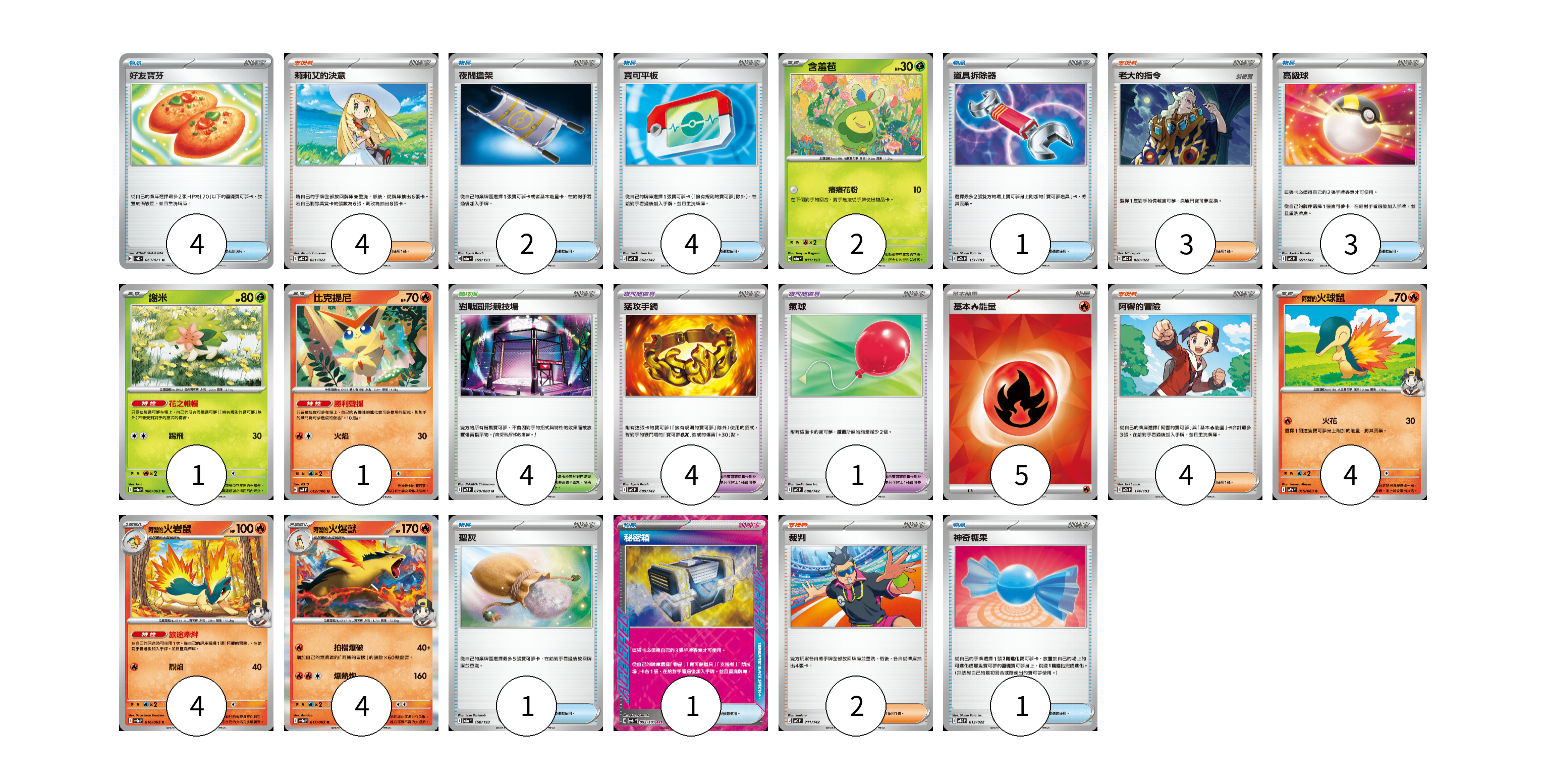 牌組構築方案 以此牌組為基礎新構築牌組 顯示卡面 顯示列表 寶可夢卡(16) 2 1 1 4 4 4 寶可夢道具(5) 4 1 物品卡(17) 4 2 4 1 3 1 1 1 支援者卡(13) 4 3 4 2 競技場卡(4) 4 能量卡(5) 5 寶可夢卡(16) 卡牌名稱 張數 卡牌名稱 張數 含羞苞 M2a 011/193 02 謝米 SV9a 006/063 01 比克提尼 SV8 012/106 01 <阿響的>火球鼠 SV9a 015/063 04 <阿響的>火岩鼠 SV9a 016/063 04 <阿響的>火爆獸 SV9a 017/063 04 寶可夢道具(5) 卡牌名稱 張數 卡牌名稱 張數 猛攻手鐲 MC 689/742 04 氣球 MC 688/742 01 物品卡(17) 卡牌名稱 張數 卡牌名稱 張數 好友寶芬 SV5K 063/071 04 夜間擔架 M2a 159/193 02 寶可平板 MC 662/742 04 道具拆除器 M2a 151/193 01 高級球 MC 651/742 03 聖灰 M2a 150/193 01 秘密箱 SV6 092/101 01 神奇糖果 MBG 013/022 01 支援者卡(13) 卡牌名稱 張數 卡牌名稱 張數 莉莉艾的決意 MBD 021/022 04 老大的指令 MBD 020/022 03 阿響的冒險 M2a 174/193 04 裁判 MC 711/742 02 競技場卡(4) 卡牌名稱 張數 卡牌名稱 張數 對戰圓形競技場 M2 079/080 04 能量卡(5) 卡牌名稱 張數 卡牌名稱 張數 基本【火】能量 SVK FIR 05 以此牌組為基礎新構築牌組 牌組編碼 hvINCq-eZreFh-MfYOtQ copy 列印牌組單 牌組編碼已複製 分享至SNS