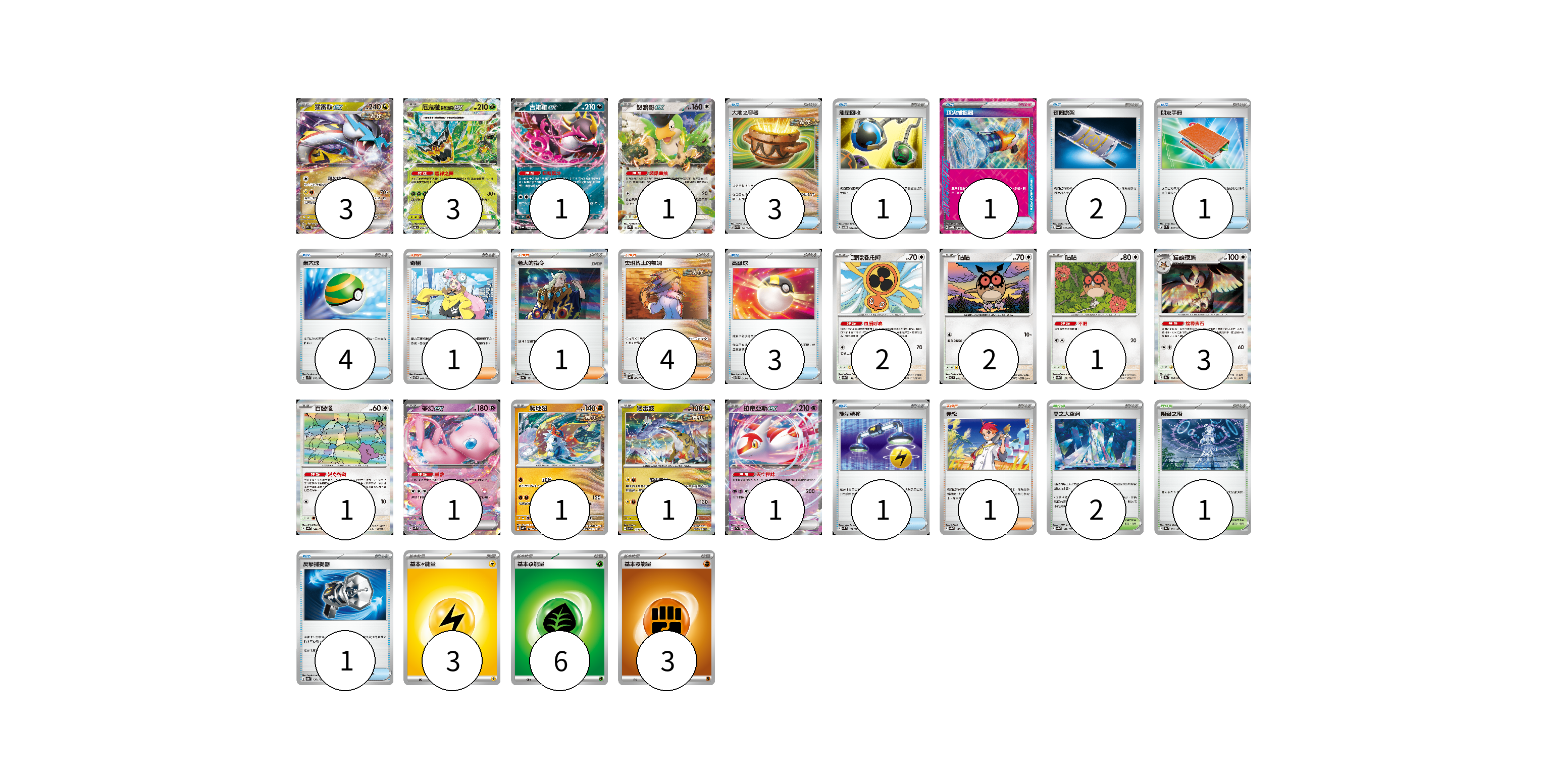 牌組構築方案 以此牌組為基礎新構築牌組 顯示卡面 顯示列表 寶可夢卡(21) 3 3 1 1 2 2 1 3 1 1 1 1 1 物品卡(17) 3 1 1 2 1 4 3 1 1 支援者卡(7) 1 1 4 1 競技場卡(3) 2 1 能量卡(12) 3 6 3 寶可夢卡(21) 卡牌名稱 張數 卡牌名稱 張數 猛雷鼓ex SV5K 053/071 03 厄鬼椪 碧草面具ex SV6 016/101 03 吉雉雞ex SV6a 038/064 01 怒鸚哥ex SV2P 065/071 01 旋轉洛托姆 SV8a 131/187 02 咕咕 SV7 076/102 02 咕咕 SV8a 127/187 01 貓頭夜鷹 SV8a 128/187 03 百變怪 SV4a 144/190 01 夢幻ex SVK 001/042 01 爬地翅 SV4K 041/066 01 猛雷鼓 SV7 075/102 01 拉帝亞斯ex SV7a 019/064 01 物品卡(17) 卡牌名稱 張數 卡牌名稱 張數 大地之容器 SVK 012/042 03 能量回收 SVTM 009/022 01 頂尖捕捉器 SV5M 062/071 01 夜間擔架 SV6a 056/064 02 朋友手冊 SV1S 069/078 01 巢穴球 SV1S 070/078 04 高級球 SVTG 013/019 03 能量轉移 SVM 127/175 01 反擊捕捉器 SV8a 139/187 01 支援者卡(7) 卡牌名稱 張數 卡牌名稱 張數 奇樹 SVTG 017/019 01 老大的指令 SV4a 181/190 01 奧琳博士的氣魄 SV4K 064/066 04 赤松 SV8a 163/187 01 競技場卡(3) 卡牌名稱 張數 卡牌名稱 張數 零之大空洞 SV8a 182/187 02 阻礙之塔 SV8a 181/187 01 能量卡(12) 卡牌名稱 張數 卡牌名稱 張數 基本【雷】能量 SVF LIG 03 基本【草】能量 SVF GRA 06 基本【鬥】能量 SVF FIG 03 以此牌組為基礎新構築牌組 牌組編碼 hyoqWU-KqyAYb-mjcpwP copy 列印牌組單 牌組編碼已複製 分享至SNS