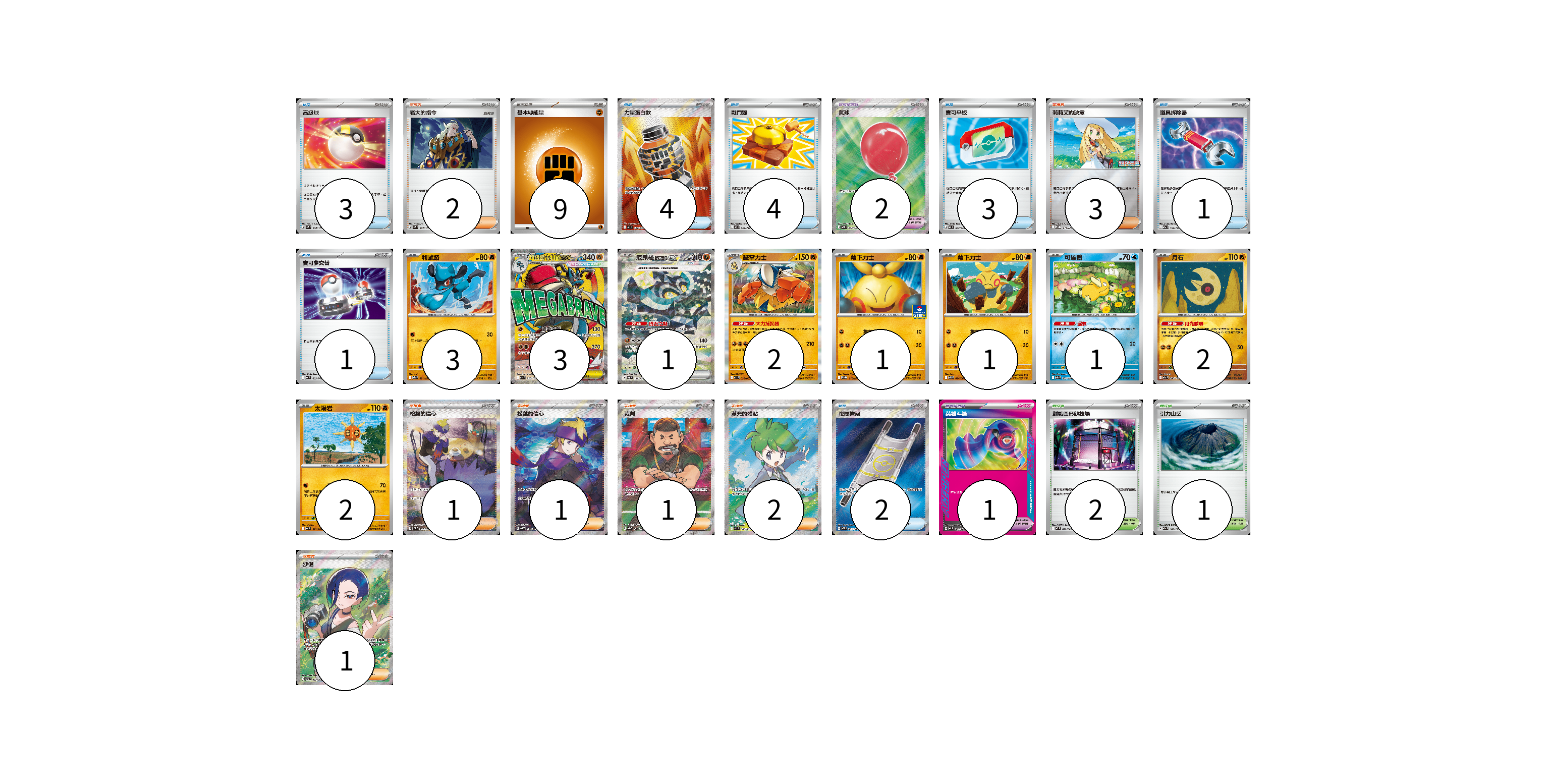 牌組構築方案 以此牌組為基礎新構築牌組 顯示卡面 顯示列表 寶可夢卡(16) 3 3 1 2 1 1 1 2 2 寶可夢道具(3) 2 1 物品卡(18) 3 4 4 3 1 1 2 支援者卡(11) 2 3 1 1 1 2 1 競技場卡(3) 2 1 能量卡(9) 9 寶可夢卡(16) 卡牌名稱 張數 卡牌名稱 張數 利歐路 M2a 091/193 03 超級路卡利歐ex M2a 228/193 03 厄鬼椪 礎石面具ex SV6 128/101 01 鐵掌力士 M1L 025/063 02 幕下力士 M-P 015/M-P 01 幕下力士 M1L 024/063 01 可達鴨 M2a 032/193 01 月石 M2a 086/193 02 太陽岩 MC 372/742 02 寶可夢道具(3) 卡牌名稱 張數 卡牌名稱 張數 氣球 M1L 084/063 02 英雄斗篷 MC 687/742 01 物品卡(18) 卡牌名稱 張數 卡牌名稱 張數 高級球 SVM 134/175 03 力量蛋白飲 M1L 081/063 04 戰鬥鑼 MC 654/742 04 寶可平板 MC 662/742 03 道具拆除器 M2a 151/193 01 寶可夢交替 MC 663/742 01 夜間擔架 M1L 083/063 02 支援者卡(11) 卡牌名稱 張數 卡牌名稱 張數 老大的指令 SVM 172/175 02 莉莉艾的決意 M-P 011/M-P 03 松葉的信心 SV5K 097/071 01 松葉的信心 SV5K 092/071 01 裁判 SV4a 342/190 01 滿充的體貼 M1S 085/063 02 沙儷 SV5a 087/066 01 競技場卡(3) 卡牌名稱 張數 卡牌名稱 張數 對戰圓形競技場 M2 079/080 02 引力山岳 M2a 183/193 01 能量卡(9) 卡牌名稱 張數 卡牌名稱 張數 基本【鬥】能量 MC FIG 09 以此牌組為基礎新構築牌組 牌組編碼 iAcDFU-Anopom-QYlrcX copy 列印牌組單 牌組編碼已複製 分享至SNS