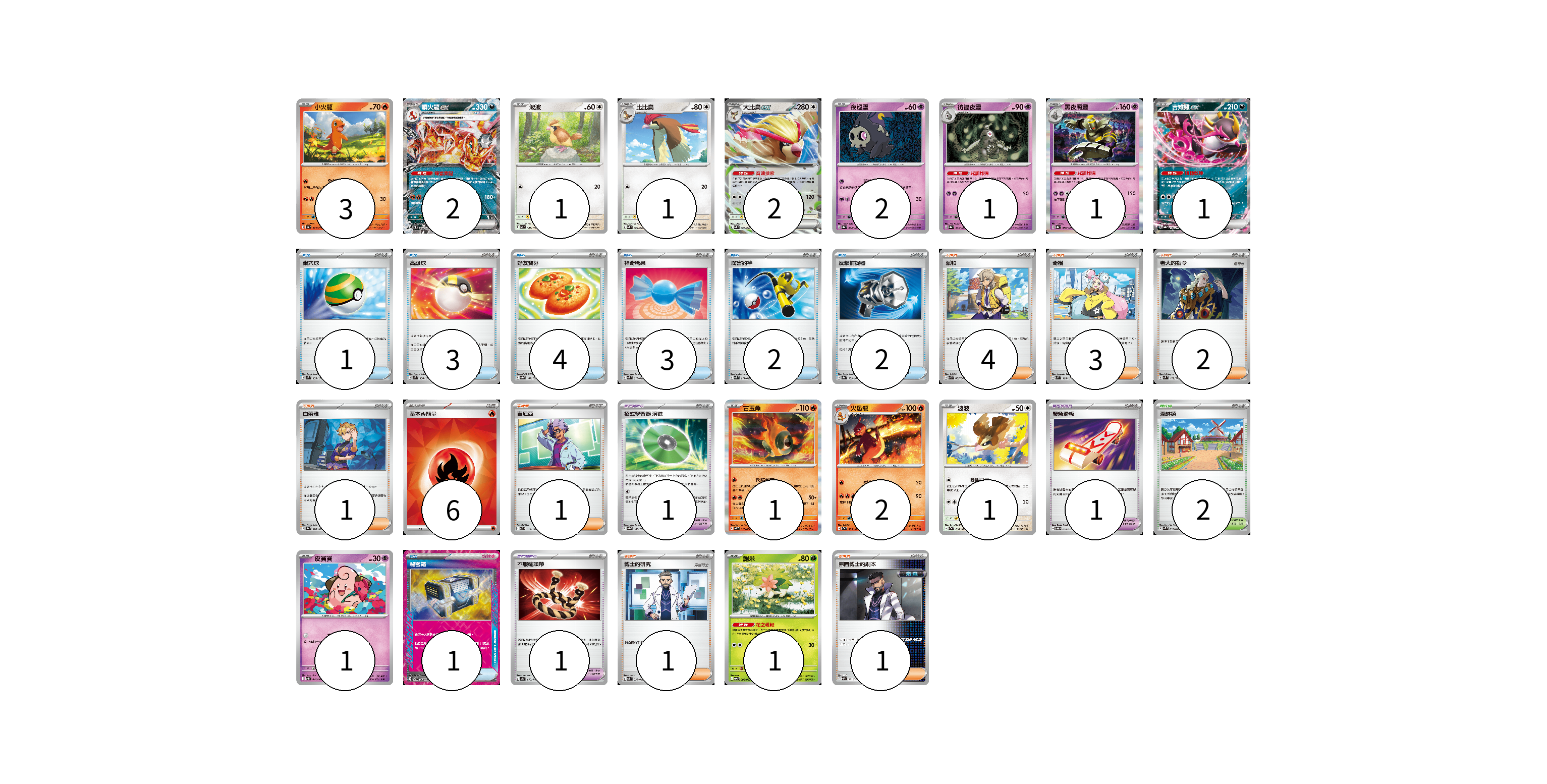 牌組構築方案 以此牌組為基礎新構築牌組 顯示卡面 顯示列表 寶可夢卡(20) 3 2 1 1 2 2 1 1 1 1 2 1 1 1 寶可夢道具(3) 1 1 1 物品卡(16) 1 3 4 3 2 2 1 支援者卡(13) 4 3 2 1 1 1 1 競技場卡(2) 2 能量卡(6) 6 寶可夢卡(20) 卡牌名稱 張數 卡牌名稱 張數 小火龍 SV4a 025/190 03 噴火龍ex SVTL 006/021 02 波波 SV3 087/108 01 比比鳥 SVK 004/042 01 大比鳥ex SVK 005/042 02 夜巡靈 SV8a 064/187 02 彷徨夜靈 SV8a 065/187 01 黑夜魔靈 SV8a 066/187 01 吉雉雞ex SV8a 104/187 01 古玉魚 SV4K 016/066 01 火恐龍 SV2a 005/165 02 波波 SV2a 016/165 01 皮寶寶 SV3 042/108 01 謝米 SV9a 006/063 01 寶可夢道具(3) 卡牌名稱 張數 卡牌名稱 張數 招式學習器 演進 SV8a 160/187 01 緊急滑板 SVOD 015/020 01 不服輸頭帶 SV1S 073/078 01 物品卡(16) 卡牌名稱 張數 卡牌名稱 張數 巢穴球 SVM 133/175 01 高級球 SVM 134/175 03 好友寶芬 SV8a 147/187 04 神奇糖果 SVK 019/042 03 厲害釣竿 SVK 011/042 02 反擊捕捉器 SV8a 139/187 02 秘密箱 SV6 092/101 01 支援者卡(13) 卡牌名稱 張數 卡牌名稱 張數 派帕 SVK 035/042 04 奇樹 SVM 160/175 03 老大的指令 SVM 172/175 02 白蕾雅 SV8a 176/187 01 吉尼亞 SVD 129/139 01 博士的研究 SVK 033/042 01 弗圖博士的劇本 SVHM 021/022 01 競技場卡(2) 卡牌名稱 張數 卡牌名稱 張數 深缽鎮 SVK 039/042 02 能量卡(6) 卡牌名稱 張數 卡牌名稱 張數 基本【火】能量 SVK FIR 06 以此牌組為基礎新構築牌組 牌組編碼 iAdgvE-fIVEMn-EuZNBB copy 列印牌組單 牌組編碼已複製 分享至SNS