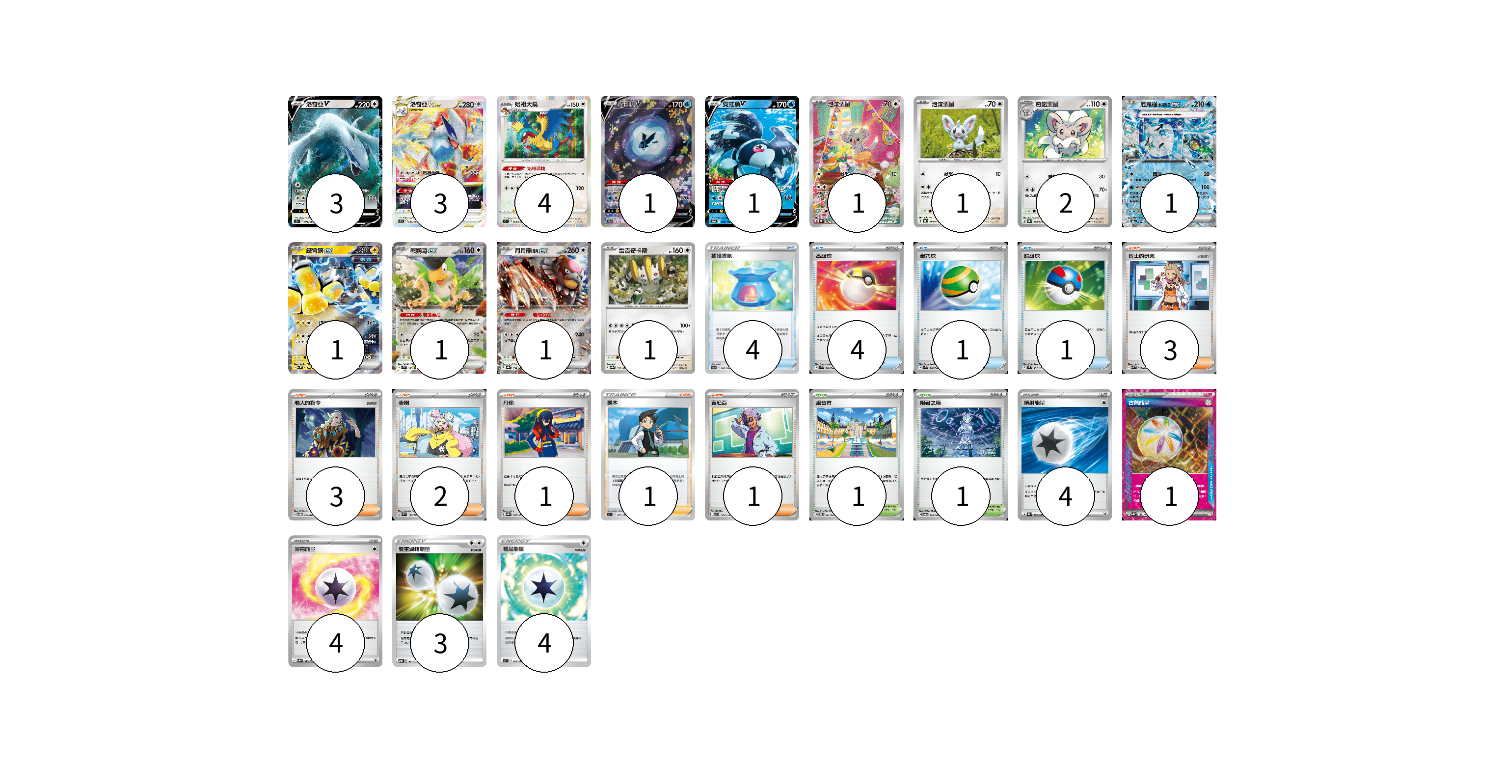 牌組構築方案 以此牌組為基礎新構築牌組 顯示卡面 顯示列表 寶可夢卡(21) 3 3 4 1 1 1 1 2 1 1 1 1 1 物品卡(10) 4 4 1 1 支援者卡(11) 3 3 2 1 1 1 競技場卡(2) 1 1 能量卡(16) 4 1 4 3 4 寶可夢卡(21) 卡牌名稱 張數 卡牌名稱 張數 洛奇亞V S12 079/098 03 洛奇亞VSTAR S12 080/098 03 始祖大鳥 S12 083/098 04 霓虹魚V S12a 216/172 01 霓虹魚V S12a 026/172 01 泡沫栗鼠 SV5K 082/071 01 泡沫栗鼠 SV5K 059/071 01 奇諾栗鼠 SV5K 060/071 02 厄鬼椪 水井面具ex SV6 038/101 01 鐵臂膀ex SV4M 027/066 01 怒鸚哥ex SV2P 065/071 01 月月熊 赫月ex SV8a 134/187 01 雷吉奇卡斯 SV8a 132/187 01 物品卡(10) 卡牌名稱 張數 卡牌名稱 張數 捕獲香氛 S11a 060/068 04 高級球 SVK 018/042 04 巢穴球 SVK 016/042 01 超級球 SVM 132/175 01 支援者卡(11) 卡牌名稱 張數 卡牌名稱 張數 博士的研究 SVK 032/042 03 老大的指令 SVTM 020/022 03 奇樹 SVM 160/175 02 丹瑜 SV8a 170/187 01 捩木 S11 097/100 01 吉尼亞 SVD 129/139 01 競技場卡(2) 卡牌名稱 張數 卡牌名稱 張數 桌台市 SVTM 021/022 01 阻礙之塔 SV6 100/101 01 能量卡(16) 卡牌名稱 張數 卡牌名稱 張數 噴射能量 SV8a 185/187 04 古舊能量 SV8a 187/187 01 薄霧能量 SV8a 186/187 04 雙重渦輪能量 SVTR 021/021 03 禮品能量 S11 100/100 04 以此牌組為基礎新構築牌組 牌組編碼 iAdjmw-aZrpyx-ttGcsE copy 列印牌組單 牌組編碼已複製 分享至SNS