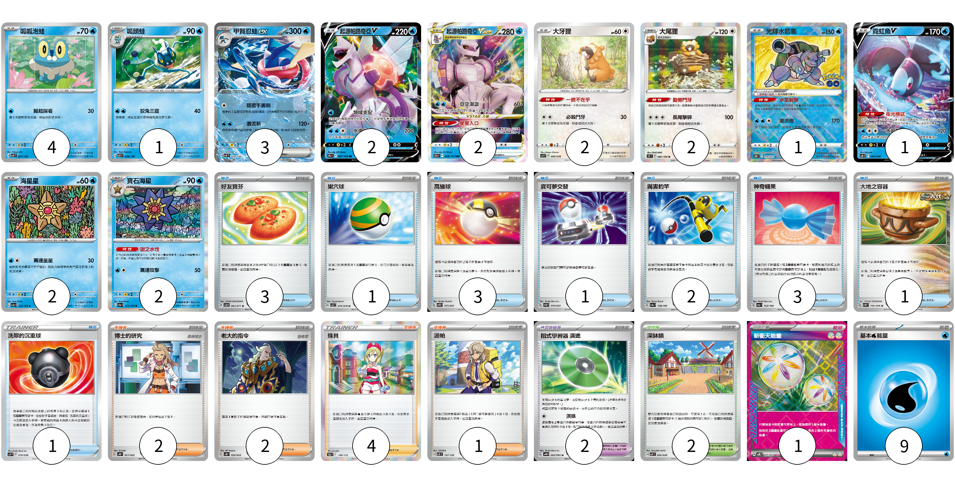 牌組構築方案 以此牌組為基礎新構築牌組 顯示卡面 顯示列表 寶可夢卡(22) 4 1 3 2 2 2 2 1 1 2 2 寶可夢道具(2) 2 物品卡(15) 3 1 3 1 2 3 1 1 支援者卡(9) 2 2 4 1 競技場卡(2) 2 能量卡(10) 1 9 寶可夢卡(22) 卡牌名稱 張數 卡牌名稱 張數 呱呱泡蛙 SVD 027/139 04 呱頭蛙 SVD 028/139 01 甲賀忍蛙ex SVD 029/139 03 起源帕路奇亞V S12a 027/172 02 起源帕路奇亞VSTAR S12a 028/172 02 大牙狸 SVF 008/038 02 大尾狸 S9 082/100 02 光輝水箭龜 S10b 018/071 01 霓虹魚V SVB 008/028 01 海星星 SV2a 120/165 02 寶石海星 SV2a 121/165 02 寶可夢道具(2) 卡牌名稱 張數 卡牌名稱 張數 招式學習器 演進 SV4M 063/066 02 物品卡(15) 卡牌名稱 張數 卡牌名稱 張數 好友寶芬 SV5K 063/071 03 巢穴球 SV1S 070/078 01 高級球 SVHM 013/022 03 寶可夢交替 SVHM 014/022 01 厲害釣竿 SV4a 158/190 02 神奇糖果 SV4a 163/190 03 大地之容器 SV4K 060/066 01 洗翠的沉重球 SVF 019/038 01 支援者卡(9) 卡牌名稱 張數 卡牌名稱 張數 博士的研究 SVHK 021/022 02 老大的指令 SVHK 022/022 02 珠貝 S12a 149/172 04 派帕 SVD 137/139 01 競技場卡(2) 卡牌名稱 張數 卡牌名稱 張數 深缽鎮 SVF 036/038 02 能量卡(10) 卡牌名稱 張數 卡牌名稱 張數 新衝天能量 SV5K 071/071 01 基本【水】能量 SVAW WAT 09 以此牌組為基礎新構築牌組 牌組編碼 iDXusA-NnMpTz-pvRbuh copy 列印牌組單 牌組編碼已複製 分享至SNS