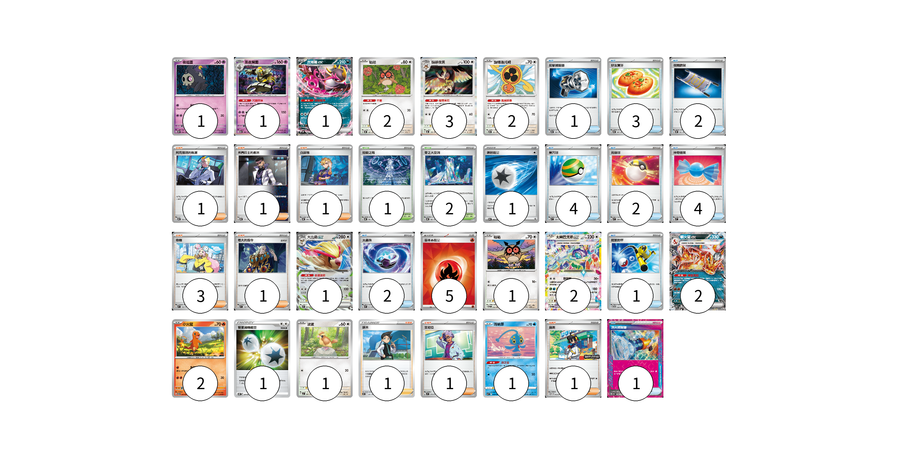 牌組構築方案 以此牌組為基礎新構築牌組 顯示卡面 顯示列表 寶可夢卡(20) 1 1 1 2 3 2 1 1 2 2 2 1 1 物品卡(20) 1 3 2 4 2 4 2 1 1 支援者卡(10) 1 1 1 3 1 1 1 1 競技場卡(3) 1 2 能量卡(7) 1 5 1 寶可夢卡(20) 卡牌名稱 張數 卡牌名稱 張數 夜巡靈 SV8a 064/187 01 黑夜魔靈 SV8a 066/187 01 吉雉雞ex SV8a 104/187 01 咕咕 SV8a 127/187 02 貓頭夜鷹 SV8a 128/187 03 旋轉洛托姆 SV8a 131/187 02 大比鳥ex SVK 005/042 01 咕咕 SV7 076/102 01 太樂巴戈斯ex SV7 088/102 02 噴火龍ex SVTL 006/021 02 小火龍 SVTL 001/021 02 波波 SV3 087/108 01 瑪納霏 SVF 003/038 01 物品卡(20) 卡牌名稱 張數 卡牌名稱 張數 反擊捕捉器 SV8a 139/187 01 好友寶芬 SV8a 147/187 03 夜間擔架 SV8a 151/187 02 巢穴球 SVM 133/175 04 高級球 SVM 134/175 02 神奇糖果 SVM 135/175 04 太晶珠 SVK 013/042 02 厲害釣竿 SVTG 009/019 01 頂尖捕捉器 SV8a 148/187 01 支援者卡(10) 卡牌名稱 張數 卡牌名稱 張數 阿克羅瑪的執著 SV8a 164/187 01 弗圖博士的劇本 SV8a 175/187 01 白蕾雅 SV8a 176/187 01 奇樹 SVM 160/175 03 老大的指令 SVM 172/175 01 捩木 S11 097/100 01 吉尼亞 SV1S 074/078 01 烏栗 SV-P 142/SV-P 01 競技場卡(3) 卡牌名稱 張數 卡牌名稱 張數 阻礙之塔 SV8a 181/187 01 零之大空洞 SV8a 182/187 02 能量卡(7) 卡牌名稱 張數 卡牌名稱 張數 噴射能量 SV8a 185/187 01 基本【火】能量 SVK FIR 05 雙重渦輪能量 SVTR 021/021 01 以此牌組為基礎新構築牌組 牌組編碼 iGFJNx-KffqCQ-sAnGLp copy 列印牌組單 牌組編碼已複製 分享至SNS