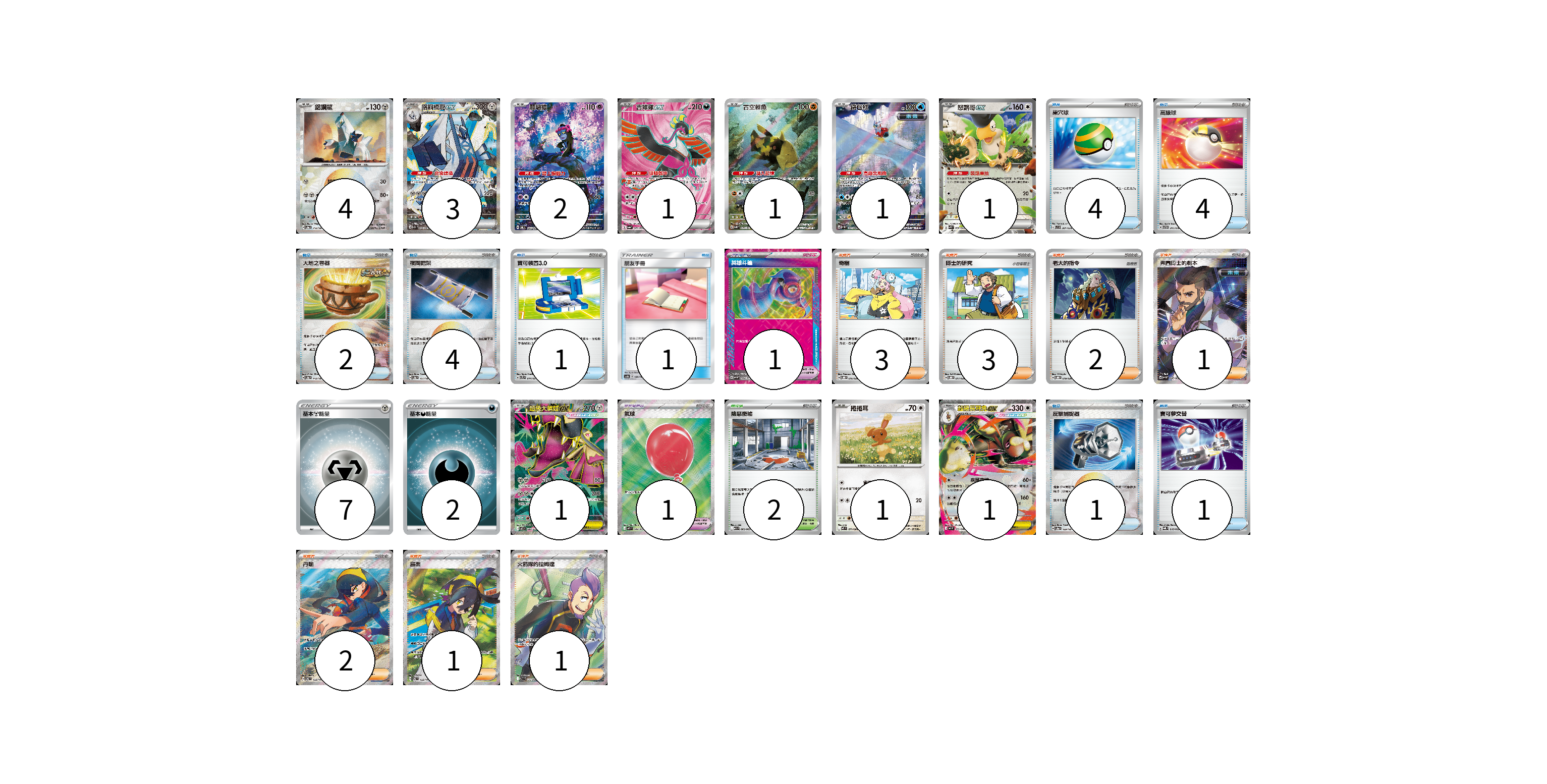 牌組構築方案 以此牌組為基礎新構築牌組 顯示卡面 顯示列表 寶可夢卡(16) 4 3 2 1 1 1 1 1 1 1 寶可夢道具(2) 1 1 物品卡(18) 4 4 2 4 1 1 1 1 支援者卡(13) 3 3 2 1 2 1 1 競技場卡(2) 2 能量卡(9) 7 2 寶可夢卡(16) 卡牌名稱 張數 卡牌名稱 張數 鋁鋼龍 SV8a 112/187 04 鋁鋼橋龍ex SV7a 088/064 03 願增猿 SV6 107/101 02 吉雉雞ex SV6a 081/064 01 古空棘魚 SV5K 077/071 01 鐵包袱 SV4M 071/066 01 怒鸚哥ex SVK 006/042 01 超級大嘴娃ex M1L 080/063 01 捲捲耳 M2 071/080 01 超級長耳兔ex M2 072/080 01 寶可夢道具(2) 卡牌名稱 張數 卡牌名稱 張數 英雄斗篷 SV5M 064/071 01 氣球 M1L 084/063 01 物品卡(18) 卡牌名稱 張數 卡牌名稱 張數 巢穴球 SVB 001/028 04 高級球 SVTH 011/018 04 大地之容器 SV8a 143/187 02 夜間擔架 SV8a 151/187 04 寶可裝置3.0 SVTL 014/021 01 朋友手冊 AS6b 188/194 01 反擊捕捉器 SV8a 139/187 01 寶可夢交替 SVQL 016/022 01 支援者卡(13) 卡牌名稱 張數 卡牌名稱 張數 奇樹 SVOD 016/020 03 博士的研究 SVOD 017/020 03 老大的指令 SVOD 019/020 02 弗圖博士的劇本 SV4M 086/066 01 丹瑜 SV6 123/101 02 烏栗 SV6 122/101 01 火箭隊的拉姆達 SV10 122/098 01 競技場卡(2) 卡牌名稱 張數 卡牌名稱 張數 險惡廢墟 M1L 063/063 02 能量卡(9) 卡牌名稱 張數 卡牌名稱 張數 基本【鋼】能量 SI MET 07 基本【惡】能量 SI DAR 02 以此牌組為基礎新構築牌組 牌組編碼 iJNhrF-QEIzgy-ckSSFo copy 列印牌組單 牌組編碼已複製 分享至SNS