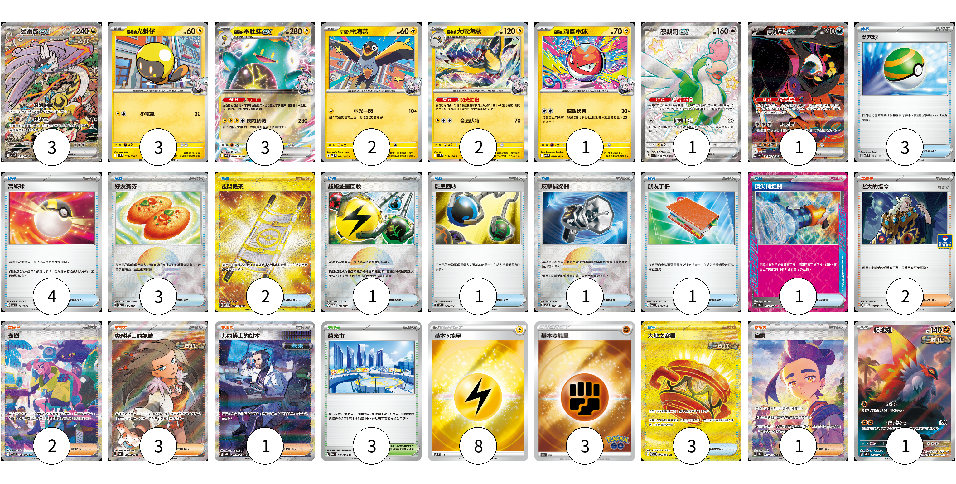牌組構築方案 以此牌組為基礎新構築牌組 顯示卡面 顯示列表 寶可夢卡(17) 3 3 3 2 2 1 1 1 1 物品卡(20) 3 4 3 2 1 1 1 1 1 3 支援者卡(9) 2 2 3 1 1 競技場卡(3) 3 能量卡(11) 8 3 寶可夢卡(17) 卡牌名稱 張數 卡牌名稱 張數 猛雷鼓ex SV8a 222/187 03 奇樹的光蚪仔 SV9 029/100 03 奇樹的電肚蛙ex SV9 030/100 03 奇樹的電海燕 SV9 031/100 02 奇樹的大電海燕 SV9 032/100 02 奇樹的霹靂電球 SV9 026/100 01 怒鸚哥ex SV4a 337/190 01 吉雉雞ex SV6a 089/064 01 爬地翅 SV4K 074/066 01 物品卡(20) 卡牌名稱 張數 卡牌名稱 張數 巢穴球 SVM 133/175 03 高級球 SVM 134/175 04 好友寶芬 SV8a 147/187 03 夜間擔架 SV8 137/106 02 超級能量回收 SV8a 141/187 01 能量回收 SVM 125/175 01 反擊捕捉器 SV8a 139/187 01 朋友手冊 SVK 014/042 01 頂尖捕捉器 SV8a 148/187 01 大地之容器 SV6a 093/064 03 支援者卡(9) 卡牌名稱 張數 卡牌名稱 張數 老大的指令 SV-P 178/SV-P 02 奇樹 SV4a 350/190 02 奧琳博士的氣魄 SV4K 085/066 03 弗圖博士的劇本 SV4M 091/066 01 烏栗 SV8a 230/187 01 競技場卡(3) 卡牌名稱 張數 卡牌名稱 張數 釀光市 SV9 098/100 03 能量卡(11) 卡牌名稱 張數 卡牌名稱 張數 基本【雷】能量 SO LIG 08 基本鬥能量 S10b FIG 03 以此牌組為基礎新構築牌組 牌組編碼 iJcYdK-VYkfAM-DLJWuO copy 列印牌組單 牌組編碼已複製 分享至SNS