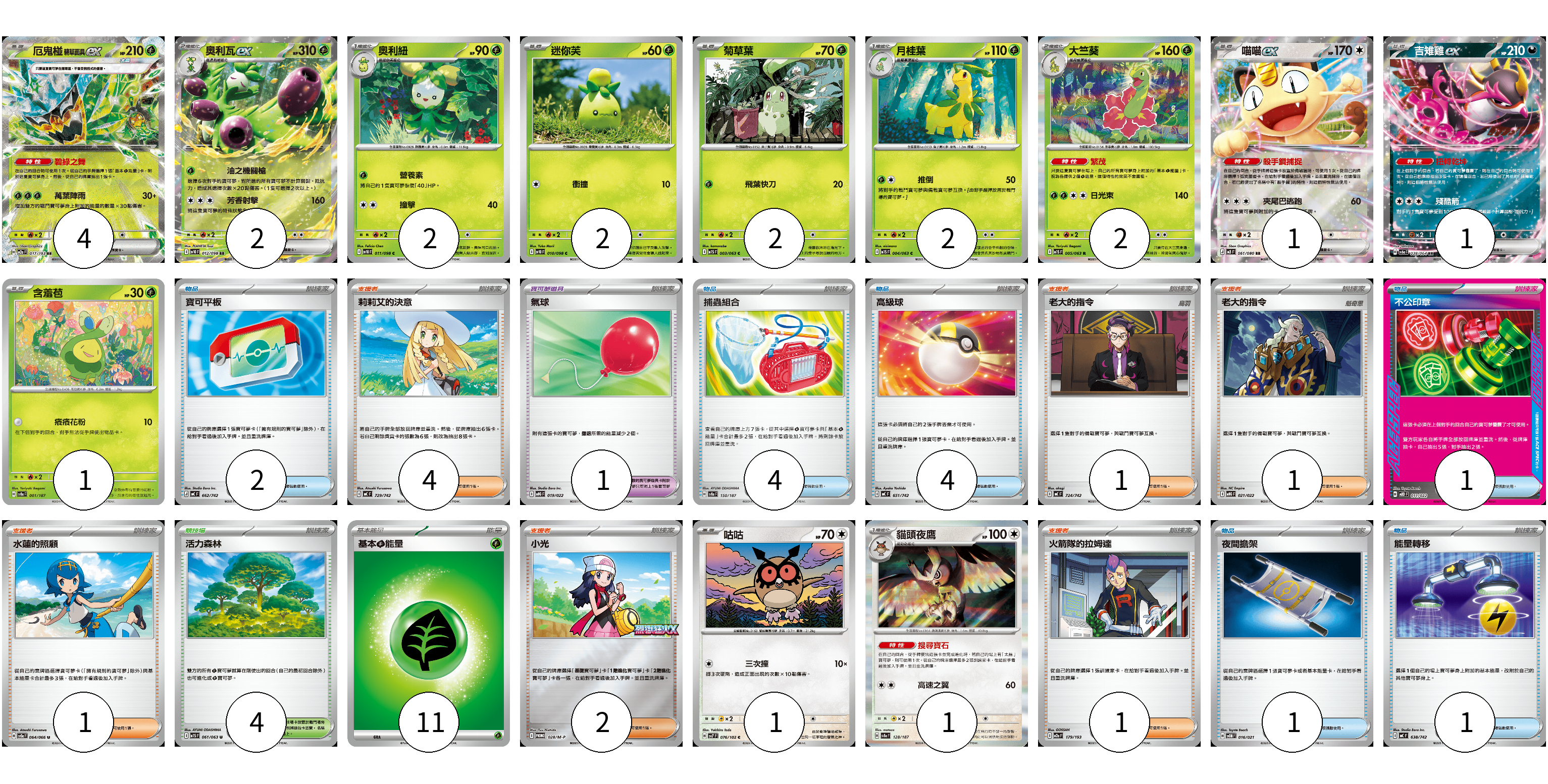 牌組構築方案 以此牌組為基礎新構築牌組 顯示卡面 顯示列表 寶可夢卡(21) 4 2 2 2 2 2 2 1 1 1 1 1 寶可夢道具(1) 1 物品卡(13) 2 4 4 1 1 1 支援者卡(10) 4 1 1 1 2 1 競技場卡(4) 4 能量卡(11) 11 寶可夢卡(21) 卡牌名稱 張數 卡牌名稱 張數 厄鬼椪 碧草面具ex M2a 017/193 04 奧利瓦ex SV10 012/098 02 奧利紐 SV10 011/098 02 迷你芙 SV10 010/098 02 菊草葉 M1S 003/063 02 月桂葉 M1S 004/063 02 大竺葵 M1S 005/063 02 喵喵ex M3 061/080 01 吉雉雞ex SV6a 038/064 01 含羞苞 SV8a 001/187 01 咕咕 SV7 076/102 01 貓頭夜鷹 SV8a 128/187 01 寶可夢道具(1) 卡牌名稱 張數 卡牌名稱 張數 氣球 MBG 019/022 01 物品卡(13) 卡牌名稱 張數 卡牌名稱 張數 寶可平板 MC 662/742 02 捕蟲組合 SV8a 150/187 04 高級球 MC 651/742 04 不公印章 MBD 011/022 01 夜間擔架 SVOM 016/021 01 能量轉移 MC 638/742 01 支援者卡(10) 卡牌名稱 張數 卡牌名稱 張數 莉莉艾的決意 MC 729/742 04 老大的指令 MC 724/742 01 老大的指令 MBG 021/022 01 水蓮的照顧 SV5a 064/066 01 小光 M-P 028/M-P 02 火箭隊的拉姆達 M2a 179/193 01 競技場卡(4) 卡牌名稱 張數 卡牌名稱 張數 活力森林 M1S 061/063 04 能量卡(11) 卡牌名稱 張數 卡牌名稱 張數 基本【草】能量 MJ GRA 11 以此牌組為基礎新構築牌組 牌組編碼 iJrWeJ-yjince-UyQzZH copy 列印牌組單 牌組編碼已複製 分享至SNS