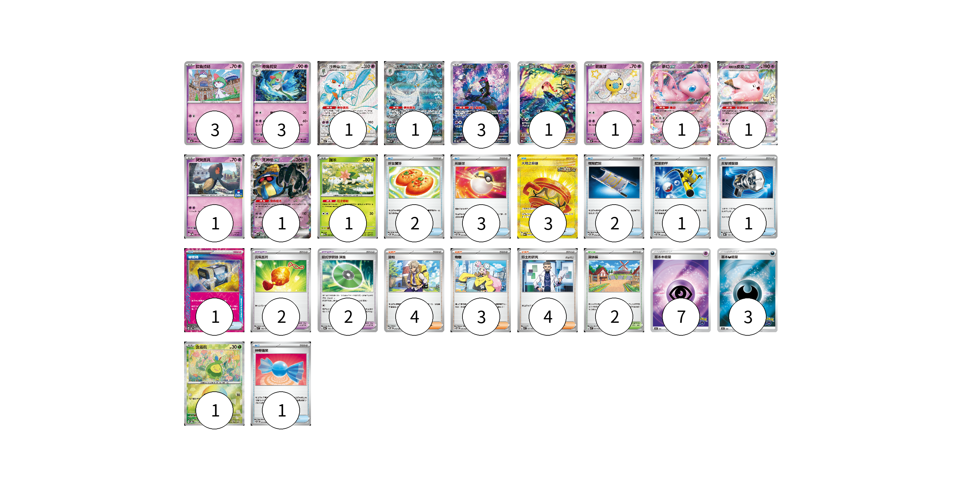 牌組構築方案 以此牌組為基礎新構築牌組 顯示卡面 顯示列表 寶可夢卡(19) 3 3 1 1 3 1 1 1 1 1 1 1 1 寶可夢道具(4) 2 2 物品卡(14) 2 3 3 2 1 1 1 1 支援者卡(11) 4 3 4 競技場卡(2) 2 能量卡(10) 7 3 寶可夢卡(19) 卡牌名稱 張數 卡牌名稱 張數 拉魯拉絲 SV4a 080/190 03 奇魯莉安 SV4a 081/190 03 沙奈朵ex SV4a 328/190 01 沙奈朵ex SV4a 348/190 01 願增猿 SV6 107/101 03 吼叫尾 SV4K 071/066 01 飄飄球 SV4a 260/190 01 夢幻ex SV2a 151/165 01 莉莉艾的皮皮ex SV9 033/100 01 哭哭面具 SV-P 061/SV-P 01 死神棺ex SV4K 031/066 01 謝米 SV9a 006/063 01 含羞苞 SV8a 001/187 01 寶可夢道具(4) 卡牌名稱 張數 卡牌名稱 張數 勇氣護符 SVM 142/175 02 招式學習器 演進 SV8a 160/187 02 物品卡(14) 卡牌名稱 張數 卡牌名稱 張數 好友寶芬 SVOD 011/020 02 高級球 SVOD 012/020 03 大地之容器 SV6a 093/064 03 夜間擔架 SVOM 016/021 02 厲害釣竿 SVOD 010/020 01 反擊捕捉器 SV8a 139/187 01 秘密箱 SV6 092/101 01 神奇糖果 SVOD 013/020 01 支援者卡(11) 卡牌名稱 張數 卡牌名稱 張數 派帕 SVOD 018/020 04 奇樹 SVOD 016/020 03 博士的研究 SVK 033/042 04 競技場卡(2) 卡牌名稱 張數 卡牌名稱 張數 深缽鎮 SVK 039/042 02 能量卡(10) 卡牌名稱 張數 卡牌名稱 張數 基本超能量 S10b PSY 07 基本惡能量 S10b DAR 03 以此牌組為基礎新構築牌組 牌組編碼 iLaAHA-BQSNGt-SjEEIf copy 列印牌組單 牌組編碼已複製 分享至SNS