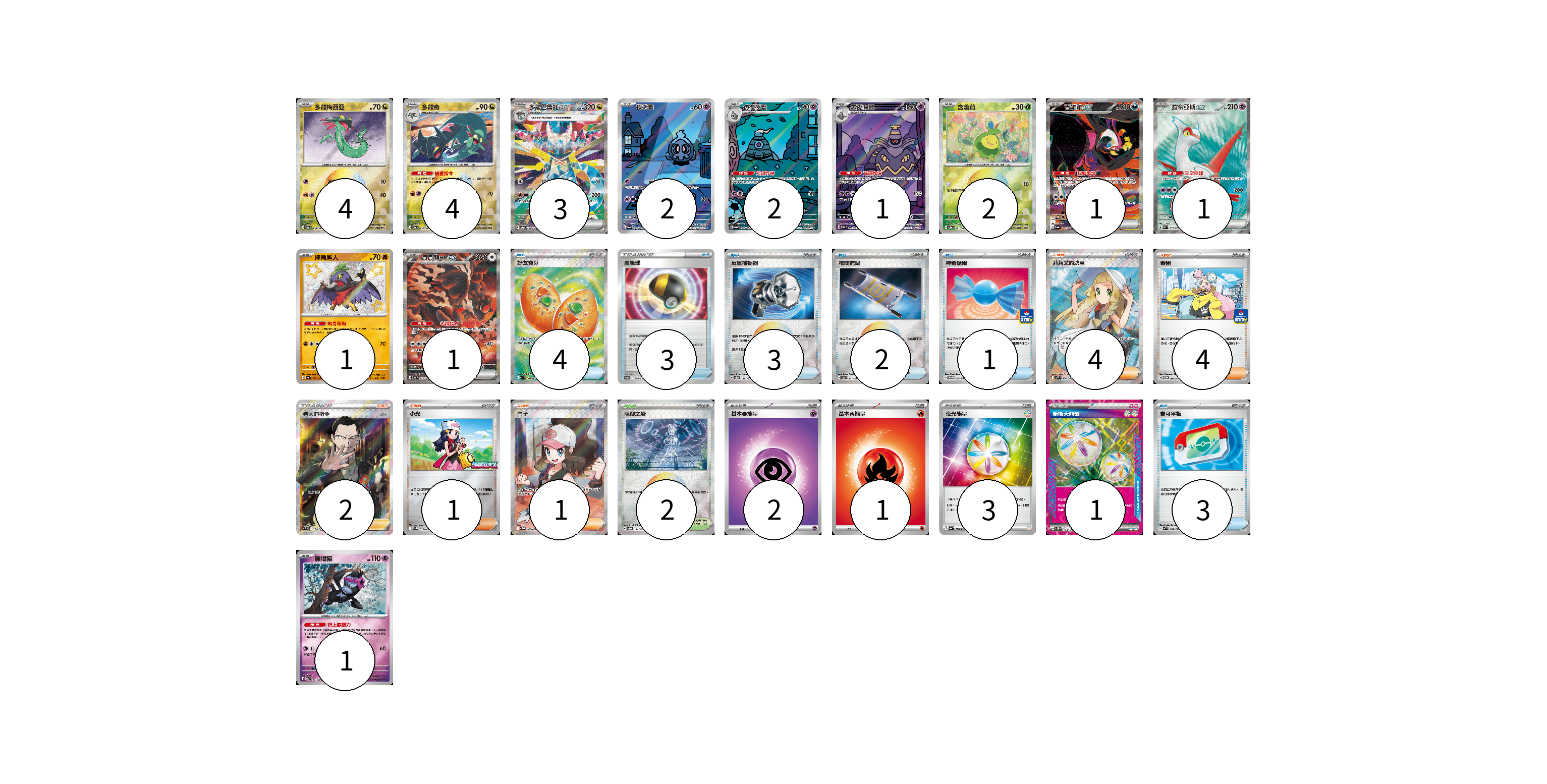 牌組構築方案 以此牌組為基礎新構築牌組 顯示卡面 顯示列表 寶可夢卡(23) 4 4 3 2 2 1 2 1 1 1 1 1 物品卡(16) 4 3 3 2 1 3 支援者卡(12) 4 4 2 1 1 競技場卡(2) 2 能量卡(7) 2 1 3 1 寶可夢卡(23) 卡牌名稱 張數 卡牌名稱 張數 多龍梅西亞 SV8a 118/187 04 多龍奇 SV8a 119/187 04 多龍巴魯托ex SV8a 221/187 03 夜巡靈 SV6a 068/064 02 彷徨夜靈 SV6a 069/064 02 黑夜魔靈 SV6a 070/064 01 含羞苞 SV8a 001/187 02 吉雉雞ex SV6a 089/064 01 拉帝亞斯ex SV7a 078/064 01 摔角鷹人 SV4a 282/190 01 月月熊 赫月ex SV8a 225/187 01 願增猿 M2a 081/193 01 物品卡(16) 卡牌名稱 張數 卡牌名稱 張數 好友寶芬 M1S 081/063 04 高級球 S-P 148/S-P 03 反擊捕捉器 SV8a 139/187 03 夜間擔架 SV8a 151/187 02 神奇糖果 SV-P 104/SV-P 01 寶可平板 MC 662/742 03 支援者卡(12) 卡牌名稱 張數 卡牌名稱 張數 莉莉艾的決意 M1L 086/063 04 奇樹 SV-P 106/SV-P 04 老大的指令(坂木) SC1b 170/153 02 小光 M-P 028/M-P 01 鬥子 SV11W 166/086 01 競技場卡(2) 卡牌名稱 張數 卡牌名稱 張數 阻礙之塔 SV8a 181/187 02 能量卡(7) 卡牌名稱 張數 卡牌名稱 張數 基本【超】能量 MBD PSY 02 基本【火】能量 M-P FIR 01 夜光能量 SV4a 190/190 03 新衝天能量 SV5K 071/071 01 以此牌組為基礎新構築牌組 牌組編碼 iLflxb-fKjahR-bcHykG copy 列印牌組單 牌組編碼已複製 分享至SNS