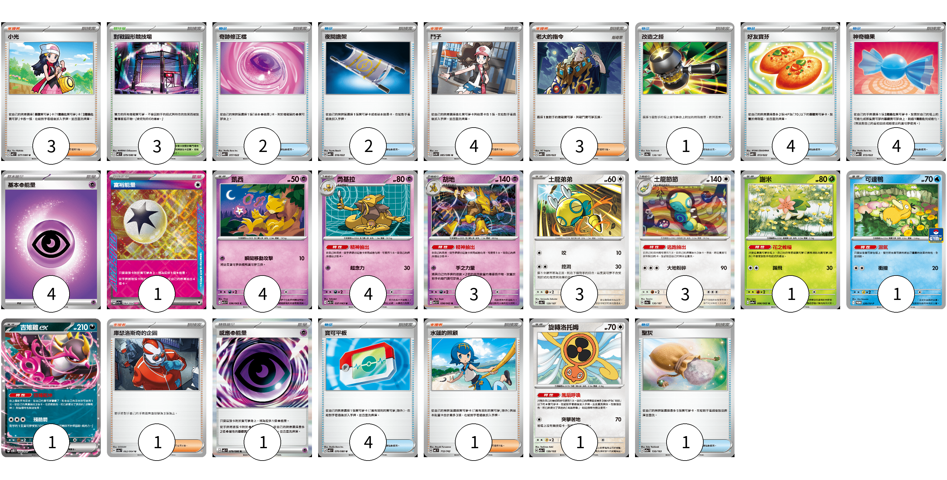 牌組構築方案 以此牌組為基礎新構築牌組 顯示卡面 顯示列表 寶可夢卡(21) 4 4 3 3 3 1 1 1 1 物品卡(18) 2 2 1 4 4 4 1 支援者卡(12) 3 4 3 1 1 競技場卡(3) 3 能量卡(6) 4 1 1 寶可夢卡(21) 卡牌名稱 張數 卡牌名稱 張數 凱西 M1S 036/063 04 勇基拉 M1S 037/063 04 胡地 M1S 038/063 03 土龍弟弟 SV8a 129/187 03 土龍節節 SV8a 130/187 03 謝米 SV9a 006/063 01 可達鴨 SV-P 220/SV-P 01 吉雉雞ex SVOD 004/020 01 旋轉洛托姆 M2a 139/193 01 物品卡(18) 卡牌名稱 張數 卡牌名稱 張數 奇跡修正檔 MBD 017/022 02 夜間擔架 MBD 016/022 02 改造之錘 SV8a 138/187 01 好友寶芬 MBD 013/022 04 神奇糖果 MBG 013/022 04 寶可平板 M3 070/080 04 聖灰 M2a 150/193 01 支援者卡(12) 卡牌名稱 張數 卡牌名稱 張數 小光 M2 077/080 03 鬥子 SV11W 085/086 04 老大的指令 MBD 020/022 03 庫瑟洛斯奇的企圖 SV6a 062/064 01 水蓮的照顧 MC 712/742 01 競技場卡(3) 卡牌名稱 張數 卡牌名稱 張數 對戰圓形競技場 M2 079/080 03 能量卡(6) 卡牌名稱 張數 卡牌名稱 張數 基本【超】能量 MBD PSY 04 富裕能量 SV7a 064/064 01 感應【超】能量 M3 079/080 01 以此牌組為基礎新構築牌組 牌組編碼 iNGvwT-uZGlQE-lOyYkM copy 列印牌組單 牌組編碼已複製 分享至SNS