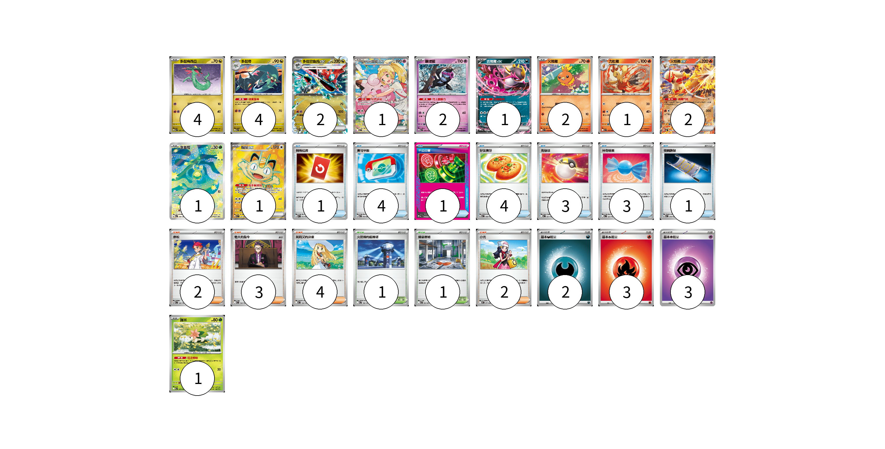 牌組構築方案 以此牌組為基礎新構築牌組 顯示卡面 顯示列表 寶可夢卡(22) 4 4 2 1 2 1 2 1 2 1 1 1 物品卡(17) 1 4 1 4 3 3 1 支援者卡(11) 2 3 4 2 競技場卡(2) 1 1 能量卡(8) 2 3 3 寶可夢卡(22) 卡牌名稱 張數 卡牌名稱 張數 多龍梅西亞 MC 546/742 04 多龍奇 MC 547/742 04 多龍巴魯托ex MC 548/742 02 莉莉艾的皮皮ex MC 765/742 01 願增猿 MC 358/742 02 吉雉雞ex MC 489/742 01 火稚雞 SV10 018/098 02 力壯雞 SV10 019/098 01 火焰雞ex SVM 016/175 02 含羞苞 M2a 196/193 01 喵喵ex M3 100/080 01 謝米 M2a 012/193 01 物品卡(17) 卡牌名稱 張數 卡牌名稱 張數 特殊紅牌 M4 072/083 01 寶可平板 M3 070/080 04 不公印章 MC 633/742 01 好友寶芬 MC 648/742 04 高級球 MC 651/742 03 神奇糖果 MC 655/742 03 夜間擔架 MC 670/742 01 支援者卡(11) 卡牌名稱 張數 卡牌名稱 張數 赤松 MC 696/742 02 老大的指令 MC 724/742 03 莉莉艾的決意 MC 729/742 04 小光 M2 077/080 02 競技場卡(2) 卡牌名稱 張數 卡牌名稱 張數 火箭隊的監視塔 M2a 189/193 01 險惡廢墟 M1L 063/063 01 能量卡(8) 卡牌名稱 張數 卡牌名稱 張數 基本【惡】能量 MC DAR 02 基本【火】能量 MC FIR 03 基本【超】能量 M-P PSY 03 以此牌組為基礎新構築牌組 牌組編碼 iRVXri-SBIKFJ-vyLpqj copy 列印牌組單 牌組編碼已複製 分享至SNS