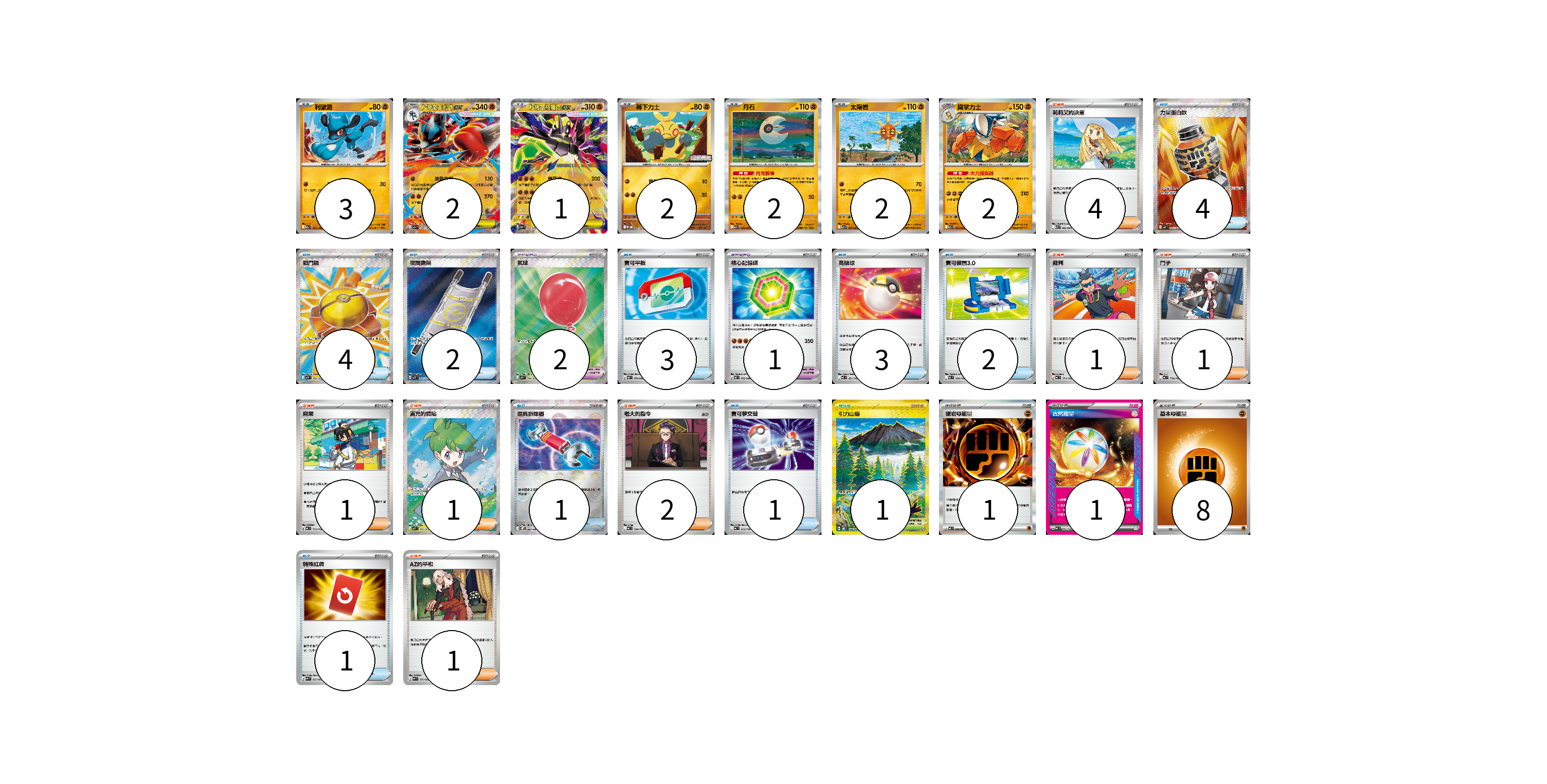 牌組構築方案 以此牌組為基礎新構築牌組 顯示卡面 顯示列表 寶可夢卡(14) 3 2 1 2 2 2 2 寶可夢道具(3) 2 1 物品卡(21) 4 4 2 3 3 2 1 1 1 支援者卡(11) 4 1 1 1 1 2 1 競技場卡(1) 1 能量卡(10) 1 1 8 寶可夢卡(14) 卡牌名稱 張數 卡牌名稱 張數 利歐路 M2a 091/193 03 超級路卡利歐ex M2a 092/193 02 超級基格爾德ex M3 046/080 01 幕下力士 M-P 007/M-P 02 月石 M1L 026/063 02 太陽岩 M1L 027/063 02 鐵掌力士 M1L 025/063 02 寶可夢道具(3) 卡牌名稱 張數 卡牌名稱 張數 氣球 M1L 084/063 02 核心記憶碟 M3 072/080 01 物品卡(21) 卡牌名稱 張數 卡牌名稱 張數 力量蛋白飲 M1L 081/063 04 戰鬥鑼 M1L 082/063 04 夜間擔架 M1L 083/063 02 寶可平板 M3 070/080 03 高級球 MC 651/742 03 寶可裝置3.0 MC 660/742 02 道具拆除器 SV11W 080/086 01 寶可夢交替 MC 663/742 01 特殊紅牌 M4 072/083 01 支援者卡(11) 卡牌名稱 張數 卡牌名稱 張數 莉莉艾的決意 M1L 062/063 04 裁判 MC 711/742 01 鬥子 MC 718/742 01 烏栗 MC 713/742 01 滿充的體貼 M1S 085/063 01 老大的指令 MC 724/742 02 AZ的平和 M4 075/083 01 競技場卡(1) 卡牌名稱 張數 卡牌名稱 張數 引力山岳 SV8 138/106 01 能量卡(10) 卡牌名稱 張數 卡牌名稱 張數 硬岩【鬥】能量 M3 080/080 01 古舊能量 MC 741/742 01 基本【鬥】能量 MC FIG 08 以此牌組為基礎新構築牌組 牌組編碼 iTlsPp-lKezdU-WQzRrw copy 列印牌組單 牌組編碼已複製 分享至SNS