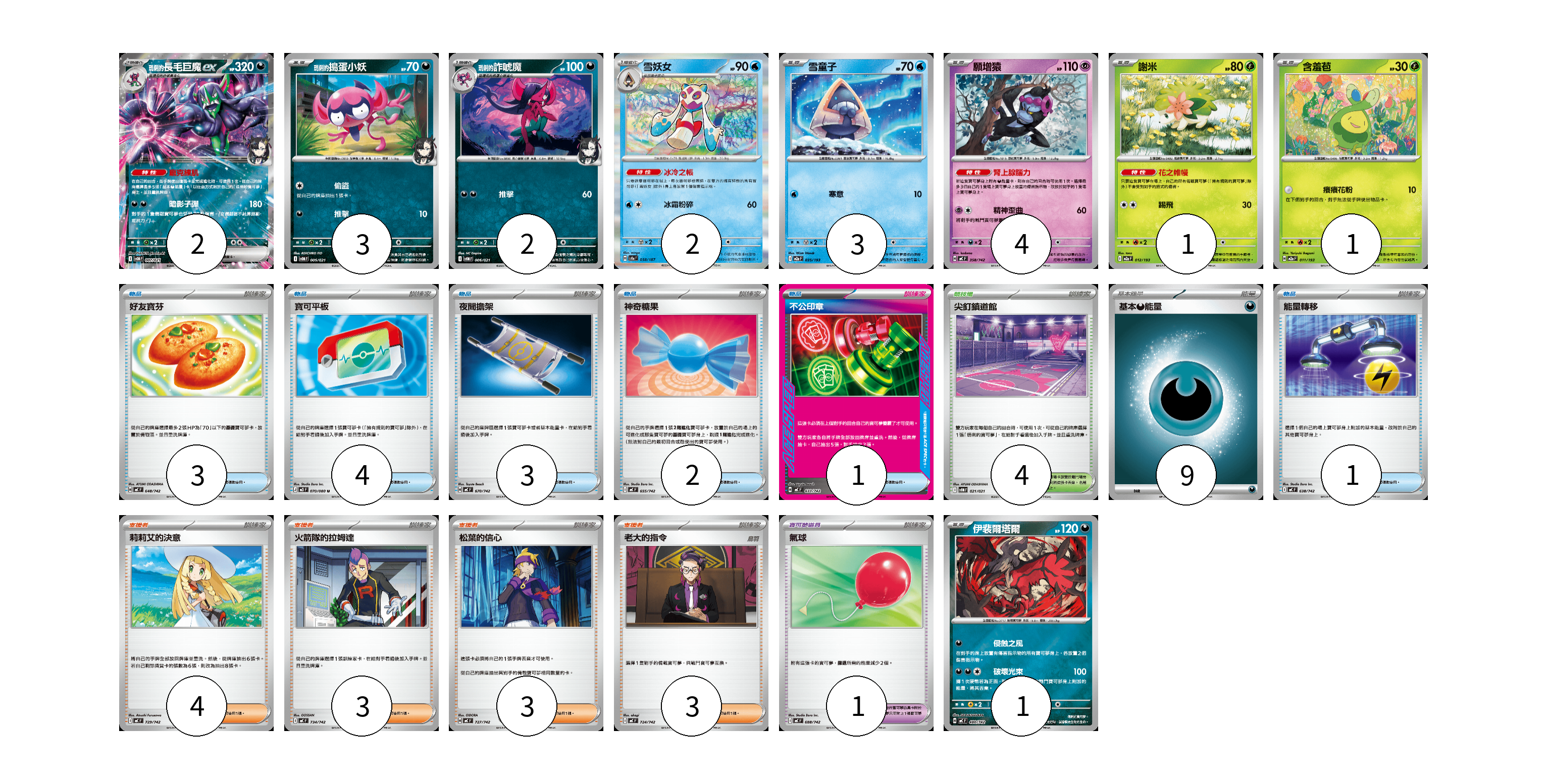 牌組構築方案 以此牌組為基礎新構築牌組 顯示卡面 顯示列表 寶可夢卡(19) 2 3 2 2 3 4 1 1 1 寶可夢道具(1) 1 物品卡(14) 3 4 3 2 1 1 支援者卡(13) 4 3 3 3 競技場卡(4) 4 能量卡(9) 9 寶可夢卡(19) 卡牌名稱 張數 卡牌名稱 張數 <瑪俐的>長毛巨魔ex SVOM 007/021 02 <瑪俐的>搗蛋小妖 SVOM 005/021 03 <瑪俐的>詐唬魔 SVOM 006/021 02 雪妖女 SV8a 038/187 02 雪童子 M2a 035/193 03 願增猿 MC 358/742 04 謝米 M2a 012/193 01 含羞苞 M2a 011/193 01 伊裴爾塔爾 MC 480/742 01 寶可夢道具(1) 卡牌名稱 張數 卡牌名稱 張數 氣球 MC 688/742 01 物品卡(14) 卡牌名稱 張數 卡牌名稱 張數 好友寶芬 MC 648/742 03 寶可平板 M3 070/080 04 夜間擔架 MC 670/742 03 神奇糖果 MC 655/742 02 不公印章 MC 633/742 01 能量轉移 MC 638/742 01 支援者卡(13) 卡牌名稱 張數 卡牌名稱 張數 莉莉艾的決意 MC 729/742 04 火箭隊的拉姆達 MC 734/742 03 松葉的信心 MC 727/742 03 老大的指令 MC 724/742 03 競技場卡(4) 卡牌名稱 張數 卡牌名稱 張數 尖釘鎮道館 SVOM 021/021 04 能量卡(9) 卡牌名稱 張數 卡牌名稱 張數 基本【惡】能量 MC DAR 09 以此牌組為基礎新構築牌組 牌組編碼 iVpAOU-JjQVpU-GPwLQI copy 列印牌組單 牌組編碼已複製 分享至SNS