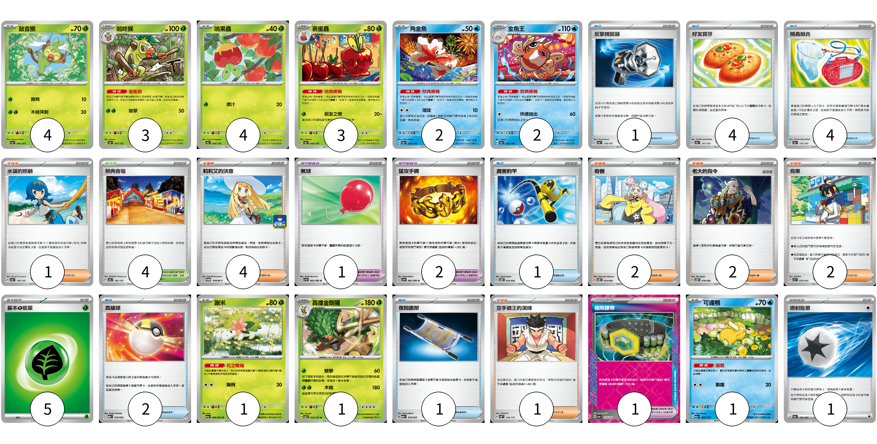 牌組構築方案 以此牌組為基礎新構築牌組 顯示卡面 顯示列表 寶可夢卡(21) 4 3 4 3 2 2 1 1 1 寶可夢道具(4) 1 2 1 物品卡(13) 1 4 4 1 2 1 支援者卡(12) 1 4 2 2 2 1 競技場卡(4) 4 能量卡(6) 5 1 寶可夢卡(21) 卡牌名稱 張數 卡牌名稱 張數 敲音猴 SV8a 006/187 04 啪咚猴 SV8a 007/187 03 啃果蟲 SV8a 008/187 04 裹蜜蟲 SV8a 009/187 03 角金魚 SV8a 028/187 02 金魚王 SV8a 029/187 02 謝米 SV9a 006/063 01 轟擂金剛猩 SV6 010/101 01 可達鴨 M2a 032/193 01 寶可夢道具(4) 卡牌名稱 張數 卡牌名稱 張數 氣球 SV11B 082/086 01 猛攻手鐲 SV11W 082/086 02 極限腰帶 SV8a 159/187 01 物品卡(13) 卡牌名稱 張數 卡牌名稱 張數 反擊捕捉器 SV8a 139/187 01 好友寶芬 SV8a 147/187 04 捕蟲組合 SV8a 150/187 04 厲害釣竿 SVOD 010/020 01 高級球 MBD 014/022 02 夜間擔架 MBD 016/022 01 支援者卡(12) 卡牌名稱 張數 卡牌名稱 張數 水蓮的照顧 SV8a 168/187 01 莉莉艾的決意 M-P 018/M-P 04 奇樹 SVOD 016/020 02 老大的指令 SVOD 019/020 02 烏栗 SVK 029/042 02 空手道王的演練 SVM 143/175 01 競技場卡(4) 卡牌名稱 張數 卡牌名稱 張數 祭典會場 SV8a 180/187 04 能量卡(6) 卡牌名稱 張數 卡牌名稱 張數 基本【草】能量 SVF GRA 05 噴射能量 SV8a 185/187 01 以此牌組為基礎新構築牌組 牌組編碼 iXNOfi-VMiYNZ-vRbADM copy 列印牌組單 牌組編碼已複製 分享至SNS