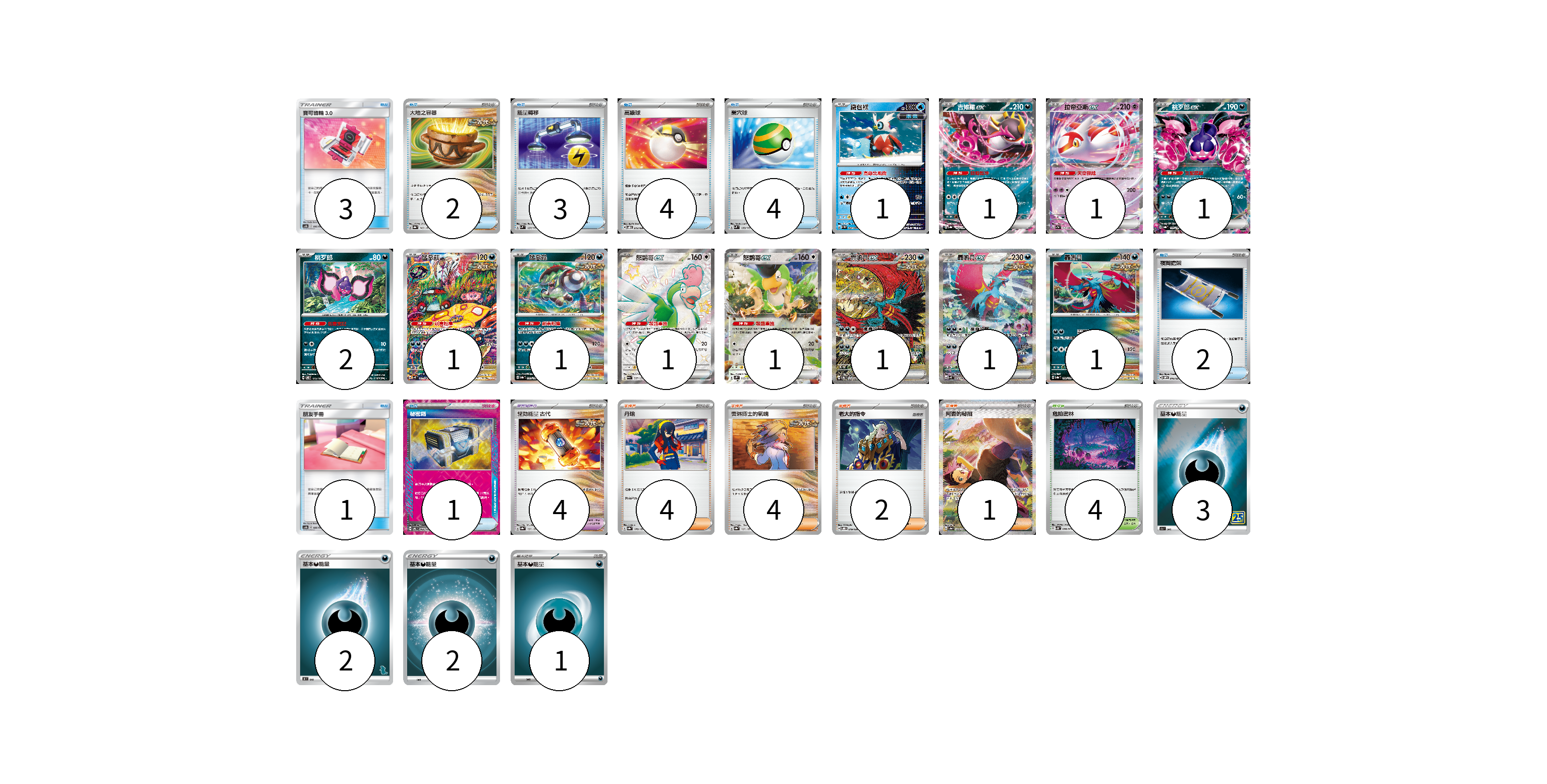 牌組構築方案 以此牌組為基礎新構築牌組 顯示卡面 顯示列表 寶可夢卡(13) 1 1 1 1 2 1 1 1 1 1 1 1 寶可夢道具(4) 4 物品卡(20) 3 2 3 4 4 2 1 1 支援者卡(11) 4 4 2 1 競技場卡(4) 4 能量卡(8) 3 2 2 1 寶可夢卡(13) 卡牌名稱 張數 卡牌名稱 張數 鐵包袱 SV4M 020/066 01 吉雉雞ex SV8a 104/187 01 拉帝亞斯ex SV7a 019/064 01 桃歹郎ex SV8a 105/187 01 桃歹郎 SV8 075/106 02 猛惡菇 SV4K 077/066 01 猛惡菇 SV8a 099/187 01 怒鸚哥ex SV4a 337/190 01 怒鸚哥ex SV2P 065/071 01 轟鳴月ex SV8a 218/187 01 轟鳴月ex SV4K 090/066 01 轟鳴月 SV8a 100/187 01 寶可夢道具(4) 卡牌名稱 張數 卡牌名稱 張數 驅勁能量 古代 SV8a 157/187 04 物品卡(20) 卡牌名稱 張數 卡牌名稱 張數 寶可齒輪3.0 AS6b 190/194 03 大地之容器 SV8a 143/187 02 能量轉移 SVM 127/175 03 高級球 SVOD 012/020 04 巢穴球 SVM 133/175 04 夜間擔架 SVOM 016/021 02 朋友手冊 AS6b 188/194 01 秘密箱 SV6 092/101 01 支援者卡(11) 卡牌名稱 張數 卡牌名稱 張數 丹瑜 SV8a 170/187 04 奧琳博士的氣魄 SV8a 167/187 04 老大的指令 SVOD 019/020 02 阿杏的秘招 SV8a 228/187 01 競技場卡(4) 卡牌名稱 張數 卡牌名稱 張數 危險密林 SV5K 070/071 04 能量卡(8) 卡牌名稱 張數 卡牌名稱 張數 基本惡能量 S8a DAR 03 基本惡能量 SH DAR 02 基本惡能量 SLD DAR 02 基本惡能量 sv-p DAR 01 以此牌組為基礎新構築牌組 牌組編碼 iZkPgs-nakxwU-cIkIpv copy 列印牌組單 牌組編碼已複製 分享至SNS