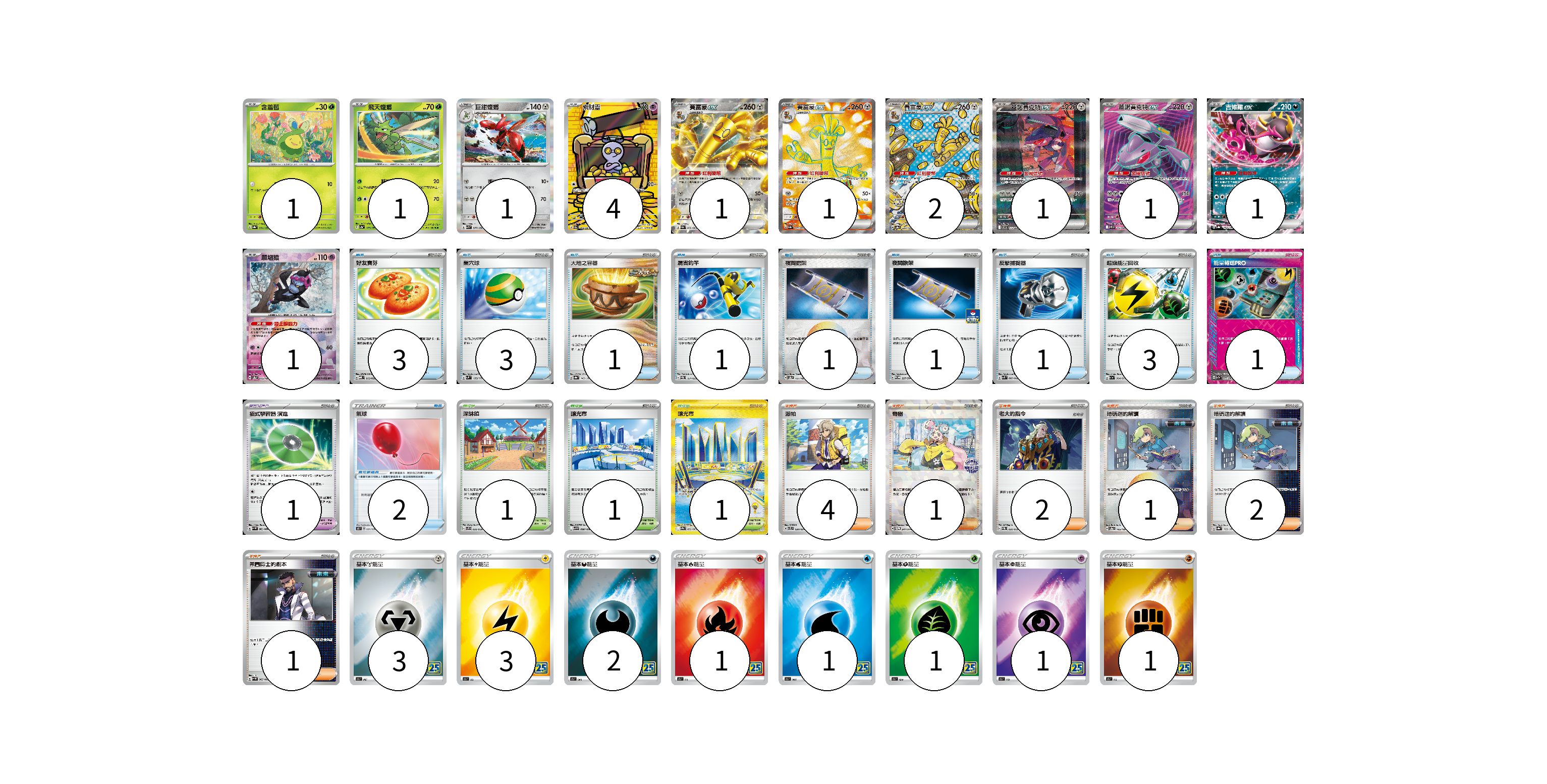 牌組構築方案 以此牌組為基礎新構築牌組 顯示卡面 顯示列表 寶可夢卡(15) 1 1 1 4 1 1 2 1 1 1 1 寶可夢道具(3) 1 2 物品卡(15) 3 3 1 1 1 1 1 3 1 支援者卡(11) 4 1 2 1 2 1 競技場卡(3) 1 1 1 能量卡(13) 3 3 2 1 1 1 1 1 寶可夢卡(15) 卡牌名稱 張數 卡牌名稱 張數 含羞苞 SV8a 001/187 01 飛天螳螂 SV2a 123/165 01 巨鉗螳螂 SV3 077/108 01 索財靈 SV3a 068/062 04 賽富豪ex SV3a 050/062 01 賽富豪ex SV3a 079/062 01 賽富豪ex SV8a 220/187 02 蓋諾賽克特ex SV11B 172/086 01 蓋諾賽克特ex SV11B 164/086 01 吉雉雞ex SV8a 104/187 01 願增猿 SV8a 075/187 01 寶可夢道具(3) 卡牌名稱 張數 卡牌名稱 張數 招式學習器 演進 SV4M 063/066 01 氣球 SK 021/030 02 物品卡(15) 卡牌名稱 張數 卡牌名稱 張數 好友寶芬 MBD 013/022 03 巢穴球 SVM 133/175 03 大地之容器 SV8a 143/187 01 厲害釣竿 SVEM 011/020 01 夜間擔架 SV8a 151/187 01 夜間擔架 SV-P 227/SV-P 01 反擊捕捉器 SVK 009/042 01 超級能量回收 SV1a 064/073 03 能量輸送PRO SV7a 052/064 01 支援者卡(11) 卡牌名稱 張數 卡牌名稱 張數 派帕 SVTL 020/021 04 奇樹 SV-P 247/SV-P 01 老大的指令 SVEM 020/020 02 暗碼迷的解讀 SV8a 165/187 01 暗碼迷的解讀 SV8a 165/187 02 弗圖博士的劇本 SV4M 065/066 01 競技場卡(3) 卡牌名稱 張數 卡牌名稱 張數 深缽鎮 SVF 036/038 01 釀光市 SV9 098/100 01 釀光市 SV9a 092/063 01 能量卡(13) 卡牌名稱 張數 卡牌名稱 張數 基本鋼能量 S8a MET 03 基本雷能量 S8a LIG 03 基本惡能量 S8a DAR 02 基本火能量 S8a FIR 01 基本水能量 S8a WAT 01 基本草能量 S8a GRA 01 基本超能量 S8a PSY 01 基本鬥能量 S8a FIG 01 以此牌組為基礎新構築牌組 牌組編碼 icvPgb-lTqfqX-XISEBI copy 列印牌組單 牌組編碼已複製 分享至SNS