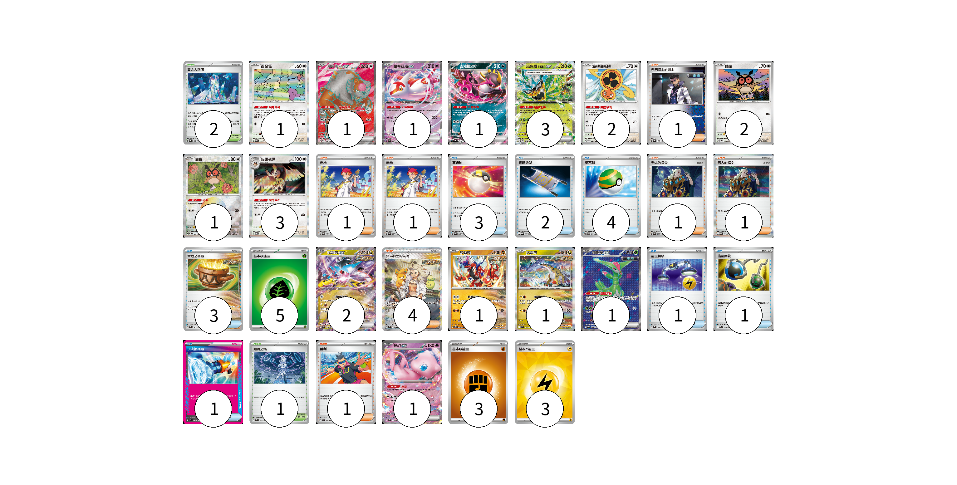 牌組構築方案 以此牌組為基礎新構築牌組 顯示卡面 顯示列表 寶可夢卡(21) 1 1 1 1 3 2 2 1 3 2 1 1 1 1 物品卡(15) 3 2 4 3 1 1 1 支援者卡(10) 1 1 1 1 1 4 1 競技場卡(3) 2 1 能量卡(11) 5 3 3 寶可夢卡(21) 卡牌名稱 張數 卡牌名稱 張數 百變怪 SV4a 144/190 01 月月熊 赫月 ex SV5a 084/066 01 拉帝亞斯ex SV7a 019/064 01 吉雉雞ex SV8a 104/187 01 厄鬼椪 碧草面具ex SV6 016/101 03 旋轉洛托姆 SV7 080/102 02 咕咕 SV7 076/102 02 咕咕 SV8a 127/187 01 貓頭夜鷹 SV8a 128/187 03 猛雷鼓ex SV8a 124/187 02 故勒頓 SV8 069/106 01 猛雷鼓 SV7 075/102 01 鐵斑葉ex SV5M 084/071 01 夢幻ex SVK 001/042 01 物品卡(15) 卡牌名稱 張數 卡牌名稱 張數 高級球 SVK 018/042 03 夜間擔架 SV6a 056/064 02 巢穴球 SVAW 014/023 04 大地之容器 SV8a 143/187 03 能量轉移 SVM 127/175 01 能量回收 SVQL 012/022 01 頂尖捕捉器 MBG 014/022 01 支援者卡(10) 卡牌名稱 張數 卡牌名稱 張數 弗圖博士的劇本 SV8a 175/187 01 赤松 SV8a 163/187 01 赤松 SVK 027/042 01 老大的指令 SVK 036/042 01 老大的指令 SV4a 181/190 01 奧琳博士的氣魄 SV4K 091/066 04 裁判 SV9a 062/063 01 競技場卡(3) 卡牌名稱 張數 卡牌名稱 張數 零之大空洞 SV8a 182/187 02 阻礙之塔 SV8a 181/187 01 能量卡(11) 卡牌名稱 張數 卡牌名稱 張數 基本草能量 sv-p GRA 05 基本【鬥】能量 M-P FIG 03 基本【雷】能量 SVQP LIG 03 以此牌組為基礎新構築牌組 牌組編碼 ifmzUr-UEokDh-JbOQck copy 列印牌組單 牌組編碼已複製 分享至SNS