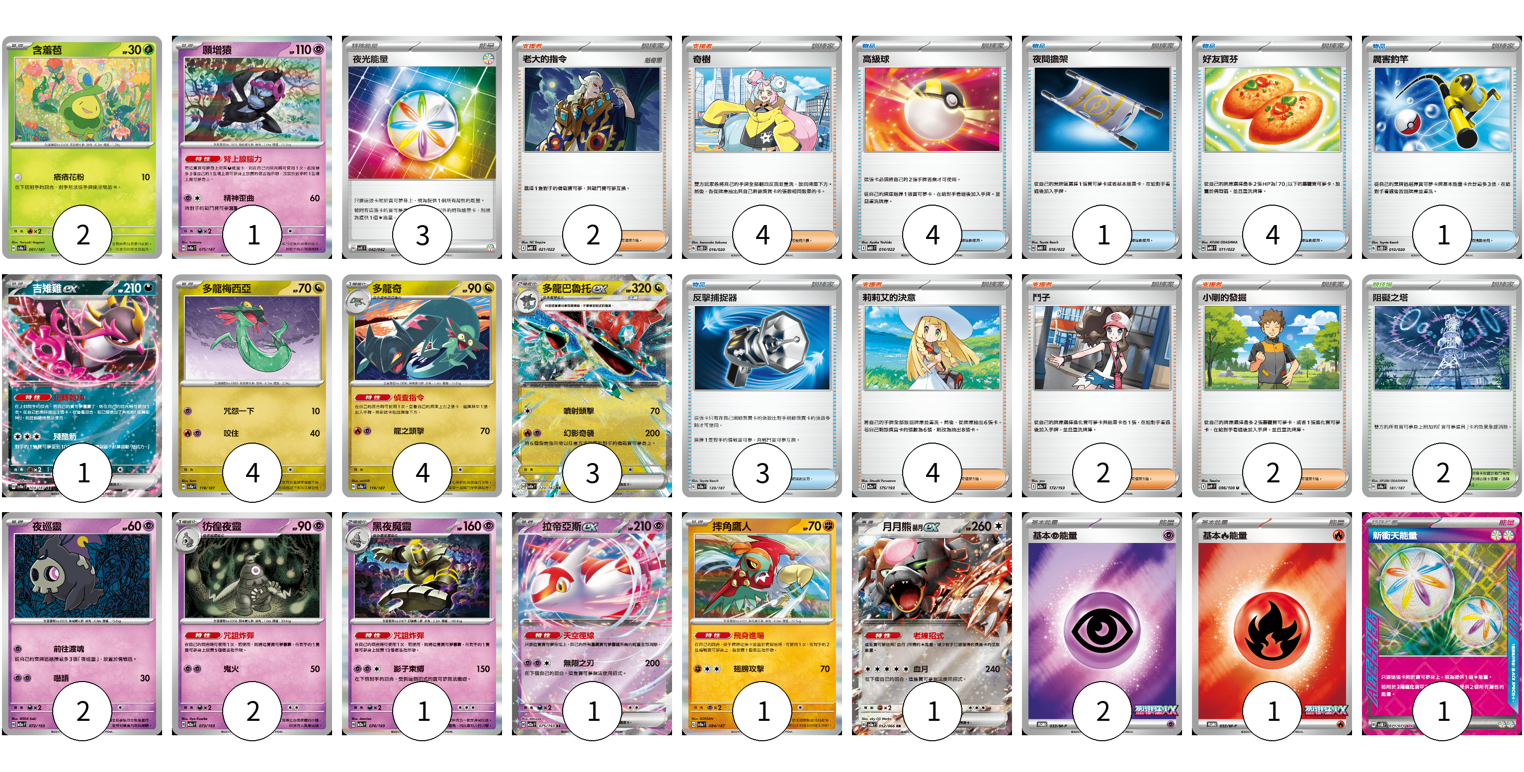 牌組構築方案 以此牌組為基礎新構築牌組 顯示卡面 顯示列表 寶可夢卡(23) 2 1 1 4 4 3 2 2 1 1 1 1 物品卡(13) 4 1 4 1 3 支援者卡(14) 2 4 4 2 2 競技場卡(2) 2 能量卡(7) 3 2 1 1 寶可夢卡(23) 卡牌名稱 張數 卡牌名稱 張數 含羞苞 SV8a 001/187 02 願增猿 SV8a 075/187 01 吉雉雞ex SV8a 104/187 01 多龍梅西亞 SV8a 118/187 04 多龍奇 SV8a 119/187 04 多龍巴魯托ex SV8a 120/187 03 夜巡靈 M2a 072/193 02 彷徨夜靈 M2a 073/193 02 黑夜魔靈 M2a 074/193 01 拉帝亞斯ex M2a 075/193 01 摔角鷹人 SV8a 084/187 01 月月熊 赫月 ex SV5a 052/066 01 物品卡(13) 卡牌名稱 張數 卡牌名稱 張數 高級球 MBD 014/022 04 夜間擔架 MBD 016/022 01 好友寶芬 MBG 011/022 04 厲害釣竿 SVOD 010/020 01 反擊捕捉器 SV8a 139/187 03 支援者卡(14) 卡牌名稱 張數 卡牌名稱 張數 老大的指令 MBG 021/022 02 奇樹 SVOD 016/020 04 莉莉艾的決意 M2a 175/193 04 鬥子 M2a 172/193 02 小剛的發掘 SV9 096/100 02 競技場卡(2) 卡牌名稱 張數 卡牌名稱 張數 阻礙之塔 SV8a 181/187 02 能量卡(7) 卡牌名稱 張數 卡牌名稱 張數 夜光能量 SVK 042/042 03 基本【超】能量 M-P 033/M-P 02 基本【火】能量 M-P 032/M-P 01 新衝天能量 SV5K 071/071 01 以此牌組為基礎新構築牌組 牌組編碼 igEHNn-ThAycV-sziFiE copy 列印牌組單 牌組編碼已複製 分享至SNS