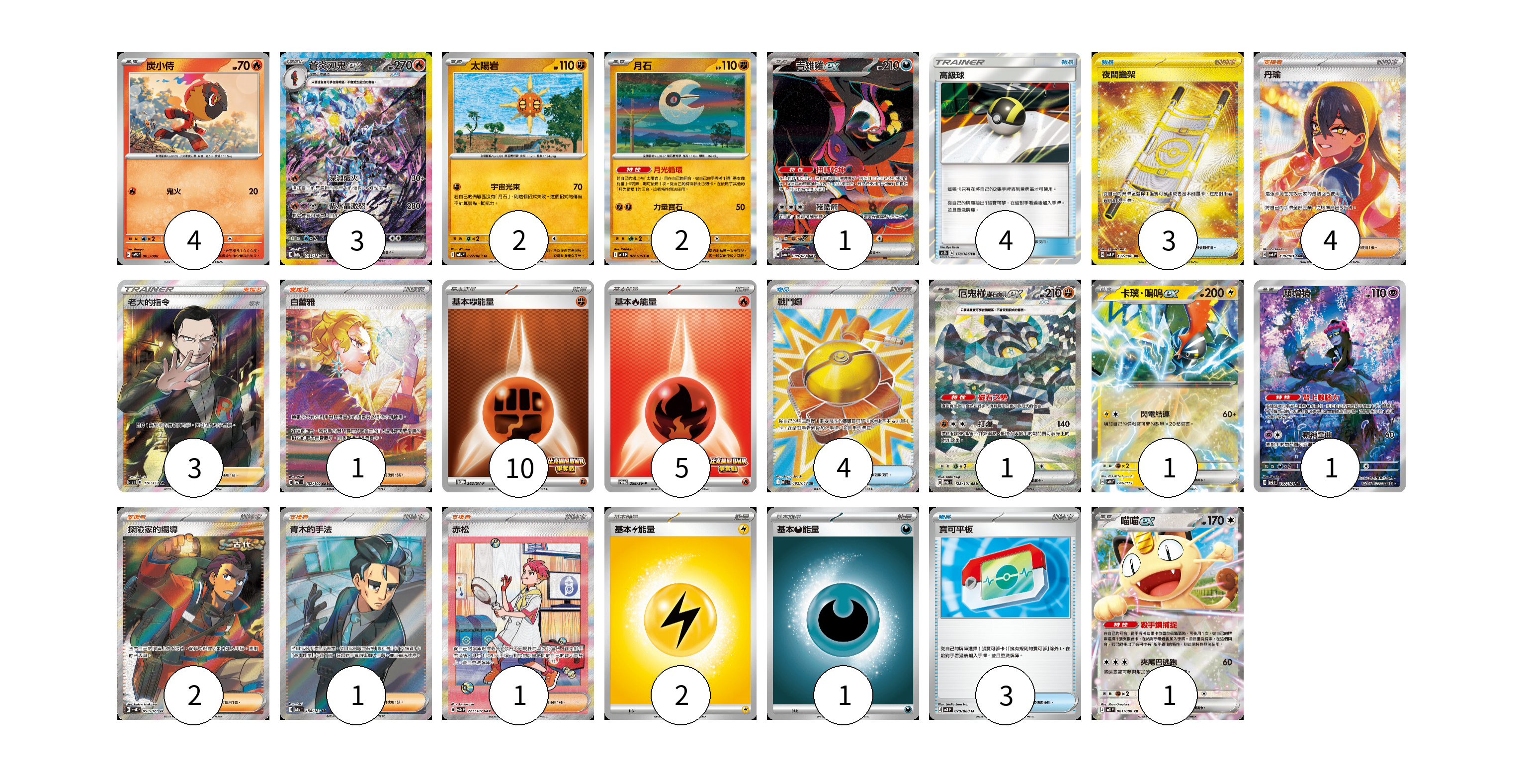 牌組構築方案 以此牌組為基礎新構築牌組 顯示卡面 顯示列表 寶可夢卡(16) 4 3 2 2 1 1 1 1 1 物品卡(14) 4 3 4 3 支援者卡(12) 4 3 1 2 1 1 能量卡(18) 10 5 2 1 寶可夢卡(16) 卡牌名稱 張數 卡牌名稱 張數 炭小侍 SVPS 005/008 04 蒼炎刃鬼ex SV8a 203/187 03 太陽岩 M1L 027/063 02 月石 M1L 026/063 02 吉雉雞ex SV6a 089/064 01 厄鬼椪 礎石面具ex SV6 128/101 01 卡璞・鳴鳴ex SVM 046/175 01 願增猿 SV6 107/101 01 喵喵ex M3 061/080 01 物品卡(14) 卡牌名稱 張數 卡牌名稱 張數 高級球 AS5b 178/186 04 夜間擔架 SV8 137/106 03 戰鬥鑼 M1L 082/063 04 寶可平板 M3 070/080 03 支援者卡(12) 卡牌名稱 張數 卡牌名稱 張數 丹瑜 SV6 130/101 04 老大的指令(坂木) SC1b 170/153 03 白蕾雅 SV7 132/102 01 探險家的嚮導 SV5K 090/071 02 青木的手法 SV8a 188/187 01 赤松 SV8a 227/187 01 能量卡(18) 卡牌名稱 張數 卡牌名稱 張數 基本【鬥】能量 SV-P 262/SV-P 10 基本【火】能量 SV-P 258/SV-P 05 基本【雷】能量 MC LIG 02 基本【惡】能量 MC DAR 01 以此牌組為基礎新構築牌組 牌組編碼 ilZupV-TqkPUA-MZHhUx copy 列印牌組單 牌組編碼已複製 分享至SNS