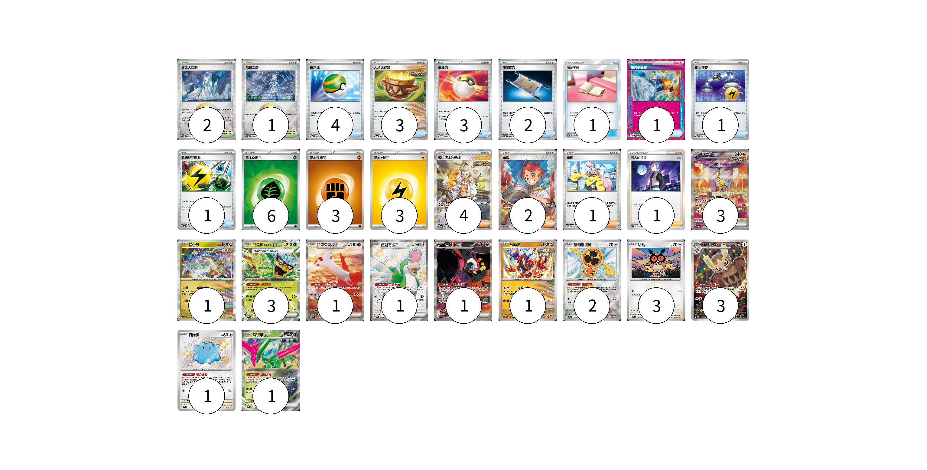 牌組構築方案 以此牌組為基礎新構築牌組 顯示卡面 顯示列表 寶可夢卡(21) 3 1 3 1 1 1 1 2 3 3 1 1 物品卡(16) 4 3 3 2 1 1 1 1 支援者卡(8) 4 2 1 1 競技場卡(3) 2 1 能量卡(12) 6 3 3 寶可夢卡(21) 卡牌名稱 張數 卡牌名稱 張數 猛雷鼓ex SV5K 095/071 03 猛雷鼓 SV7 075/102 01 厄鬼椪 碧草面具ex SV8a 020/187 03 拉帝亞斯ex SV7a 087/064 01 怒鸚哥ex SV4a 337/190 01 吉雉雞ex SV6a 089/064 01 故勒頓 SV8 069/106 01 旋轉洛托姆 SV8a 131/187 02 咕咕 SV7 076/102 03 貓頭夜鷹 SV7 114/102 03 百變怪 SV4a 309/190 01 鐵斑葉ex SV8a 016/187 01 物品卡(16) 卡牌名稱 張數 卡牌名稱 張數 巢穴球 SVM 133/175 04 大地之容器 SV8a 143/187 03 高級球 SVOD 012/020 03 夜間擔架 SVOM 016/021 02 朋友手冊 AS6b 188/194 01 頂尖捕捉器 SV8a 148/187 01 能量轉移 SVC 011/021 01 超級能量回收 SV8a 141/187 01 支援者卡(8) 卡牌名稱 張數 卡牌名稱 張數 奧琳博士的氣魄 SV4K 091/066 04 赤松 SV7 123/102 02 奇樹 SVOD 016/020 01 老大的指令(赤日) SK 025/030 01 競技場卡(3) 卡牌名稱 張數 卡牌名稱 張數 零之大空洞 SV8a 182/187 02 阻礙之塔 SV8a 181/187 01 能量卡(12) 卡牌名稱 張數 卡牌名稱 張數 基本【草】能量 SVK GRA 06 基本【鬥】能量 SVTG FIG 03 基本【雷】能量 SVTR LIG 03 以此牌組為基礎新構築牌組 牌組編碼 inGDuE-bhQEQn-ICvZRI copy 列印牌組單 牌組編碼已複製 分享至SNS