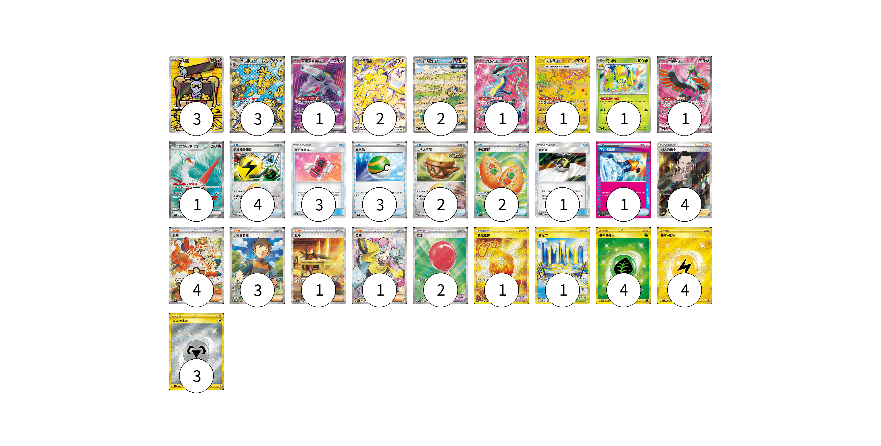 牌組構築方案 以此牌組為基礎新構築牌組 顯示卡面 顯示列表 寶可夢卡(16) 3 3 1 2 2 1 1 1 1 1 寶可夢道具(3) 2 1 物品卡(16) 4 3 3 2 2 1 1 支援者卡(13) 4 4 3 1 1 競技場卡(1) 1 能量卡(11) 4 4 3 寶可夢卡(16) 卡牌名稱 張數 卡牌名稱 張數 索財靈 SV3a 068/062 03 賽富豪ex SV8a 220/187 03 蓋諾賽克特ex SV11B 164/086 01 電電蟲 SV7 108/102 02 鐵臂膀ex SV4M 088/066 02 密勒頓ex SV1V 094/078 01 皮卡丘ex SV8a 236/187 01 電蜘蛛 SV6a 002/064 01 吉雉雞ex SV6a 081/064 01 拉帝亞斯ex SV7a 078/064 01 寶可夢道具(3) 卡牌名稱 張數 卡牌名稱 張數 氣球 M1L 084/063 02 勇氣護符 SV7 134/102 01 物品卡(16) 卡牌名稱 張數 卡牌名稱 張數 超級能量回收 SV8a 141/187 04 寶可齒輪3.0 AS6b 190/194 03 巢穴球 SVM 133/175 03 大地之容器 SV8a 143/187 02 好友寶芬 M1S 081/063 02 高級球 AS5b 178/186 01 頂尖捕捉器 MBG 014/022 01 支援者卡(13) 卡牌名稱 張數 卡牌名稱 張數 老大的指令(坂木) SC1b 170/153 04 派帕 SV4a 353/190 04 小剛的發掘 SV9 123/100 03 牡丹 SV1S 105/078 01 奇樹 SV2D 091/071 01 競技場卡(1) 卡牌名稱 張數 卡牌名稱 張數 釀光市 SV9a 092/063 01 能量卡(11) 卡牌名稱 張數 卡牌名稱 張數 基本【草】能量 SV2D 099/071 04 基本【雷】能量 SV1V 108/078 04 基礎【鋼】能量 SV4M 095/066 03 以此牌組為基礎新構築牌組 牌組編碼 inIphn-czhOeN-Gfsatw copy 列印牌組單 牌組編碼已複製 分享至SNS