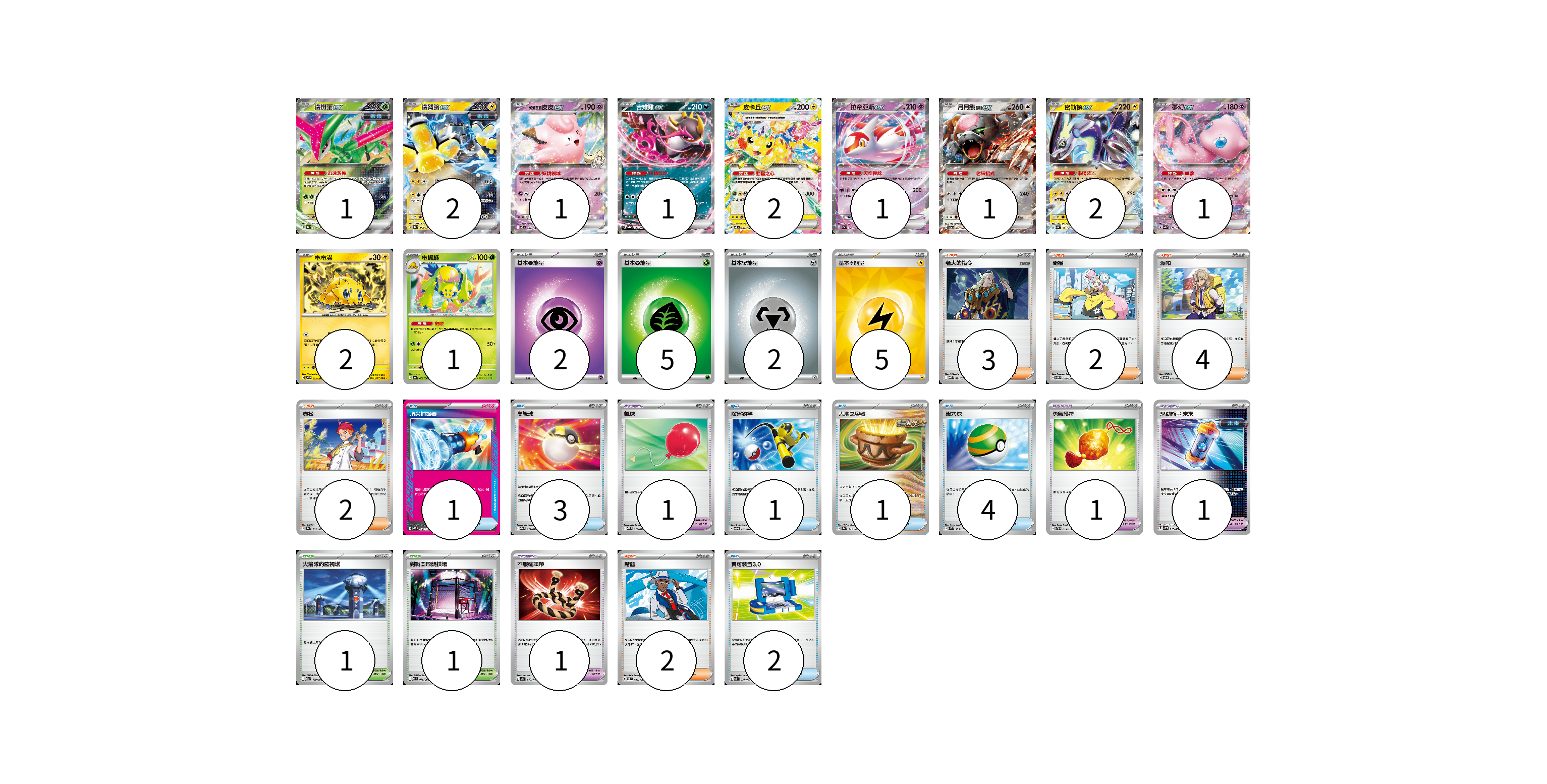 牌組構築方案 以此牌組為基礎新構築牌組 顯示卡面 顯示列表 寶可夢卡(15) 1 2 1 1 2 1 1 2 1 2 1 寶可夢道具(3) 1 1 1 物品卡(13) 1 3 1 1 1 4 2 支援者卡(13) 3 2 4 2 2 競技場卡(2) 1 1 能量卡(14) 2 5 2 5 寶可夢卡(15) 卡牌名稱 張數 卡牌名稱 張數 鐵斑葉ex SV8a 016/187 01 鐵臂膀ex SV8a 054/187 02 莉莉艾的皮皮ex SV9 033/100 01 吉雉雞ex SV8a 104/187 01 皮卡丘ex SV8 033/106 02 拉帝亞斯ex SV7a 019/064 01 月月熊 赫月 ex SV5a 052/066 01 密勒頓ex SV4a 071/190 02 夢幻ex SV4a 076/190 01 電電蟲 SV7 032/102 02 電蜘蛛 SV6a 002/064 01 寶可夢道具(3) 卡牌名稱 張數 卡牌名稱 張數 勇氣護符 SVTR 015/021 01 驅勁能量 未來 SVHM 016/022 01 不服輸頭帶 SV1S 073/078 01 物品卡(13) 卡牌名稱 張數 卡牌名稱 張數 頂尖捕捉器 MBG 014/022 01 高級球 MBG 012/022 03 氣球 MBD 018/022 01 厲害釣竿 SVOD 010/020 01 大地之容器 SV8a 143/187 01 巢穴球 SVM 133/175 04 寶可裝置3.0 SVK 021/042 02 支援者卡(13) 卡牌名稱 張數 卡牌名稱 張數 老大的指令 MBG 021/022 03 奇樹 SVOM 018/021 02 派帕 SVOD 018/020 04 赤松 SV8a 163/187 02 席藍 SV8 102/106 02 競技場卡(2) 卡牌名稱 張數 卡牌名稱 張數 火箭隊的監視塔 M2a 189/193 01 對戰圓形競技場 M2 079/080 01 能量卡(14) 卡牌名稱 張數 卡牌名稱 張數 基本【超】能量 MBD PSY 02 基本【草】能量 M-P GRA 05 基本【鋼】能量 M-P MET 02 基本【雷】能量 SVQP LIG 05 以此牌組為基礎新構築牌組 牌組編碼 inRntO-BqGBBi-fyvZGY copy 列印牌組單 牌組編碼已複製 分享至SNS