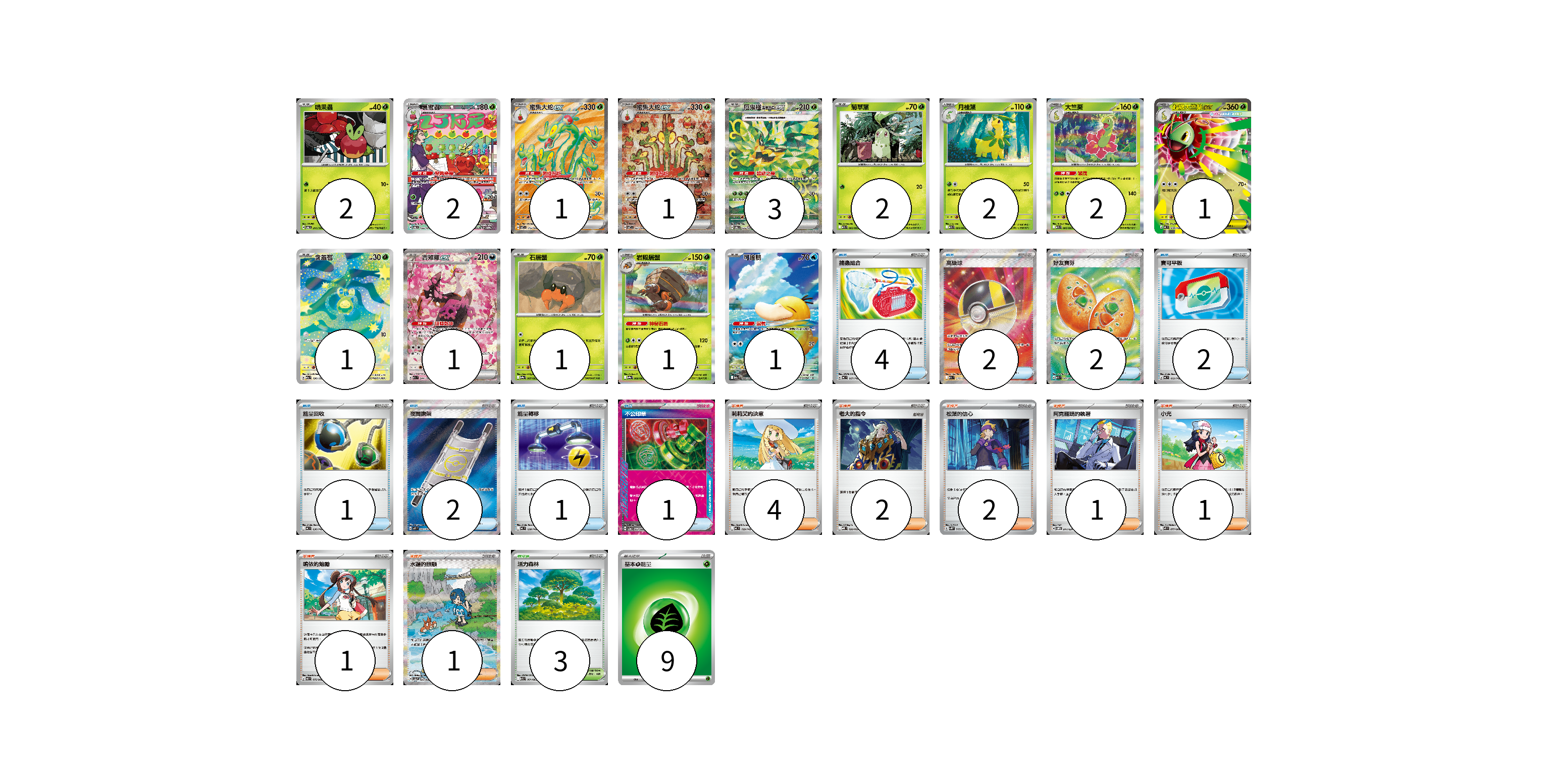 牌組構築方案 以此牌組為基礎新構築牌組 顯示卡面 顯示列表 寶可夢卡(21) 2 2 1 1 3 2 2 2 1 1 1 1 1 1 物品卡(15) 4 2 2 2 1 2 1 1 支援者卡(12) 4 2 2 1 1 1 1 競技場卡(3) 3 能量卡(9) 9 寶可夢卡(21) 卡牌名稱 張數 卡牌名稱 張數 啃果蟲 SV6 011/101 02 裹蜜蟲 SV6 103/101 02 蜜集大蛇ex SV7 115/102 01 蜜集大蛇ex SV7 127/102 01 厄鬼椪 碧草面具ex SV6 125/101 03 菊草葉 M1S 003/063 02 月桂葉 M1S 004/063 02 大竺葵 M1S 005/063 02 超級大竺葵ex MC 018/742 01 含羞苞 M2a 196/193 01 吉雉雞ex M2a 244/193 01 石居蟹 SV9a 007/063 01 岩殿居蟹 SV9a 008/063 01 可達鴨 M2a 199/193 01 物品卡(15) 卡牌名稱 張數 卡牌名稱 張數 捕蟲組合 MC 667/742 04 高級球 M2a 216/193 02 好友寶芬 M1S 081/063 02 寶可平板 MC 662/742 02 能量回收 MC 636/742 01 夜間擔架 M1L 083/063 02 能量轉移 MC 638/742 01 不公印章 SV5a 053/066 01 支援者卡(12) 卡牌名稱 張數 卡牌名稱 張數 莉莉艾的決意 MC 729/742 04 老大的指令 MBD 020/022 02 松葉的信心 SV5K 069/071 02 阿克羅瑪的執著 SVOM 017/021 01 小光 M2 077/080 01 鳴依的勉勵 M3 075/080 01 水蓮的照顧 SV5a 093/066 01 競技場卡(3) 卡牌名稱 張數 卡牌名稱 張數 活力森林 M1S 061/063 03 能量卡(9) 卡牌名稱 張數 卡牌名稱 張數 基本草能量 sv-p GRA 09 以此牌組為基礎新構築牌組 牌組編碼 ioGxJI-TwaaMc-BLGRkR copy 列印牌組單 牌組編碼已複製 分享至SNS