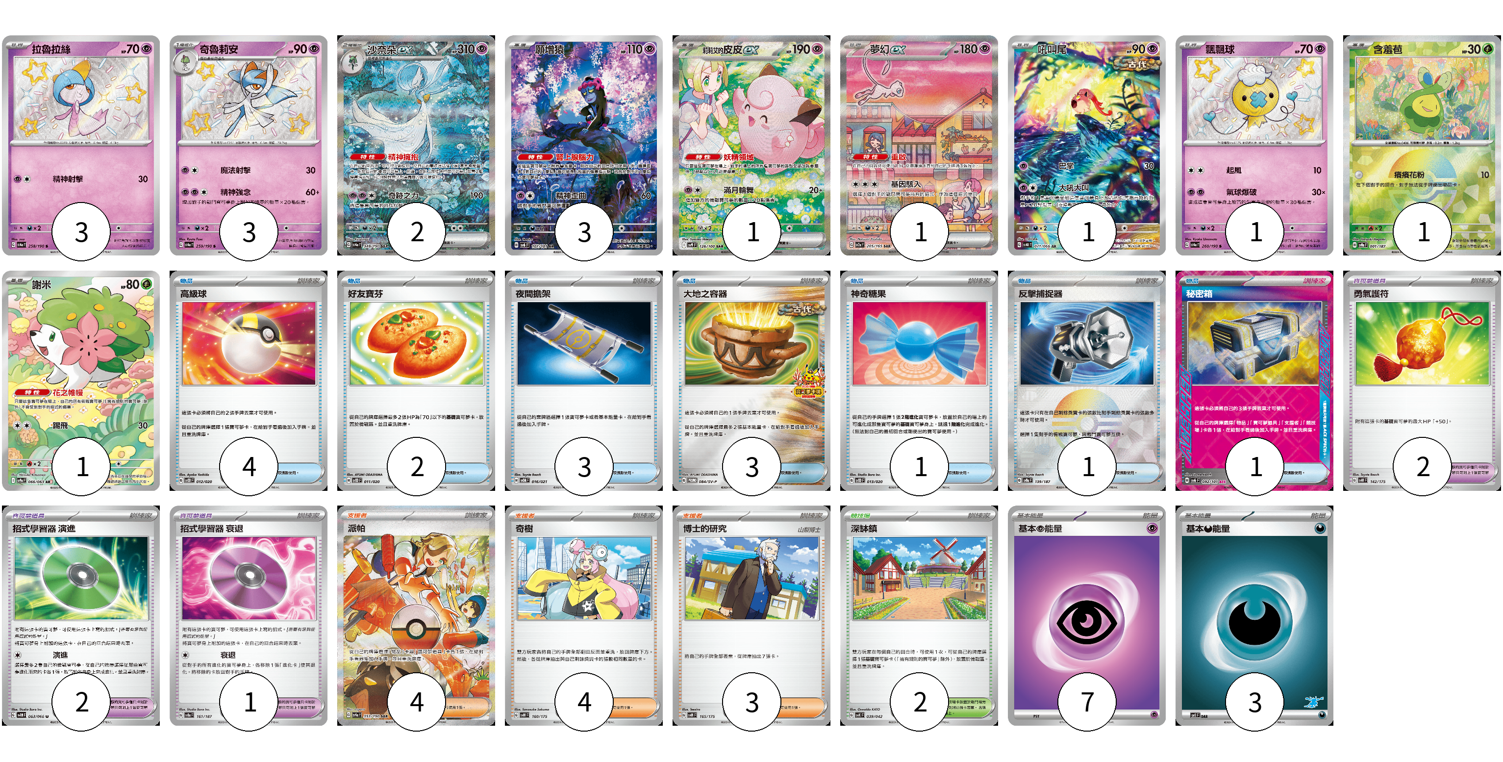 牌組構築方案 以此牌組為基礎新構築牌組 顯示卡面 顯示列表 寶可夢卡(17) 3 3 2 3 1 1 1 1 1 1 寶可夢道具(5) 2 2 1 物品卡(15) 4 2 3 3 1 1 1 支援者卡(11) 4 4 3 競技場卡(2) 2 能量卡(10) 7 3 寶可夢卡(17) 卡牌名稱 張數 卡牌名稱 張數 拉魯拉絲 SV4a 258/190 03 奇魯莉安 SV4a 259/190 03 沙奈朵ex SV4a 348/190 02 願增猿 SV6 107/101 03 莉莉艾的皮皮ex SV9 126/100 01 夢幻ex SV2a 205/165 01 吼叫尾 SV4K 071/066 01 飄飄球 SV4a 260/190 01 含羞苞 SV8a 001/187 01 謝米 SV9a 066/063 01 寶可夢道具(5) 卡牌名稱 張數 卡牌名稱 張數 勇氣護符 SVM 142/175 02 招式學習器 演進 SV4M 063/066 02 招式學習器 衰退 SV8a 161/187 01 物品卡(15) 卡牌名稱 張數 卡牌名稱 張數 高級球 SVOD 012/020 04 好友寶芬 SVOD 011/020 02 夜間擔架 SVOM 016/021 03 大地之容器 SV-P 084/SV-P 03 神奇糖果 SVOD 013/020 01 反擊捕捉器 SV8a 139/187 01 秘密箱 SV6 092/101 01 支援者卡(11) 卡牌名稱 張數 卡牌名稱 張數 派帕 SV4a 353/190 04 奇樹 SVM 160/175 04 博士的研究 SVM 165/175 03 競技場卡(2) 卡牌名稱 張數 卡牌名稱 張數 深缽鎮 SVK 039/042 02 能量卡(10) 卡牌名稱 張數 卡牌名稱 張數 基本超能量 sv-p PSY 07 基本【惡】能量 SVI DAR 03 以此牌組為基礎新構築牌組 牌組編碼 ioWzEv-vqjQLb-thfmHz copy 列印牌組單 牌組編碼已複製 分享至SNS
