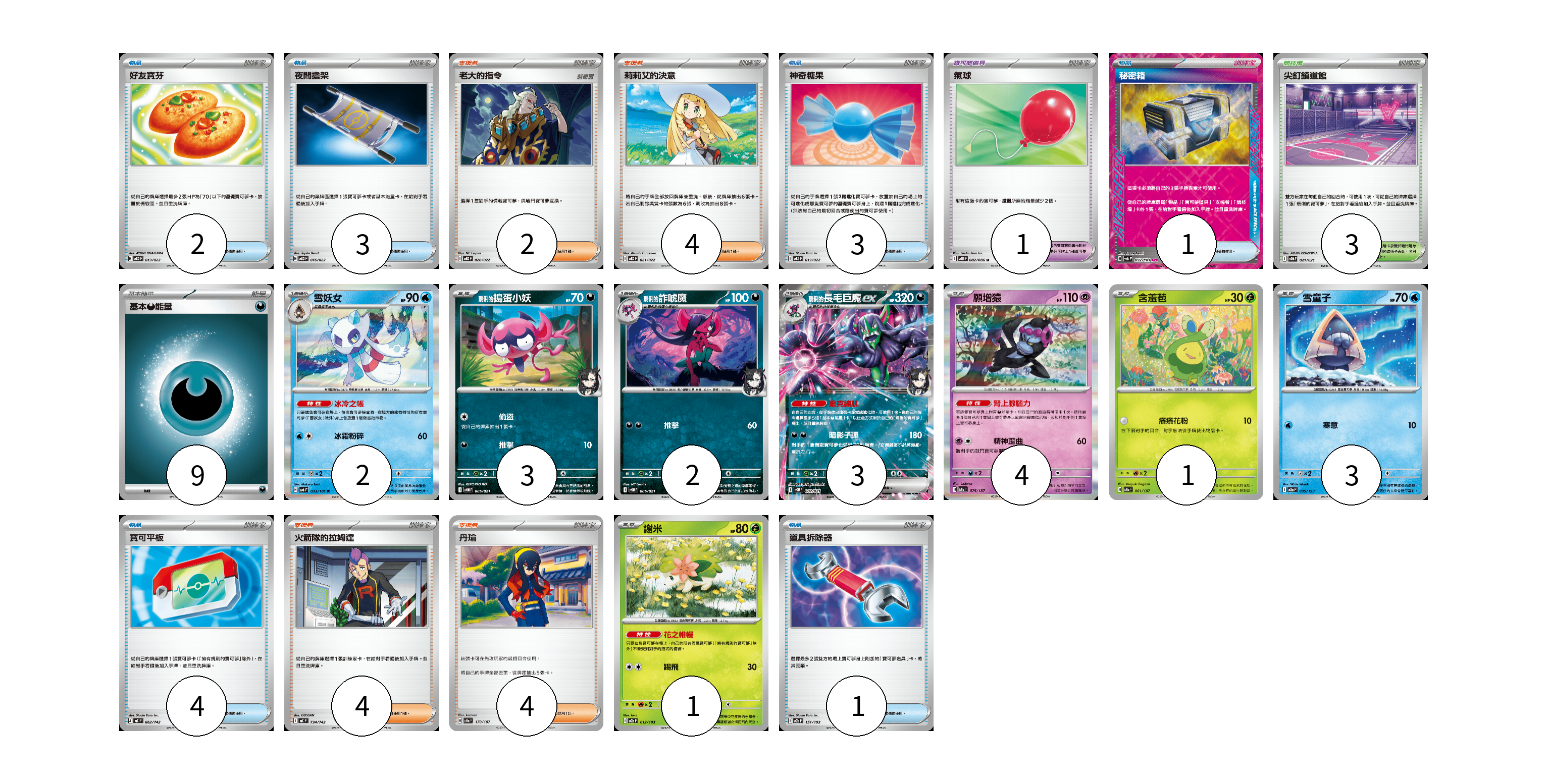 牌組構築方案 以此牌組為基礎新構築牌組 顯示卡面 顯示列表 寶可夢卡(19) 2 3 2 3 4 1 3 1 寶可夢道具(1) 1 物品卡(14) 2 3 3 1 4 1 支援者卡(14) 2 4 4 4 競技場卡(3) 3 能量卡(9) 9 寶可夢卡(19) 卡牌名稱 張數 卡牌名稱 張數 雪妖女 SV6 033/101 02 <瑪俐的>搗蛋小妖 SVOM 005/021 03 <瑪俐的>詐唬魔 SVOM 006/021 02 <瑪俐的>長毛巨魔ex SVOM 007/021 03 願增猿 SV8a 075/187 04 含羞苞 SV8a 001/187 01 雪童子 M2a 035/193 03 謝米 M2a 012/193 01 寶可夢道具(1) 卡牌名稱 張數 卡牌名稱 張數 氣球 SV11B 082/086 01 物品卡(14) 卡牌名稱 張數 卡牌名稱 張數 好友寶芬 MBD 013/022 02 夜間擔架 MBD 016/022 03 神奇糖果 MBG 013/022 03 秘密箱 SV6 092/101 01 寶可平板 MC 662/742 04 道具拆除器 M2a 151/193 01 支援者卡(14) 卡牌名稱 張數 卡牌名稱 張數 老大的指令 MBD 020/022 02 莉莉艾的決意 MBD 021/022 04 火箭隊的拉姆達 MC 734/742 04 丹瑜 SV8a 170/187 04 競技場卡(3) 卡牌名稱 張數 卡牌名稱 張數 尖釘鎮道館 SVOM 021/021 03 能量卡(9) 卡牌名稱 張數 卡牌名稱 張數 基本【惡】能量 MBG DAR 09 以此牌組為基礎新構築牌組 牌組編碼 irrKTO-tbXjPO-uONuLn copy 列印牌組單 牌組編碼已複製 分享至SNS
