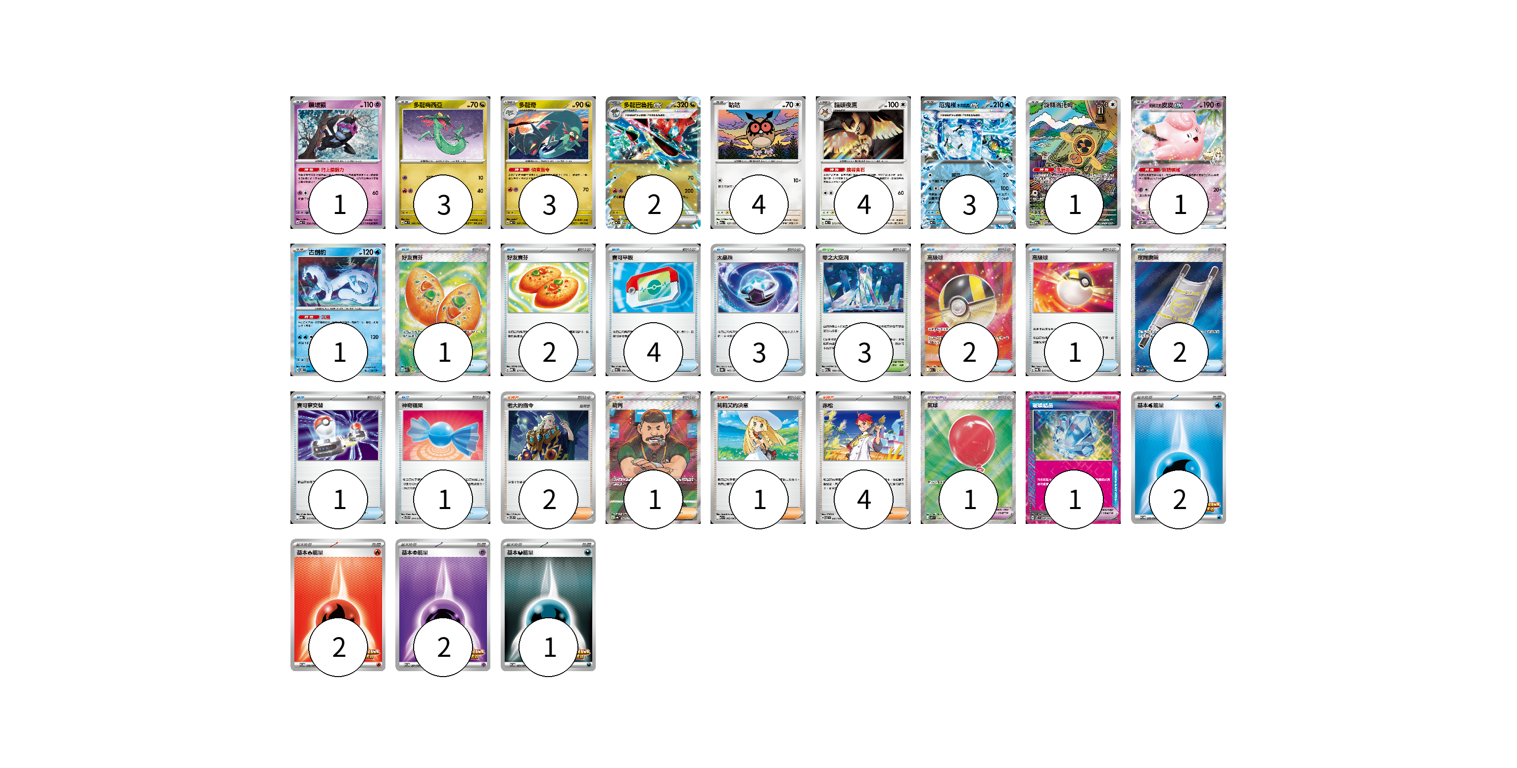 牌組構築方案 以此牌組為基礎新構築牌組 顯示卡面 顯示列表 寶可夢卡(23) 1 3 3 2 4 4 3 1 1 1 寶可夢道具(2) 1 1 物品卡(17) 1 2 4 3 2 1 2 1 1 支援者卡(8) 2 1 1 4 競技場卡(3) 3 能量卡(7) 2 2 2 1 寶可夢卡(23) 卡牌名稱 張數 卡牌名稱 張數 願增猿 MC 358/742 01 多龍梅西亞 MC 546/742 03 多龍奇 MC 547/742 03 多龍巴魯托ex MC 548/742 02 咕咕 M2a 137/193 04 貓頭夜鷹 MC 573/742 04 厄鬼椪 水井面具ex MC 224/742 03 旋轉洛托姆 M2a 213/193 01 莉莉艾的皮皮ex SV9 033/100 01 古劍豹 SV8 032/106 01 寶可夢道具(2) 卡牌名稱 張數 卡牌名稱 張數 氣球 M1L 084/063 01 璀璨結晶 SV7 094/102 01 物品卡(17) 卡牌名稱 張數 卡牌名稱 張數 好友寶芬 M1S 081/063 01 好友寶芬 MBG 011/022 02 寶可平板 M3 070/080 04 太晶珠 SV8a 145/187 03 高級球 M2a 216/193 02 高級球 SVQL 015/022 01 夜間擔架 M1L 083/063 02 寶可夢交替 MBG 015/022 01 神奇糖果 SVTG 014/019 01 支援者卡(8) 卡牌名稱 張數 卡牌名稱 張數 老大的指令 SVTS 020/022 02 裁判 SV4a 342/190 01 莉莉艾的決意 M1L 062/063 01 赤松 SV7 097/102 04 競技場卡(3) 卡牌名稱 張數 卡牌名稱 張數 零之大空洞 M2a 184/193 03 能量卡(7) 卡牌名稱 張數 卡牌名稱 張數 基本【水】能量 SV-P 259/SV-P 02 基本【火】能量 SV-P 258/SV-P 02 基本【超】能量 SV-P 261/SV-P 02 基本【惡】能量 SV-P 263/SV-P 01 以此牌組為基礎新構築牌組 牌組編碼 itfary-nWMLvV-imnNYB copy 列印牌組單 牌組編碼已複製 分享至SNS