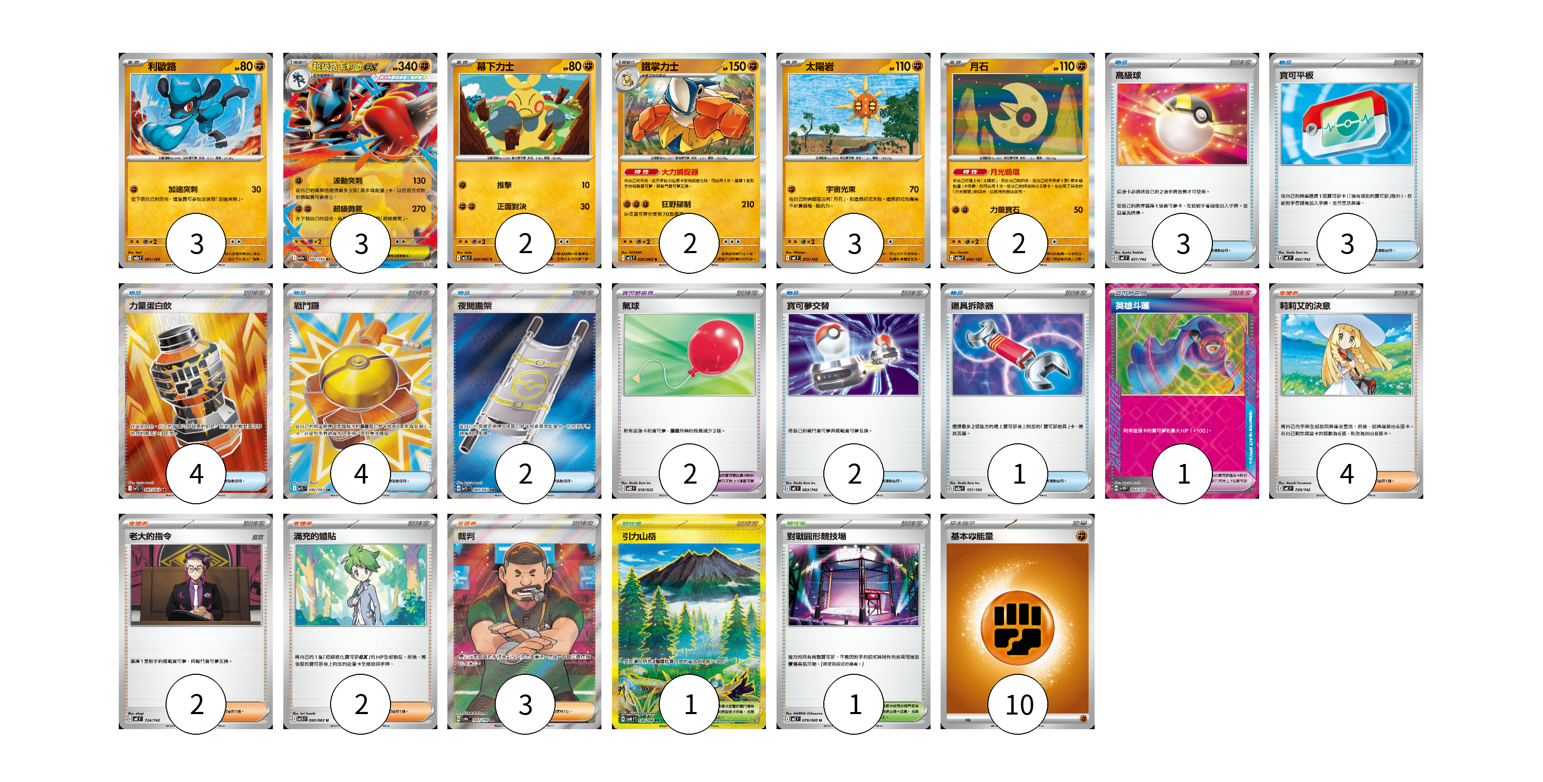 牌組構築方案 以此牌組為基礎新構築牌組 顯示卡面 顯示列表 寶可夢卡(15) 3 3 2 2 3 2 寶可夢道具(1) 1 物品卡(21) 3 3 4 4 2 2 2 1 支援者卡(11) 4 2 2 3 競技場卡(2) 1 1 能量卡(10) 10 寶可夢卡(15) 卡牌名稱 張數 卡牌名稱 張數 利歐路 M2a 091/193 03 超級路卡利歐ex M2a 092/193 03 幕下力士 M1L 024/063 02 鐵掌力士 M1L 025/063 02 太陽岩 MC 372/742 03 月石 M2a 086/193 02 寶可夢道具(1) 卡牌名稱 張數 卡牌名稱 張數 英雄斗篷 SV5M 064/071 01 物品卡(21) 卡牌名稱 張數 卡牌名稱 張數 高級球 MC 651/742 03 寶可平板 MC 662/742 03 力量蛋白飲 M1L 081/063 04 戰鬥鑼 M1L 082/063 04 夜間擔架 M1L 083/063 02 氣球 MBD 018/022 02 寶可夢交替 MC 663/742 02 道具拆除器 M2a 151/193 01 支援者卡(11) 卡牌名稱 張數 卡牌名稱 張數 莉莉艾的決意 MC 729/742 04 老大的指令 MC 724/742 02 滿充的體貼 M1S 060/063 02 裁判 SV4a 342/190 03 競技場卡(2) 卡牌名稱 張數 卡牌名稱 張數 引力山岳 SV8 138/106 01 對戰圓形競技場 M2 079/080 01 能量卡(10) 卡牌名稱 張數 卡牌名稱 張數 基本【鬥】能量 MC FIG 10 以此牌組為基礎新構築牌組 牌組編碼 iwvOBt-GwoEEL-GZqRhW copy 列印牌組單 牌組編碼已複製 分享至SNS