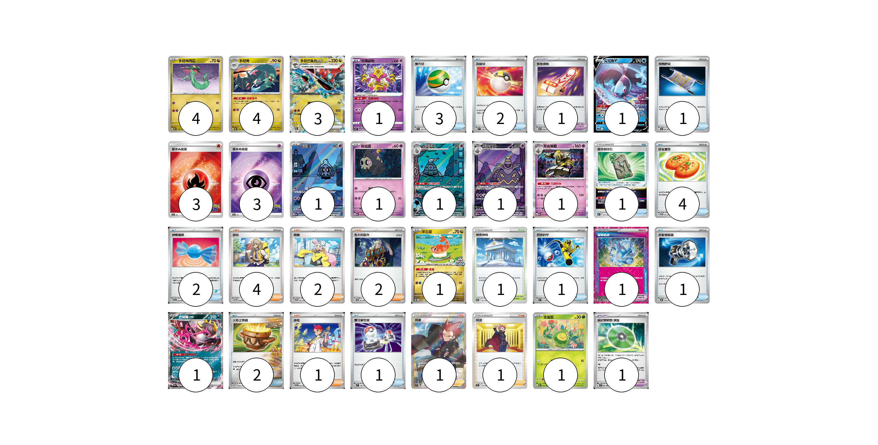 牌組構築方案 以此牌組為基礎新構築牌組 顯示卡面 顯示列表 寶可夢卡(21) 4 4 3 1 1 1 1 1 1 1 1 1 1 寶可夢道具(3) 1 1 1 物品卡(18) 3 2 1 1 4 2 1 1 2 1 支援者卡(11) 4 2 2 1 1 1 競技場卡(1) 1 能量卡(6) 3 3 寶可夢卡(21) 卡牌名稱 張數 卡牌名稱 張數 多龍梅西亞 SV8a 118/187 04 多龍奇 SV8a 119/187 04 多龍巴魯托ex SV8a 120/187 03 光輝胡地 SVTM 006/022 01 霓虹魚V SVHK 004/022 01 夜巡靈 SV6a 068/064 01 夜巡靈 SV6a 018/064 01 彷徨夜靈 SV6a 069/064 01 黑夜魔靈 SV6a 070/064 01 黑夜魔靈 SV6a 020/064 01 米立龍 SV-P 186/SV-P 01 吉雉雞ex SV8a 104/187 01 含羞苞 SV8a 001/187 01 寶可夢道具(3) 卡牌名稱 張數 卡牌名稱 張數 緊急滑板 SV5K 064/071 01 璀璨結晶 SV7 094/102 01 招式學習器 演進 SV4M 063/066 01 物品卡(18) 卡牌名稱 張數 卡牌名稱 張數 巢穴球 SVM 133/175 03 高級球 SVM 134/175 02 夜間擔架 SV6a 056/064 01 森林封印石 SVF 024/038 01 好友寶芬 SVTG 011/019 04 神奇糖果 SVI 053/066 02 厲害釣竿 SVK 011/042 01 反擊捕捉器 SV8a 139/187 01 大地之容器 SV-P 084/SV-P 02 寶可夢交替 SVM 136/175 01 支援者卡(11) 卡牌名稱 張數 卡牌名稱 張數 派帕 SVTM 019/022 04 奇樹 SVTG 017/019 02 老大的指令 SVF 032/038 02 赤松 SV7 097/102 01 阿渡 S12 114/098 01 阿渡 S12 096/098 01 競技場卡(1) 卡牌名稱 張數 卡牌名稱 張數 神奧神殿 S10P 067/067 01 能量卡(6) 卡牌名稱 張數 卡牌名稱 張數 基本火能量 S10b FIR 03 基本超能量 S10b PSY 03 以此牌組為基礎新構築牌組 牌組編碼 ixacZD-ulVxzc-psVgnS copy 列印牌組單 牌組編碼已複製 分享至SNS