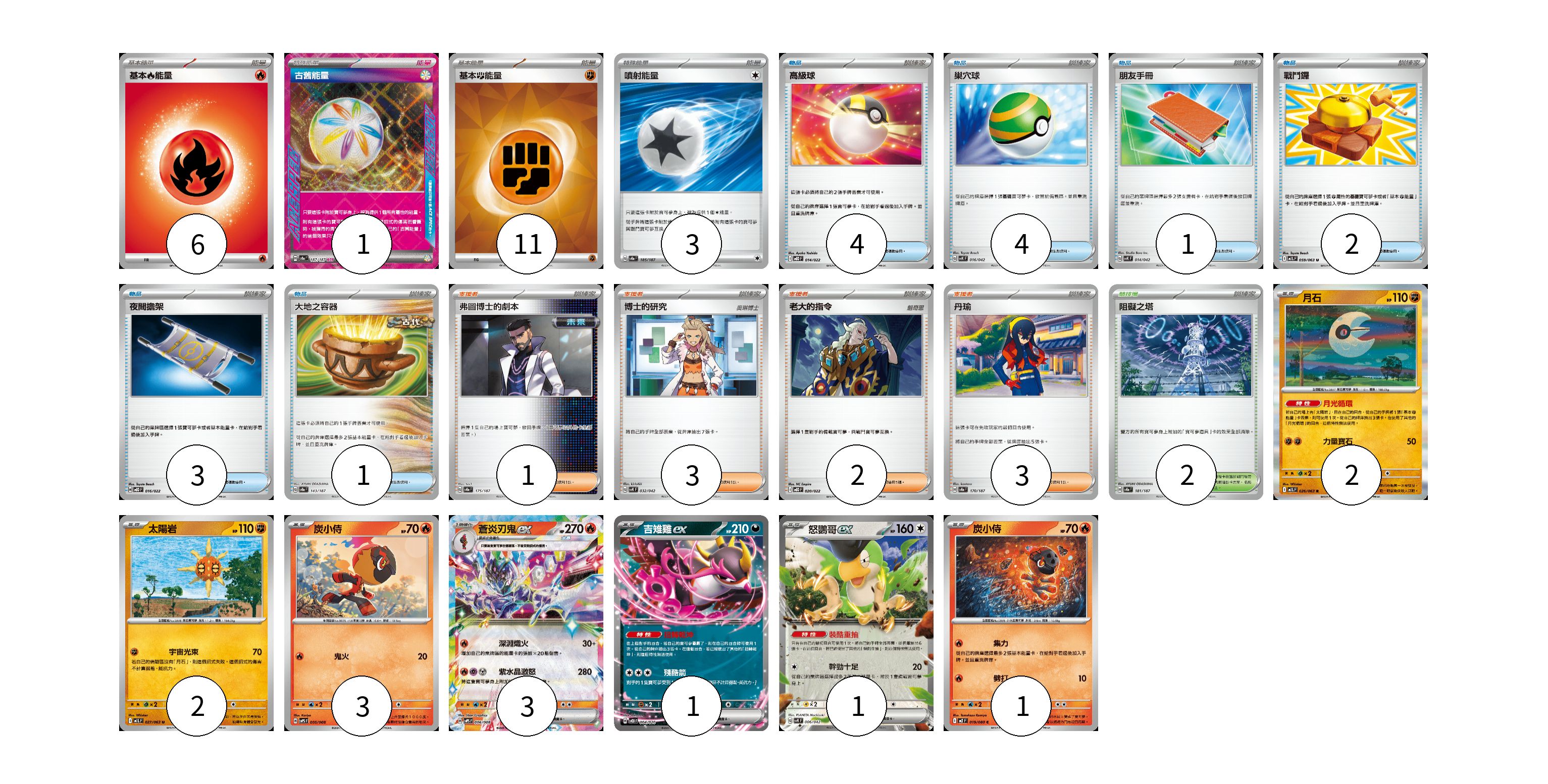牌組構築方案 以此牌組為基礎新構築牌組 顯示卡面 顯示列表 寶可夢卡(13) 2 2 3 3 1 1 1 物品卡(15) 4 4 1 2 3 1 支援者卡(9) 1 3 2 3 競技場卡(2) 2 能量卡(21) 6 1 11 3 寶可夢卡(13) 卡牌名稱 張數 卡牌名稱 張數 月石 M1L 026/063 02 太陽岩 M1L 027/063 02 炭小侍 SVPS 005/008 03 蒼炎刃鬼ex SVPS 006/008 03 吉雉雞ex SVOD 004/020 01 怒鸚哥ex SVK 006/042 01 炭小侍 M2 019/080 01 物品卡(15) 卡牌名稱 張數 卡牌名稱 張數 高級球 MBD 014/022 04 巢穴球 SVK 016/042 04 朋友手冊 SVK 014/042 01 戰鬥鑼 M1L 059/063 02 夜間擔架 MBD 016/022 03 大地之容器 SV8a 143/187 01 支援者卡(9) 卡牌名稱 張數 卡牌名稱 張數 弗圖博士的劇本 SV8a 175/187 01 博士的研究 SVK 032/042 03 老大的指令 MBD 020/022 02 丹瑜 SV8a 170/187 03 競技場卡(2) 卡牌名稱 張數 卡牌名稱 張數 阻礙之塔 SV8a 181/187 02 能量卡(21) 卡牌名稱 張數 卡牌名稱 張數 基本【火】能量 M-P FIR 06 古舊能量 SV8a 187/187 01 基本【鬥】能量 SVK FIG 11 噴射能量 SV8a 185/187 03 以此牌組為基礎新構築牌組 牌組編碼 iyDNdR-qHyGYW-UxYXyJ copy 列印牌組單 牌組編碼已複製 分享至SNS