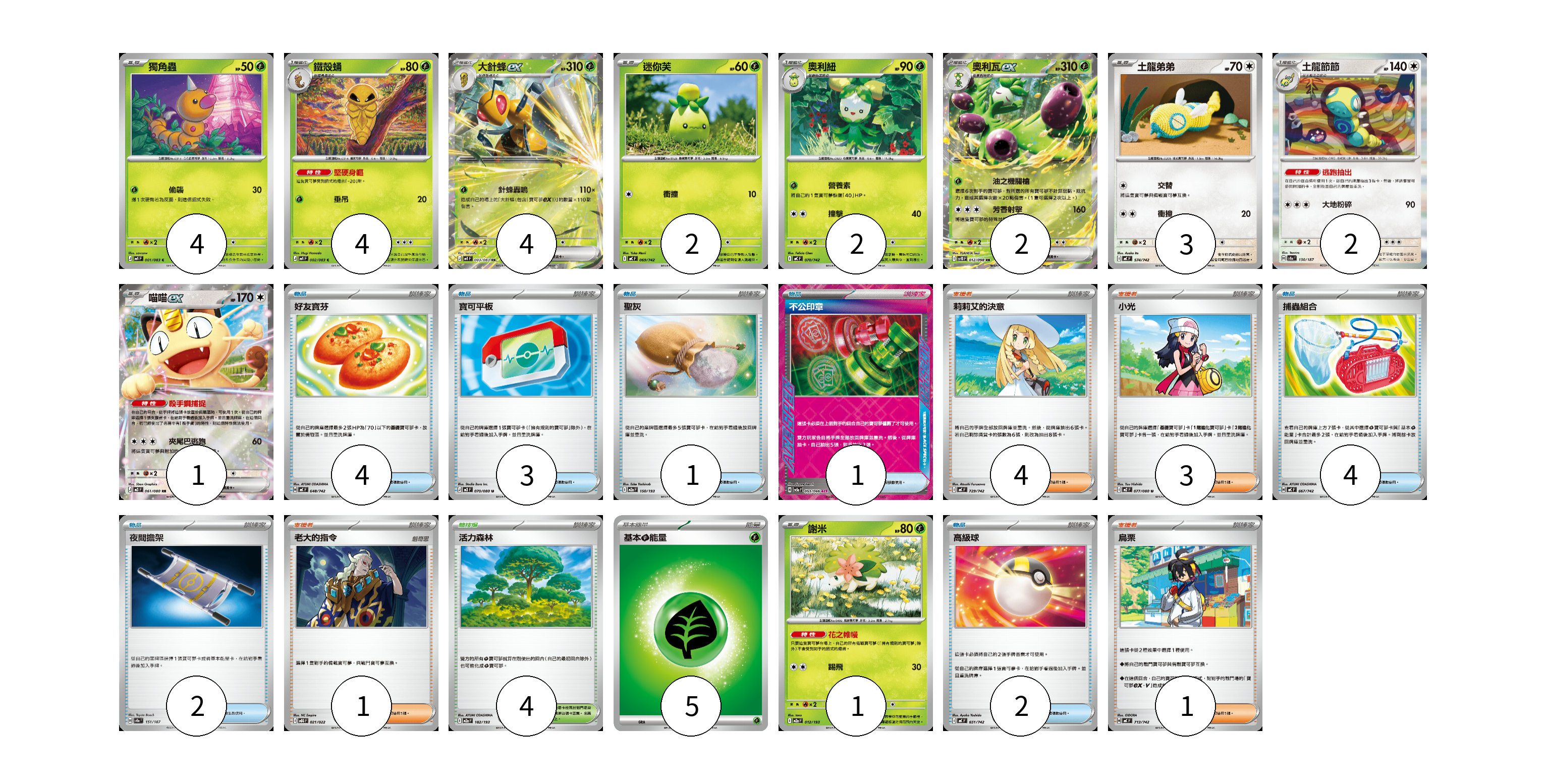 牌組構築方案 以此牌組為基礎新構築牌組 顯示卡面 顯示列表 寶可夢卡(25) 4 4 4 2 2 2 3 2 1 1 物品卡(17) 4 3 1 1 4 2 2 支援者卡(9) 4 3 1 1 競技場卡(4) 4 能量卡(5) 5 寶可夢卡(25) 卡牌名稱 張數 卡牌名稱 張數 獨角蟲 M4 001/083 04 鐵殼蛹 M4 002/083 04 大針蜂ex M4 003/083 04 迷你芙 MC 069/742 02 奧利紐 MC 070/742 02 奧利瓦ex SV10 012/098 02 土龍弟弟 MC 574/742 03 土龍節節 SV8a 130/187 02 喵喵ex M3 061/080 01 謝米 M2a 012/193 01 物品卡(17) 卡牌名稱 張數 卡牌名稱 張數 好友寶芬 MC 648/742 04 寶可平板 M3 070/080 03 聖灰 M2a 150/193 01 不公印章 SV5a 053/066 01 捕蟲組合 MC 667/742 04 夜間擔架 SV8a 151/187 02 高級球 MC 651/742 02 支援者卡(9) 卡牌名稱 張數 卡牌名稱 張數 莉莉艾的決意 MC 729/742 04 小光 M2 077/080 03 老大的指令 MBG 021/022 01 烏栗 MC 713/742 01 競技場卡(4) 卡牌名稱 張數 卡牌名稱 張數 活力森林 M2a 182/193 04 能量卡(5) 卡牌名稱 張數 卡牌名稱 張數 基本【草】能量 MJ GRA 05 以此牌組為基礎新構築牌組 牌組編碼 iyIoua-yCeKpl-eSnAFa copy 列印牌組單 牌組編碼已複製 分享至SNS