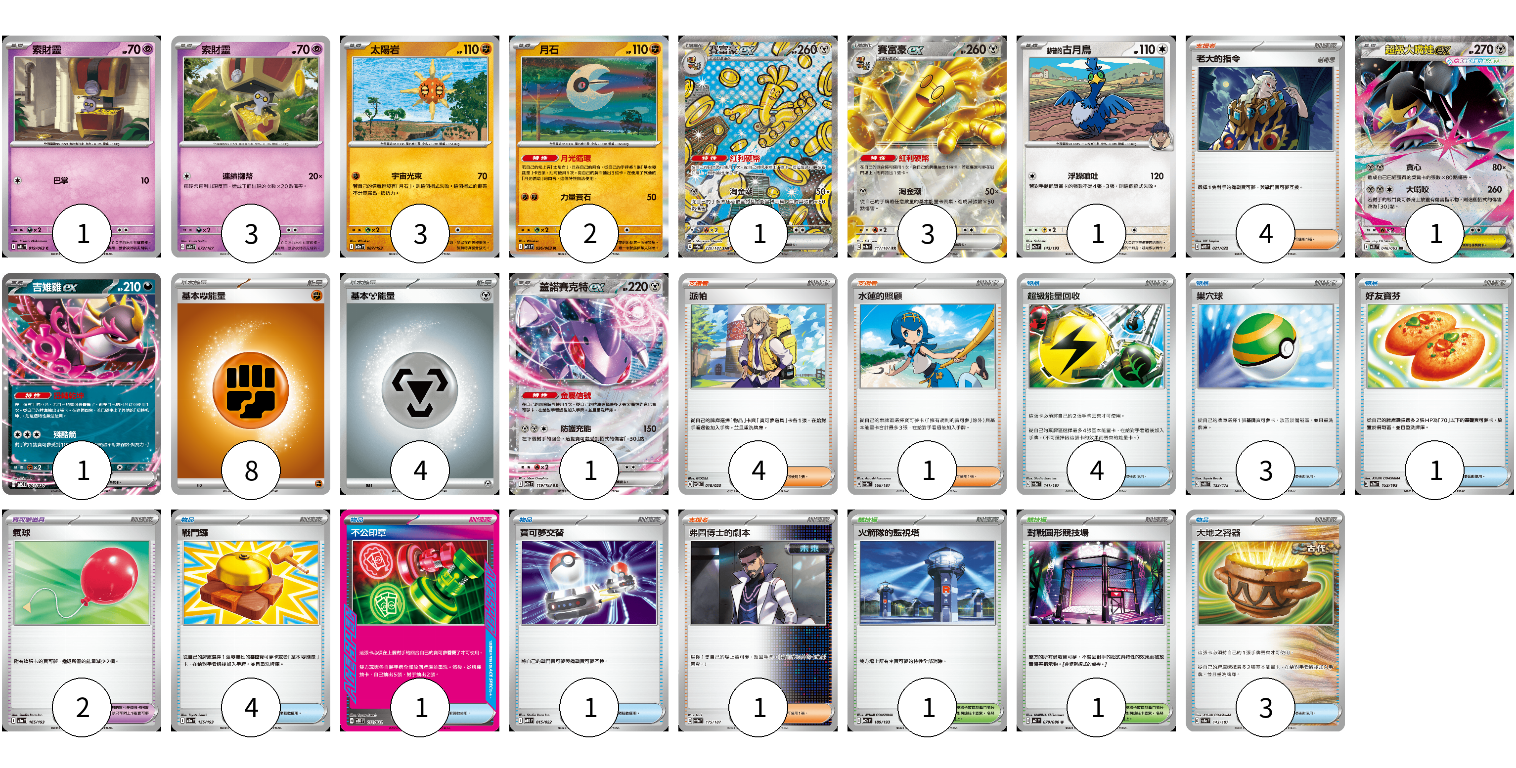 牌組構築方案 以此牌組為基礎新構築牌組 顯示卡面 顯示列表 寶可夢卡(17) 1 3 3 2 1 3 1 1 1 1 寶可夢道具(2) 2 物品卡(17) 4 3 1 4 1 1 3 支援者卡(10) 4 4 1 1 競技場卡(2) 1 1 能量卡(12) 8 4 寶可夢卡(17) 卡牌名稱 張數 卡牌名稱 張數 索財靈 M1L 019/063 01 索財靈 SV8a 073/187 03 太陽岩 M2a 087/193 03 月石 M1L 026/063 02 賽富豪ex SV8a 220/187 01 賽富豪ex SV8a 117/187 03 赫普的古月鳥 M2a 143/193 01 超級大嘴娃ex M1L 046/063 01 吉雉雞ex SVOD 004/020 01 蓋諾賽克特ex M2a 119/193 01 寶可夢道具(2) 卡牌名稱 張數 卡牌名稱 張數 氣球 M2a 165/193 02 物品卡(17) 卡牌名稱 張數 卡牌名稱 張數 超級能量回收 SV8a 141/187 04 巢穴球 SVM 133/175 03 好友寶芬 M2a 153/193 01 戰鬥鑼 M2a 155/193 04 不公印章 MBD 011/022 01 寶可夢交替 MBG 015/022 01 大地之容器 SV8a 143/187 03 支援者卡(10) 卡牌名稱 張數 卡牌名稱 張數 老大的指令 MBG 021/022 04 派帕 SVOD 018/020 04 水蓮的照顧 SV8a 168/187 01 弗圖博士的劇本 SV8a 175/187 01 競技場卡(2) 卡牌名稱 張數 卡牌名稱 張數 火箭隊的監視塔 M2a 189/193 01 對戰圓形競技場 M2 079/080 01 能量卡(12) 卡牌名稱 張數 卡牌名稱 張數 基本【鬥】能量 M-P FIG 08 基本【鋼】能量 M-P MET 04 以此牌組為基礎新構築牌組 牌組編碼 jCiYdF-owckHv-hDysTQ copy 列印牌組單 牌組編碼已複製 分享至SNS