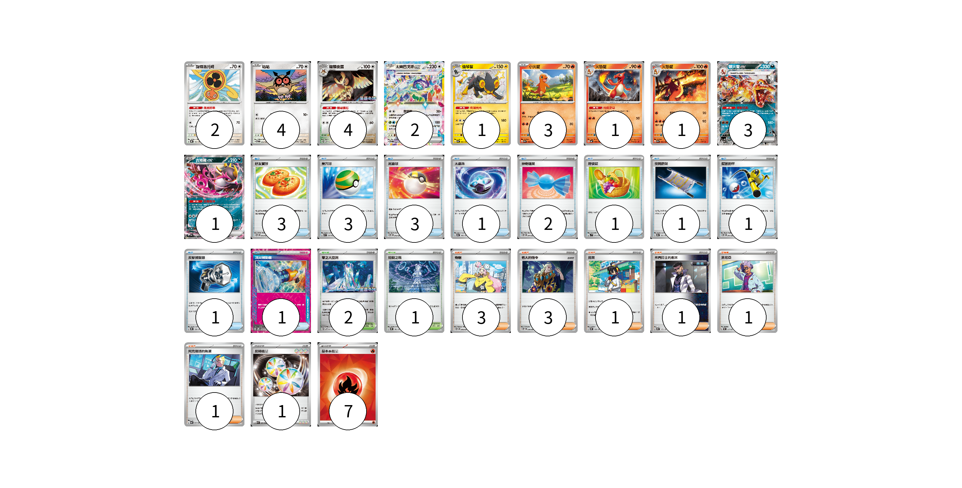 牌組構築方案 以此牌組為基礎新構築牌組 顯示卡面 顯示列表 寶可夢卡(22) 2 4 4 2 1 3 1 1 3 1 物品卡(17) 3 3 3 1 2 1 1 1 1 1 支援者卡(10) 3 3 1 1 1 1 競技場卡(3) 2 1 能量卡(8) 1 7 寶可夢卡(22) 卡牌名稱 張數 卡牌名稱 張數 旋轉洛托姆 SV8a 131/187 02 咕咕 SV7 076/102 04 貓頭夜鷹 SV-P 145/SV-P 04 太樂巴戈斯ex SV7 088/102 02 倫琴貓 SV4a 242/190 01 小火龍 SV2a 004/165 03 火恐龍 SV4a 026/190 01 火恐龍 SV2a 005/165 01 噴火龍ex SV4a 115/190 03 吉雉雞ex SV6a 038/064 01 物品卡(17) 卡牌名稱 張數 卡牌名稱 張數 好友寶芬 SVOM 012/021 03 巢穴球 SVK 016/042 03 高級球 SVOM 013/021 03 太晶珠 SV8a 145/187 01 神奇糖果 SVOM 014/021 02 野餐籃 SV1V 071/078 01 夜間擔架 SV8a 151/187 01 厲害釣竿 SVOM 011/021 01 反擊捕捉器 SV8a 139/187 01 頂尖捕捉器 SV5M 062/071 01 支援者卡(10) 卡牌名稱 張數 卡牌名稱 張數 奇樹 SVOM 018/021 03 老大的指令 SVOD 019/020 03 烏栗 SV8a 169/187 01 弗圖博士的劇本 SV8a 175/187 01 吉尼亞 SVAL 017/021 01 阿克羅瑪的執著 SV6a 059/064 01 競技場卡(3) 卡牌名稱 張數 卡牌名稱 張數 零之大空洞 SV-P 151/SV-P 02 阻礙之塔 SV8a 181/187 01 能量卡(8) 卡牌名稱 張數 卡牌名稱 張數 反轉能量 SVK 041/042 01 基本【火】能量 SVK FIR 07 以此牌組為基礎新構築牌組 牌組編碼 jCysTn-sTgcmu-ZjVXJb copy 列印牌組單 牌組編碼已複製 分享至SNS