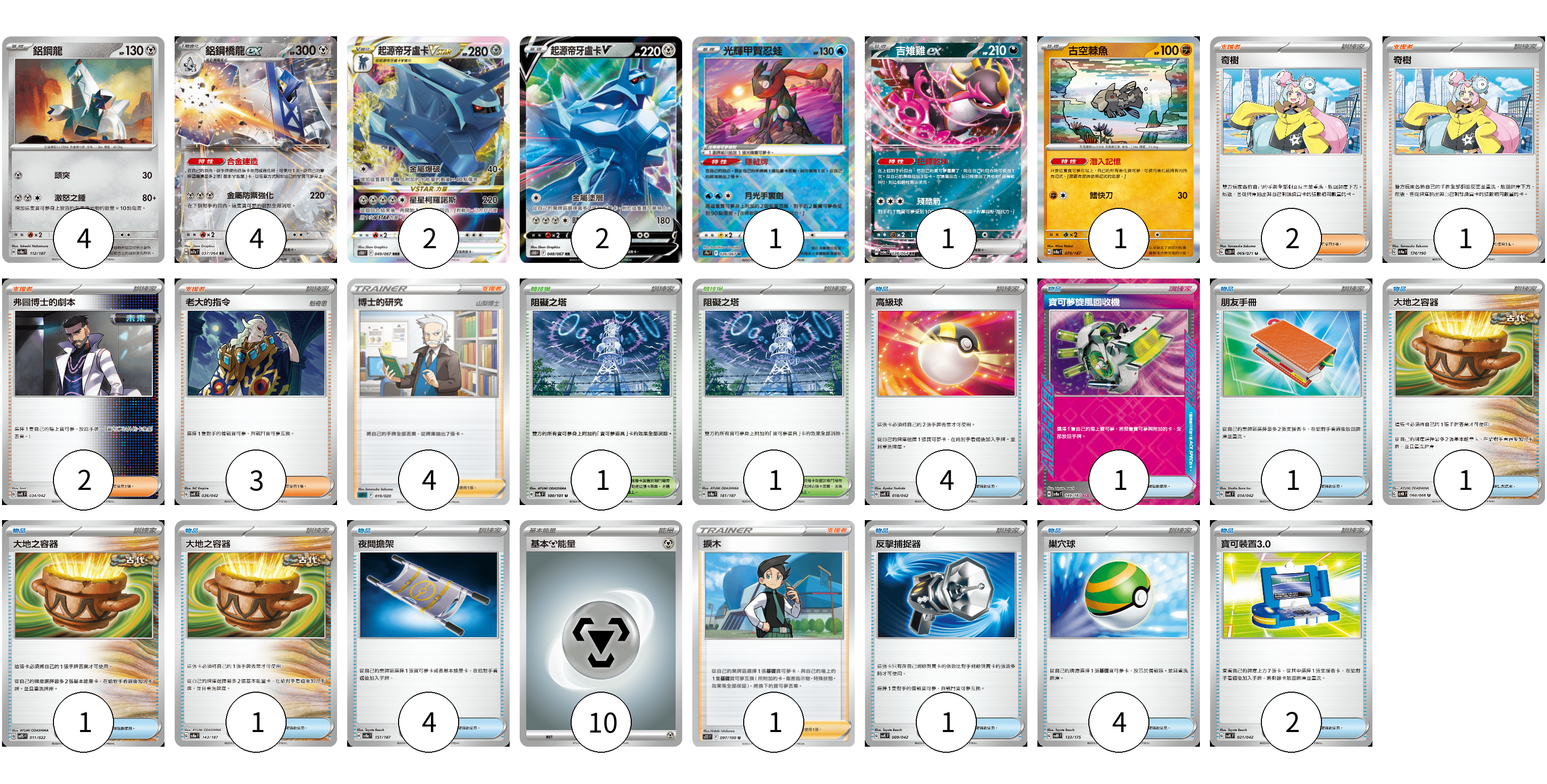 牌組構築方案 以此牌組為基礎新構築牌組 顯示卡面 顯示列表 寶可夢卡(15) 4 4 2 2 1 1 1 物品卡(20) 4 1 1 1 1 1 4 1 4 2 支援者卡(13) 2 1 2 3 4 1 競技場卡(2) 1 1 能量卡(10) 10 寶可夢卡(15) 卡牌名稱 張數 卡牌名稱 張數 鋁鋼龍 SV8a 112/187 04 鋁鋼橋龍ex SV7a 037/064 04 起源帝牙盧卡VSTAR S10D 049/067 02 起源帝牙盧卡V S10D 048/067 02 光輝甲賀忍蛙 S9a 026/067 01 吉雉雞ex SV6a 038/064 01 古空棘魚 SV8a 079/187 01 物品卡(20) 卡牌名稱 張數 卡牌名稱 張數 高級球 SVK 018/042 04 寶可夢旋風回收機 SV8a 149/187 01 朋友手冊 SVK 014/042 01 大地之容器 SV4K 060/066 01 大地之容器 SVTS 011/022 01 大地之容器 SV8a 143/187 01 夜間擔架 SV8a 151/187 04 反擊捕捉器 SVK 009/042 01 巢穴球 SVM 133/175 04 寶可裝置3.0 SVK 021/042 02 支援者卡(13) 卡牌名稱 張數 卡牌名稱 張數 奇樹 SV2D 069/071 02 奇樹 SV4a 174/190 01 弗圖博士的劇本 SVK 034/042 02 老大的指令 SVK 036/042 03 博士的研究(山梨博士) SLD 019/020 04 捩木 S11 097/100 01 競技場卡(2) 卡牌名稱 張數 卡牌名稱 張數 阻礙之塔 SV6 100/101 01 阻礙之塔 SV8a 181/187 01 能量卡(10) 卡牌名稱 張數 卡牌名稱 張數 基本鋼能量 sv-p MET 10 以此牌組為基礎新構築牌組 牌組編碼 jHKoqj-yUICCj-UyarQO copy 列印牌組單 牌組編碼已複製 分享至SNS