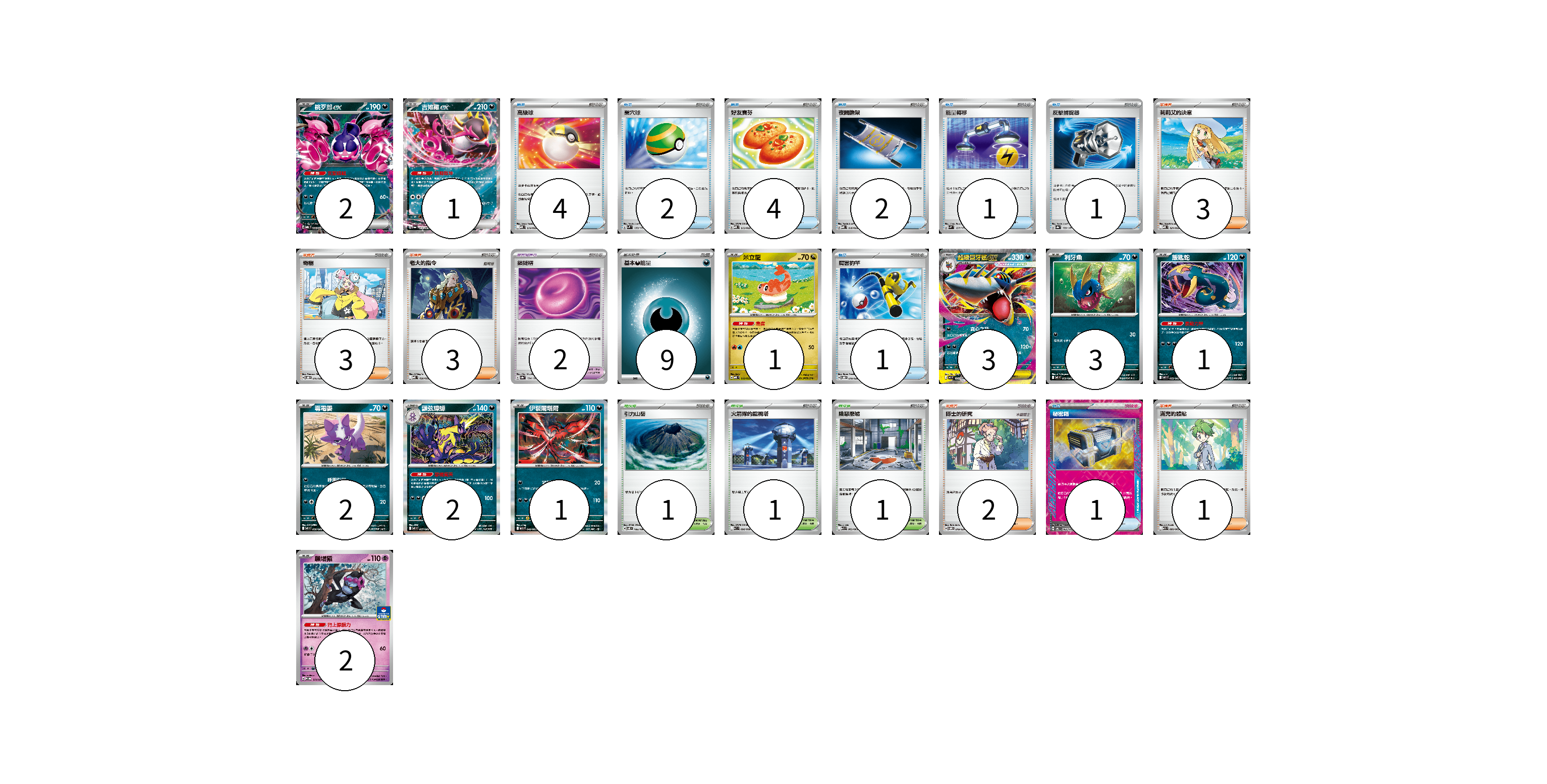 牌組構築方案 以此牌組為基礎新構築牌組 顯示卡面 顯示列表 寶可夢卡(18) 2 1 1 3 3 1 2 2 1 2 寶可夢道具(2) 2 物品卡(16) 4 2 4 2 1 1 1 1 支援者卡(12) 3 3 3 2 1 競技場卡(3) 1 1 1 能量卡(9) 9 寶可夢卡(18) 卡牌名稱 張數 卡牌名稱 張數 桃歹郎ex MBG 009/022 02 吉雉雞ex SV6a 038/064 01 米立龍 MBD 010/022 01 超級巨牙鯊ex M2 051/080 03 利牙魚 M2 050/080 03 飯匙蛇 M2 052/080 01 毒電嬰 M2 056/080 02 顫弦蠑螈 M2 057/080 02 伊裴爾塔爾 M1L 040/063 01 願增猿 M-P 014/M-P 02 寶可夢道具(2) 卡牌名稱 張數 卡牌名稱 張數 鎖鏈糬 SV8a 154/187 02 物品卡(16) 卡牌名稱 張數 卡牌名稱 張數 高級球 MBD 014/022 04 巢穴球 SVM 133/175 02 好友寶芬 MBD 013/022 04 夜間擔架 MBD 016/022 02 能量轉移 SVM 127/175 01 反擊捕捉器 SV8a 139/187 01 厲害釣竿 SVOD 010/020 01 秘密箱 SV6 092/101 01 支援者卡(12) 卡牌名稱 張數 卡牌名稱 張數 莉莉艾的決意 MBD 021/022 03 奇樹 SVOD 016/020 03 老大的指令 MBD 020/022 03 博士的研究 SVOM 019/021 02 滿充的體貼 M1S 060/063 01 競技場卡(3) 卡牌名稱 張數 卡牌名稱 張數 引力山岳 SV8 106/106 01 火箭隊的監視塔 SV10 096/098 01 險惡廢墟 M1L 063/063 01 能量卡(9) 卡牌名稱 張數 卡牌名稱 張數 基本【惡】能量 MBG DAR 09 以此牌組為基礎新構築牌組 牌組編碼 jJCJPl-blaMke-BwVqGJ copy 列印牌組單 牌組編碼已複製 分享至SNS