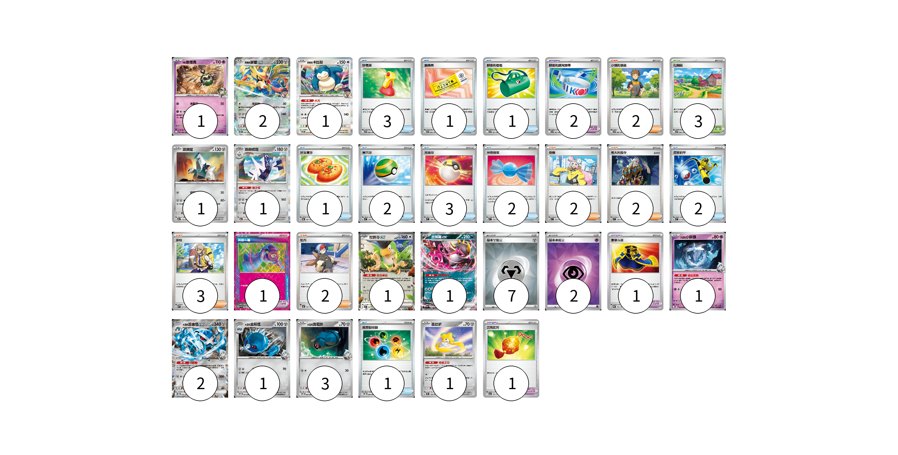 牌組構築方案 以此牌組為基礎新構築牌組 顯示卡面 顯示列表 寶可夢卡(16) 1 2 1 1 1 1 1 1 2 1 3 1 寶可夢道具(5) 2 1 1 1 物品卡(16) 3 1 1 1 2 3 2 2 1 支援者卡(11) 2 2 2 3 2 競技場卡(3) 3 能量卡(9) 7 2 寶可夢卡(16) 卡牌名稱 張數 卡牌名稱 張數 N的象徵鳥 SV9 040/100 01 赫普的蒼響ex SV9 069/100 02 赫普的卡比獸 SV9 075/100 01 鋁鋼龍 SV8a 112/187 01 鋁鋼橋龍 SV8a 113/187 01 怒鸚哥ex SVK 006/042 01 吉雉雞ex SV6a 038/064 01 <大吾的>小碎鑽 SVOD 003/020 01 <大吾的>巨金怪ex SVOD 008/020 02 <大吾的>金屬怪 SVOD 007/020 01 <大吾的>鐵啞鈴 SVOD 006/020 03 基拉祈 SV8a 108/187 01 寶可夢道具(5) 卡牌名稱 張數 卡牌名稱 張數 赫普的講究頭帶 SV9 092/100 02 英雄斗篷 SV5M 064/071 01 豪華斗篷 SV8a 155/187 01 勇氣護符 SV4a 169/190 01 物品卡(16) 卡牌名稱 張數 卡牌名稱 張數 好傷藥 SV9 088/100 03 調換票 SV9 090/100 01 赫普的包包 SV9 091/100 01 好友寶芬 SV8a 147/187 01 巢穴球 SVM 133/175 02 高級球 SVM 134/175 03 神奇糖果 SVM 135/175 02 厲害釣竿 SVK 011/042 02 能量回收器 SVOD 009/020 01 支援者卡(11) 卡牌名稱 張數 卡牌名稱 張數 小剛的發掘 SV9 096/100 02 奇樹 SVM 160/175 02 老大的指令 SVM 172/175 02 派帕 SVK 035/042 03 牡丹 SV4a 182/190 02 競技場卡(3) 卡牌名稱 張數 卡牌名稱 張數 化朗鎮 SV9 099/100 03 能量卡(9) 卡牌名稱 張數 卡牌名稱 張數 基本【鋼】能量 SVK MET 07 基本【超】能量 SVK PSY 02 以此牌組為基礎新構築牌組 牌組編碼 jKZvaE-WMQutl-heFIpo copy 列印牌組單 牌組編碼已複製 分享至SNS