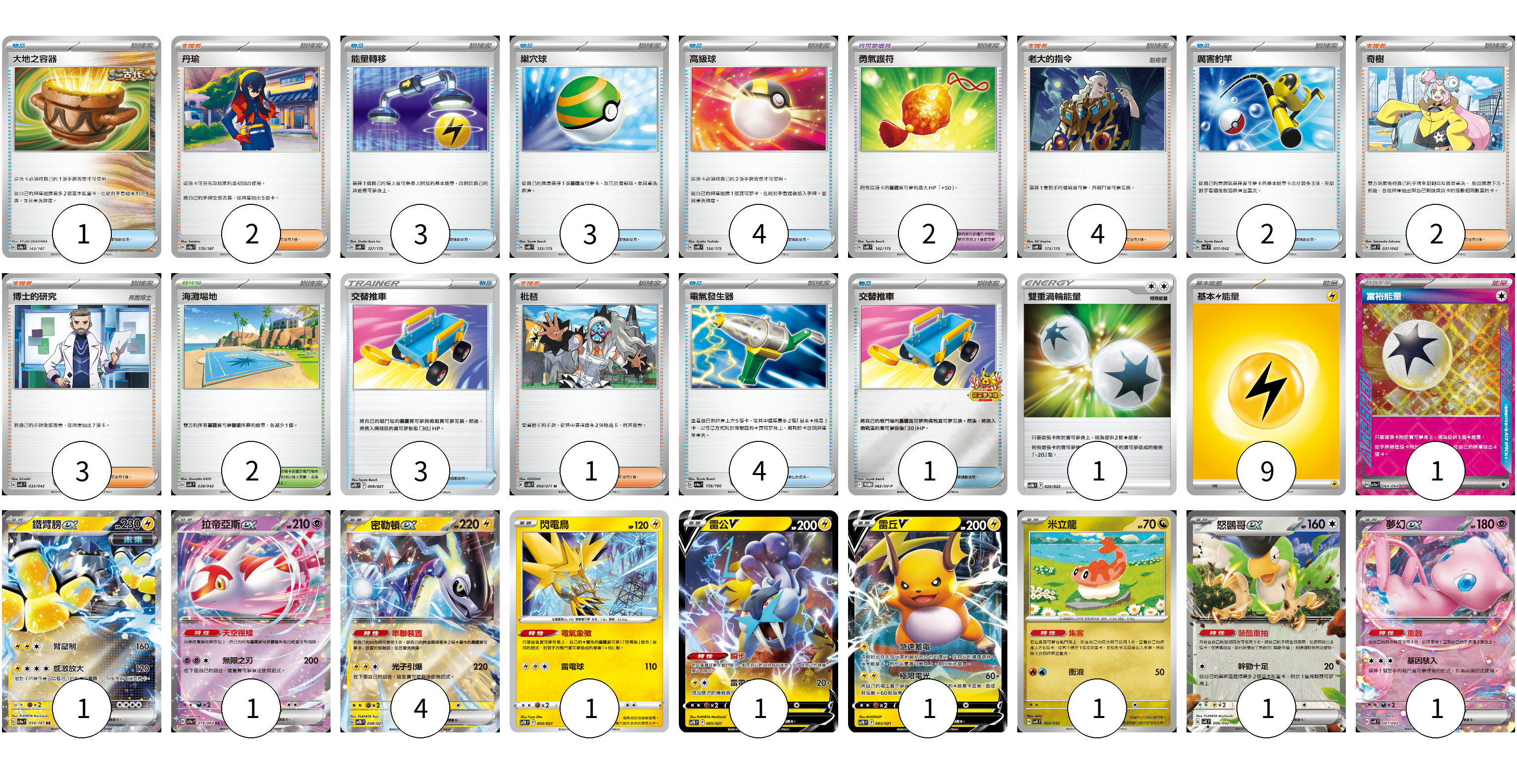 牌組構築方案 以此牌組為基礎新構築牌組 顯示卡面 顯示列表 寶可夢卡(12) 1 1 4 1 1 1 1 1 1 寶可夢道具(2) 2 物品卡(21) 1 3 3 4 2 3 4 1 支援者卡(12) 2 4 2 3 1 競技場卡(2) 2 能量卡(11) 1 9 1 寶可夢卡(12) 卡牌名稱 張數 卡牌名稱 張數 鐵臂膀ex SV8a 054/187 01 拉帝亞斯ex SV7a 019/064 01 密勒頓ex SVTR 008/021 04 閃電鳥 SVTR 004/021 01 雷公V SVTR 005/021 01 雷丘V SVTR 003/021 01 米立龍 SVK 002/042 01 怒鸚哥ex SVK 006/042 01 夢幻ex SVK 001/042 01 寶可夢道具(2) 卡牌名稱 張數 卡牌名稱 張數 勇氣護符 SVM 142/175 02 物品卡(21) 卡牌名稱 張數 卡牌名稱 張數 大地之容器 SV8a 143/187 01 能量轉移 SVM 127/175 03 巢穴球 SVM 133/175 03 高級球 SVM 134/175 04 厲害釣竿 SVK 011/042 02 交替推車 SVTR 009/021 03 電氣發生器 SV4a 156/190 04 交替推車 SV-P 082/SV-P 01 支援者卡(12) 卡牌名稱 張數 卡牌名稱 張數 丹瑜 SV8a 170/187 02 老大的指令 SVM 172/175 04 奇樹 SVK 031/042 02 博士的研究 SVK 033/042 03 枇琶 SV5K 068/071 01 競技場卡(2) 卡牌名稱 張數 卡牌名稱 張數 海灘場地 SVK 038/042 02 能量卡(11) 卡牌名稱 張數 卡牌名稱 張數 雙重渦輪能量 SVTM 022/022 01 基本【雷】能量 SVHM LIG 09 富裕能量 SV7a 064/064 01 以此牌組為基礎新構築牌組 牌組編碼 jNjIuw-BdyGMr-gFKfgd copy 列印牌組單 牌組編碼已複製 分享至SNS