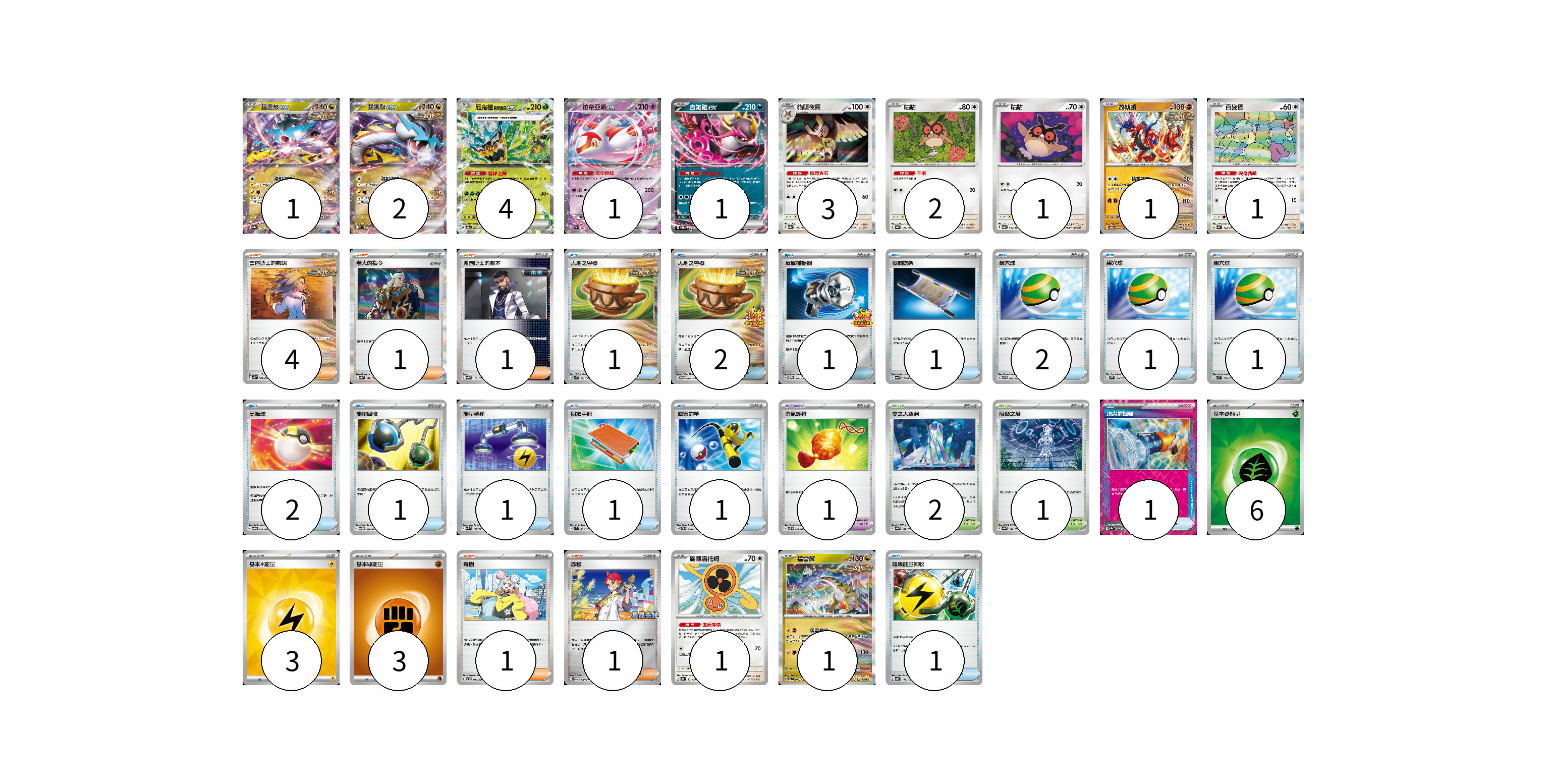 牌組構築方案 以此牌組為基礎新構築牌組 顯示卡面 顯示列表 寶可夢卡(19) 1 2 4 1 1 3 2 1 1 1 1 1 寶可夢道具(1) 1 物品卡(17) 1 2 1 1 2 1 1 2 1 1 1 1 1 1 支援者卡(8) 4 1 1 1 1 競技場卡(3) 2 1 能量卡(12) 6 3 3 寶可夢卡(19) 卡牌名稱 張數 卡牌名稱 張數 猛雷鼓ex SV8a 124/187 01 猛雷鼓ex SV5K 053/071 02 厄鬼椪 碧草面具ex SV6 016/101 04 拉帝亞斯ex SV7a 019/064 01 吉雉雞ex SVOD 004/020 01 貓頭夜鷹 SV8a 128/187 03 咕咕 SV8a 127/187 02 咕咕 SV5K 054/071 01 故勒頓 SV8 069/106 01 百變怪 SV4a 144/190 01 旋轉洛托姆 SV8a 131/187 01 猛雷鼓 SV7 075/102 01 寶可夢道具(1) 卡牌名稱 張數 卡牌名稱 張數 勇氣護符 SVTS 017/022 01 物品卡(17) 卡牌名稱 張數 卡牌名稱 張數 大地之容器 SVK 012/042 01 大地之容器 SV-P 084/SV-P 02 反擊捕捉器 SV-P 083/SV-P 01 夜間擔架 SV6a 056/064 01 巢穴球 SVTG 012/019 02 巢穴球 SVAW 014/023 01 巢穴球 SV1S 070/078 01 高級球 SVOD 012/020 02 能量回收 SVTM 009/022 01 能量轉移 SVM 127/175 01 朋友手冊 SV1S 069/078 01 厲害釣竿 SVTH 008/018 01 頂尖捕捉器 SV8a 148/187 01 超級能量回收 SV8a 141/187 01 支援者卡(8) 卡牌名稱 張數 卡牌名稱 張數 奧琳博士的氣魄 SV4K 064/066 04 老大的指令 SV4a 181/190 01 弗圖博士的劇本 SV8a 175/187 01 奇樹 SVTG 017/019 01 赤松 SV-P 150/SV-P 01 競技場卡(3) 卡牌名稱 張數 卡牌名稱 張數 零之大空洞 SV8a 182/187 02 阻礙之塔 SV8a 181/187 01 能量卡(12) 卡牌名稱 張數 卡牌名稱 張數 基本【草】能量 SVK GRA 06 基本【雷】能量 SVK LIG 03 基本鬥能量 sv-p FIG 03 以此牌組為基礎新構築牌組 牌組編碼 jOnLKu-DMaBKk-DaEBIW copy 列印牌組單 牌組編碼已複製 分享至SNS