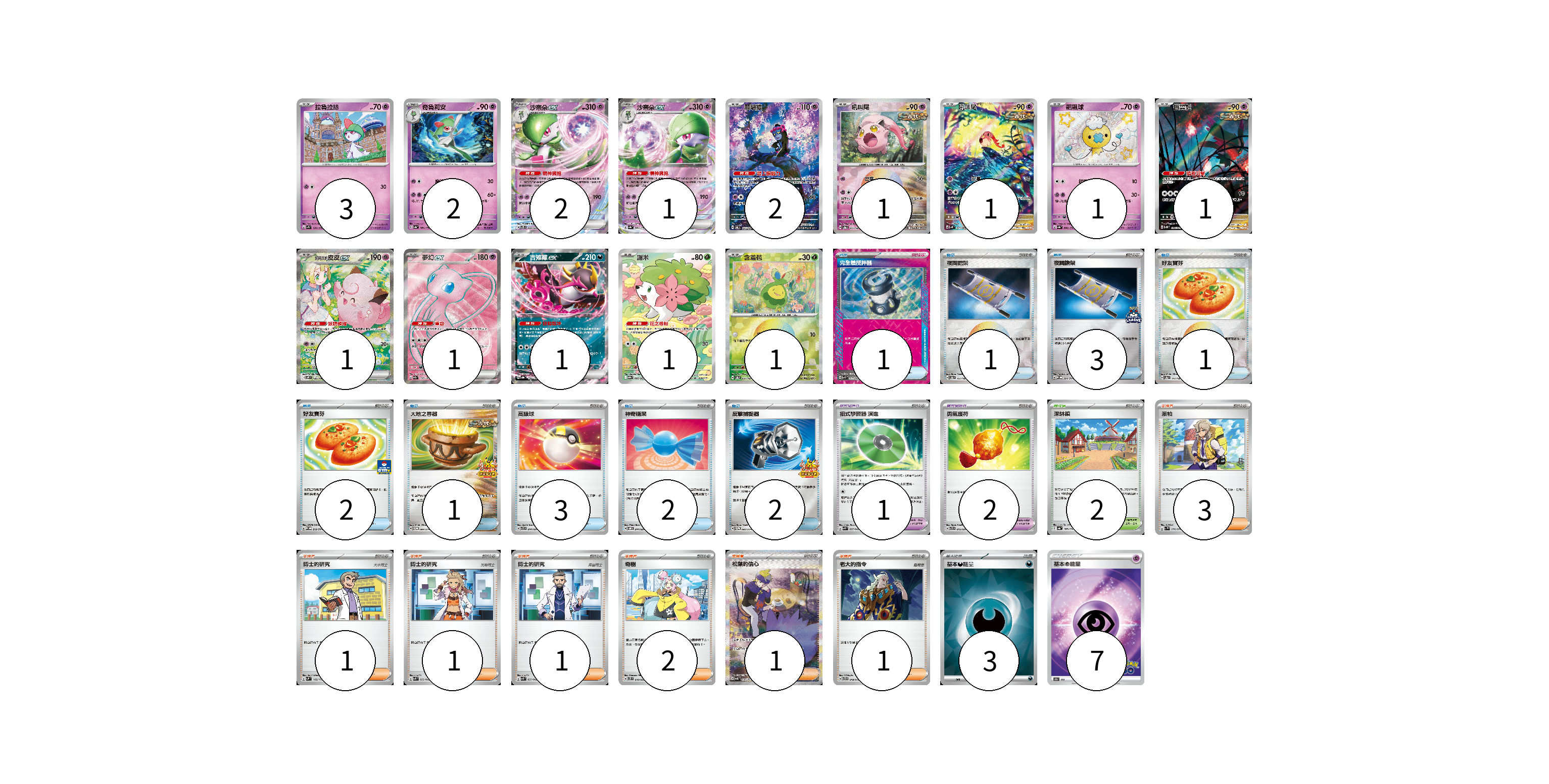 牌組構築方案 以此牌組為基礎新構築牌組 顯示卡面 顯示列表 寶可夢卡(19) 3 2 2 1 2 1 1 1 1 1 1 1 1 1 寶可夢道具(3) 1 2 物品卡(16) 1 1 3 1 2 1 3 2 2 支援者卡(10) 3 1 1 1 2 1 1 競技場卡(2) 2 能量卡(10) 3 7 寶可夢卡(19) 卡牌名稱 張數 卡牌名稱 張數 拉魯拉絲 SV1S 026/078 03 奇魯莉安 SV4a 081/190 02 沙奈朵ex SVTS 004/022 02 沙奈朵ex SV4a 082/190 01 願增猿 SV6 107/101 02 吼叫尾 SV8a 071/187 01 吼叫尾 SV4K 071/066 01 飄飄球 SV4a 260/190 01 振翼髮 SV5K 076/071 01 莉莉艾的皮皮ex SV9 126/100 01 夢幻ex SV2a 195/165 01 吉雉雞ex SV8a 104/187 01 謝米 SV9a 066/063 01 含羞苞 SV8a 001/187 01 寶可夢道具(3) 卡牌名稱 張數 卡牌名稱 張數 招式學習器 演進 SVK 025/042 01 勇氣護符 SVTR 015/021 02 物品卡(16) 卡牌名稱 張數 卡牌名稱 張數 完全體攪拌器 SVK 017/042 01 夜間擔架 SV8a 151/187 01 夜間擔架 SV-P 204/SV-P 03 好友寶芬 SV8a 147/187 01 好友寶芬 SV-P 212/SV-P 02 大地之容器 SV-P 084/SV-P 01 高級球 SVTR 014/021 03 神奇糖果 SVOM 014/021 02 反擊捕捉器 SV-P 083/SV-P 02 支援者卡(10) 卡牌名稱 張數 卡牌名稱 張數 派帕 SV1V 076/078 03 博士的研究 SVM 162/175 01 博士的研究 SVK 032/042 01 博士的研究 SVK 033/042 01 奇樹 SVTS 018/022 02 松葉的信心 SV5K 097/071 01 老大的指令 SVTG 019/019 01 競技場卡(2) 卡牌名稱 張數 卡牌名稱 張數 深缽鎮 SV4a 185/190 02 能量卡(10) 卡牌名稱 張數 卡牌名稱 張數 基本【惡】能量 SVOM DAR 03 基本超能量 S10b PSY 07 以此牌組為基礎新構築牌組 牌組編碼 jPauwM-kkVoMB-FoitHw copy 列印牌組單 牌組編碼已複製 分享至SNS