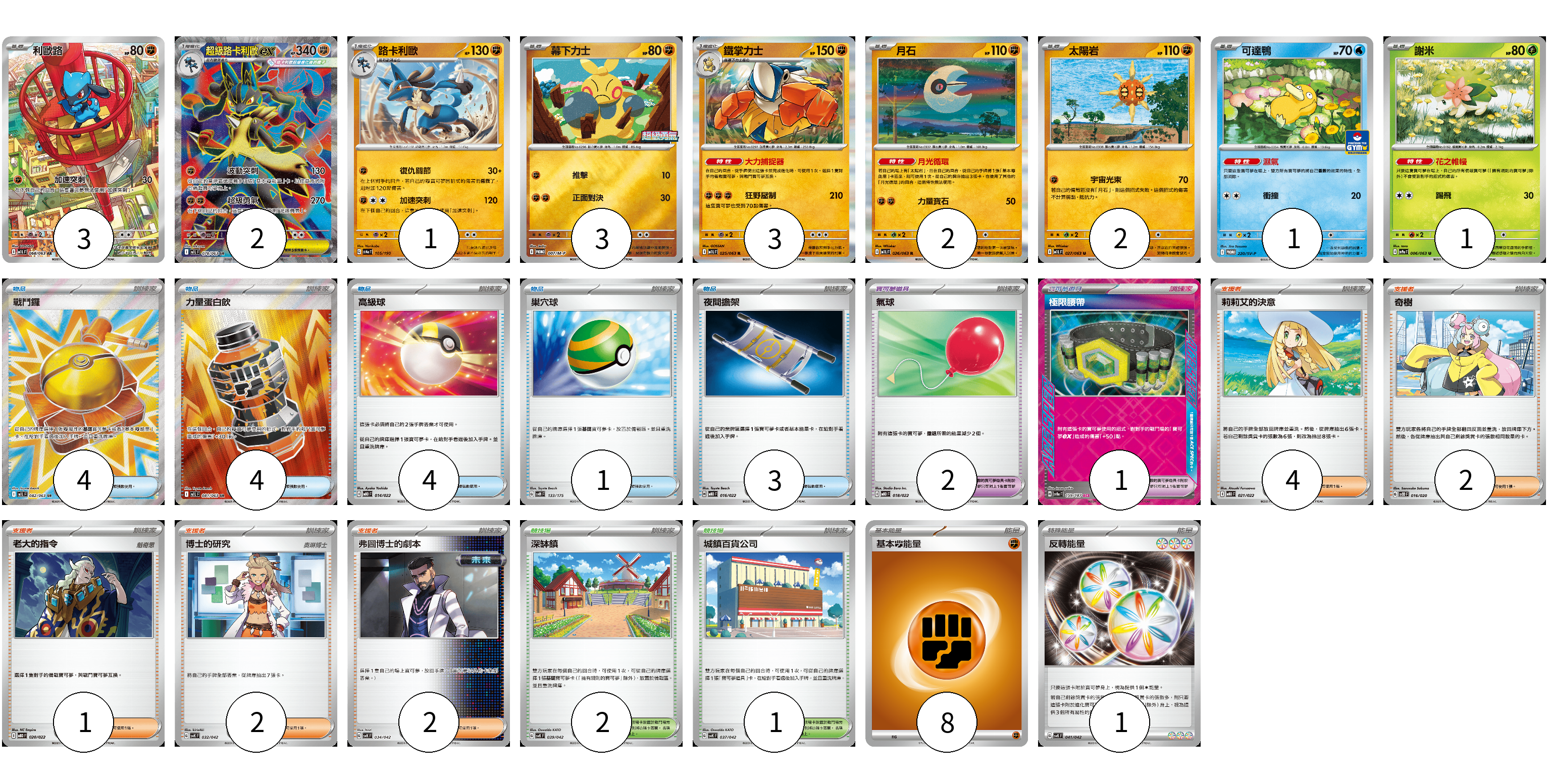 牌組構築方案 以此牌組為基礎新構築牌組 顯示卡面 顯示列表 寶可夢卡(18) 3 2 1 3 3 2 2 1 1 寶可夢道具(1) 1 物品卡(18) 4 4 4 1 3 2 支援者卡(11) 4 2 1 2 2 競技場卡(3) 2 1 能量卡(9) 8 1 寶可夢卡(18) 卡牌名稱 張數 卡牌名稱 張數 利歐路 M1L 068/063 03 超級路卡利歐ex M1L 078/063 02 路卡利歐 SV4a 105/190 01 幕下力士 M-P 007/M-P 03 鐵掌力士 M1L 025/063 03 月石 M1L 026/063 02 太陽岩 M1L 027/063 02 可達鴨 SV-P 220/SV-P 01 謝米 SV9a 006/063 01 寶可夢道具(1) 卡牌名稱 張數 卡牌名稱 張數 極限腰帶 SV8a 159/187 01 物品卡(18) 卡牌名稱 張數 卡牌名稱 張數 戰鬥鑼 M1L 082/063 04 力量蛋白飲 M1L 081/063 04 高級球 MBD 014/022 04 巢穴球 SVM 133/175 01 夜間擔架 MBD 016/022 03 氣球 MBD 018/022 02 支援者卡(11) 卡牌名稱 張數 卡牌名稱 張數 莉莉艾的決意 MBD 021/022 04 奇樹 SVOD 016/020 02 老大的指令 MBD 020/022 01 博士的研究 SVK 032/042 02 弗圖博士的劇本 SVK 034/042 02 競技場卡(3) 卡牌名稱 張數 卡牌名稱 張數 深缽鎮 SVK 039/042 02 城鎮百貨公司 SVK 037/042 01 能量卡(9) 卡牌名稱 張數 卡牌名稱 張數 基本鬥能量 sv-p FIG 08 反轉能量 SVK 041/042 01 以此牌組為基礎新構築牌組 牌組編碼 jRFyYx-xyfBGc-fMWSDW copy 列印牌組單 牌組編碼已複製 分享至SNS