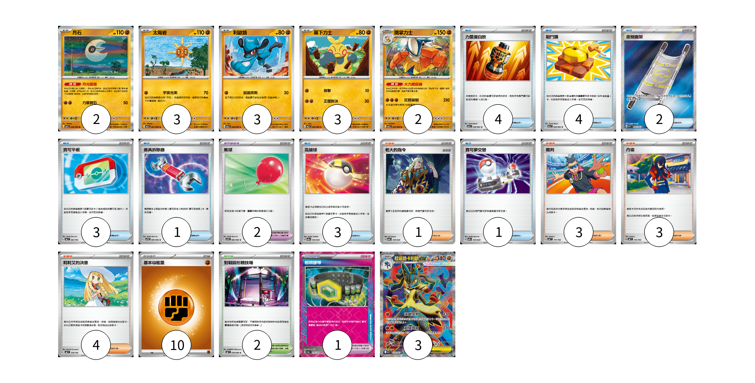 牌組構築方案 以此牌組為基礎新構築牌組 顯示卡面 顯示列表 寶可夢卡(16) 2 3 3 3 2 3 寶可夢道具(3) 2 1 物品卡(18) 4 4 2 3 1 3 1 支援者卡(11) 1 3 3 4 競技場卡(2) 2 能量卡(10) 10 寶可夢卡(16) 卡牌名稱 張數 卡牌名稱 張數 月石 M1L 026/063 02 太陽岩 M1L 027/063 03 利歐路 M1L 028/063 03 幕下力士 M1L 024/063 03 鐵掌力士 M1L 025/063 02 超級路卡利歐ex M1L 078/063 03 寶可夢道具(3) 卡牌名稱 張數 卡牌名稱 張數 氣球 SV11B 082/086 02 極限腰帶 SV8a 159/187 01 物品卡(18) 卡牌名稱 張數 卡牌名稱 張數 力量蛋白飲 M1L 058/063 04 戰鬥鑼 M1L 059/063 04 夜間擔架 M1L 083/063 02 寶可平板 MC 662/742 03 道具拆除器 SV11W 080/086 01 高級球 SVOD 012/020 03 寶可夢交替 SVOD 014/020 01 支援者卡(11) 卡牌名稱 張數 卡牌名稱 張數 老大的指令 SVOD 019/020 01 裁判 MC 711/742 03 丹瑜 MC 715/742 03 莉莉艾的決意 MC 729/742 04 競技場卡(2) 卡牌名稱 張數 卡牌名稱 張數 對戰圓形競技場 M2 079/080 02 能量卡(10) 卡牌名稱 張數 卡牌名稱 張數 基本【鬥】能量 MC FIG 10 以此牌組為基礎新構築牌組 牌組編碼 jSCTHf-JTqFdG-ydorPo copy 列印牌組單 牌組編碼已複製 分享至SNS