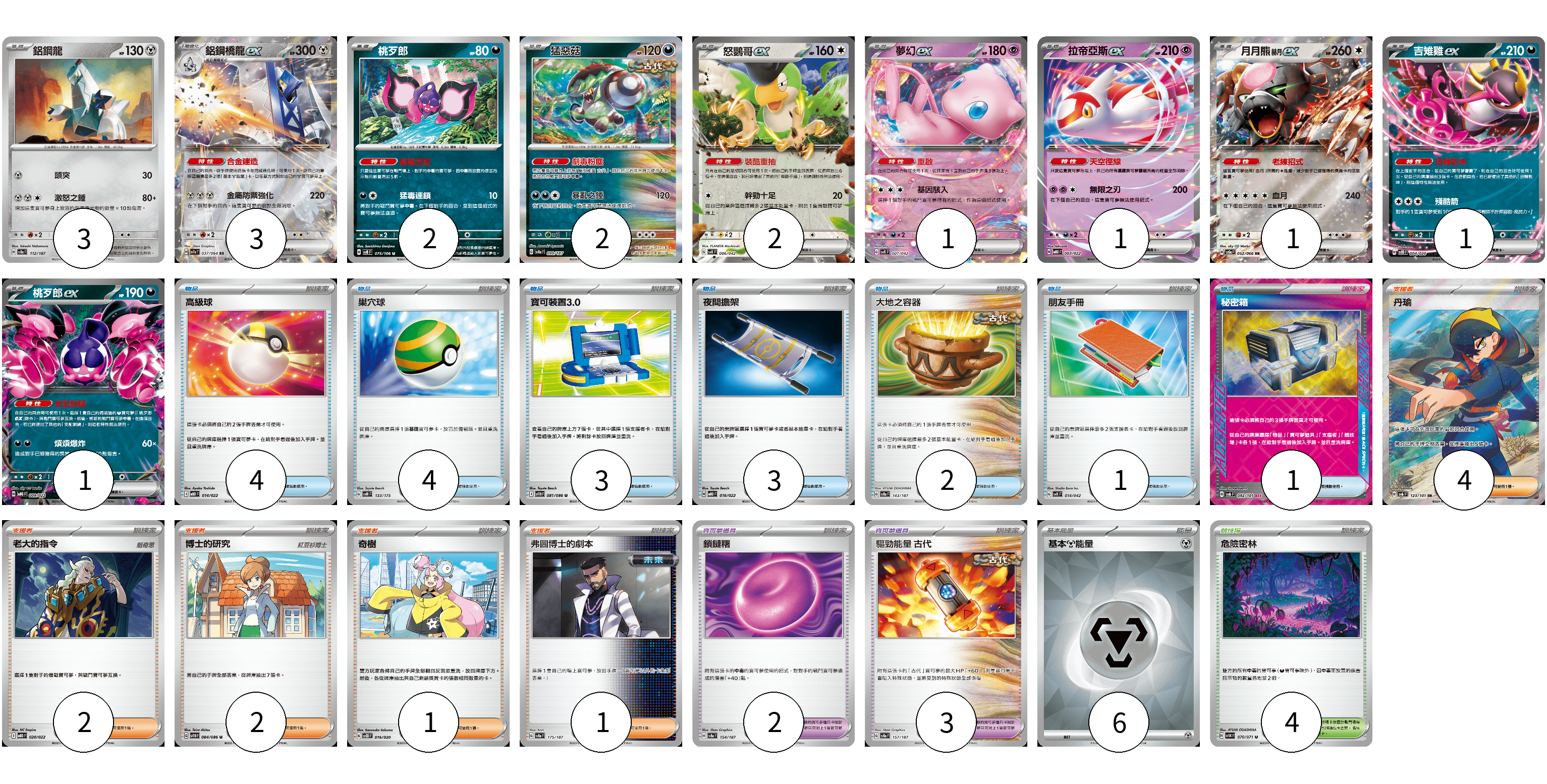 牌組構築方案 以此牌組為基礎新構築牌組 顯示卡面 顯示列表 寶可夢卡(17) 3 3 2 2 2 1 1 1 1 1 寶可夢道具(5) 2 3 物品卡(18) 4 4 3 3 2 1 1 支援者卡(10) 4 2 2 1 1 競技場卡(4) 4 能量卡(6) 6 寶可夢卡(17) 卡牌名稱 張數 卡牌名稱 張數 鋁鋼龍 SV8a 112/187 03 鋁鋼橋龍ex SV7a 037/064 03 桃歹郎 SV8 075/106 02 猛惡菇 SV8a 099/187 02 怒鸚哥ex SVK 006/042 02 夢幻ex SVK 001/042 01 拉帝亞斯ex MBD 003/022 01 月月熊 赫月 ex SV5a 052/066 01 吉雉雞ex SVOD 004/020 01 桃歹郎ex MBG 009/022 01 寶可夢道具(5) 卡牌名稱 張數 卡牌名稱 張數 鎖鏈糬 SV8a 154/187 02 驅勁能量 古代 SV8a 157/187 03 物品卡(18) 卡牌名稱 張數 卡牌名稱 張數 高級球 MBD 014/022 04 巢穴球 SVM 133/175 04 寶可裝置3.0 SV11B 081/086 03 夜間擔架 MBD 016/022 03 大地之容器 SV8a 143/187 02 朋友手冊 SVK 014/042 01 秘密箱 SV6 092/101 01 支援者卡(10) 卡牌名稱 張數 卡牌名稱 張數 丹瑜 SV6 123/101 04 老大的指令 MBD 020/022 02 博士的研究 SV11B 084/086 02 奇樹 SVOD 016/020 01 弗圖博士的劇本 SV8a 175/187 01 競技場卡(4) 卡牌名稱 張數 卡牌名稱 張數 危險密林 SV5K 070/071 04 能量卡(6) 卡牌名稱 張數 卡牌名稱 張數 基本【鋼】能量 SVOD MET 06 以此牌組為基礎新構築牌組 牌組編碼 jTAVsk-zIXCxL-lXcGVE copy 列印牌組單 牌組編碼已複製 分享至SNS