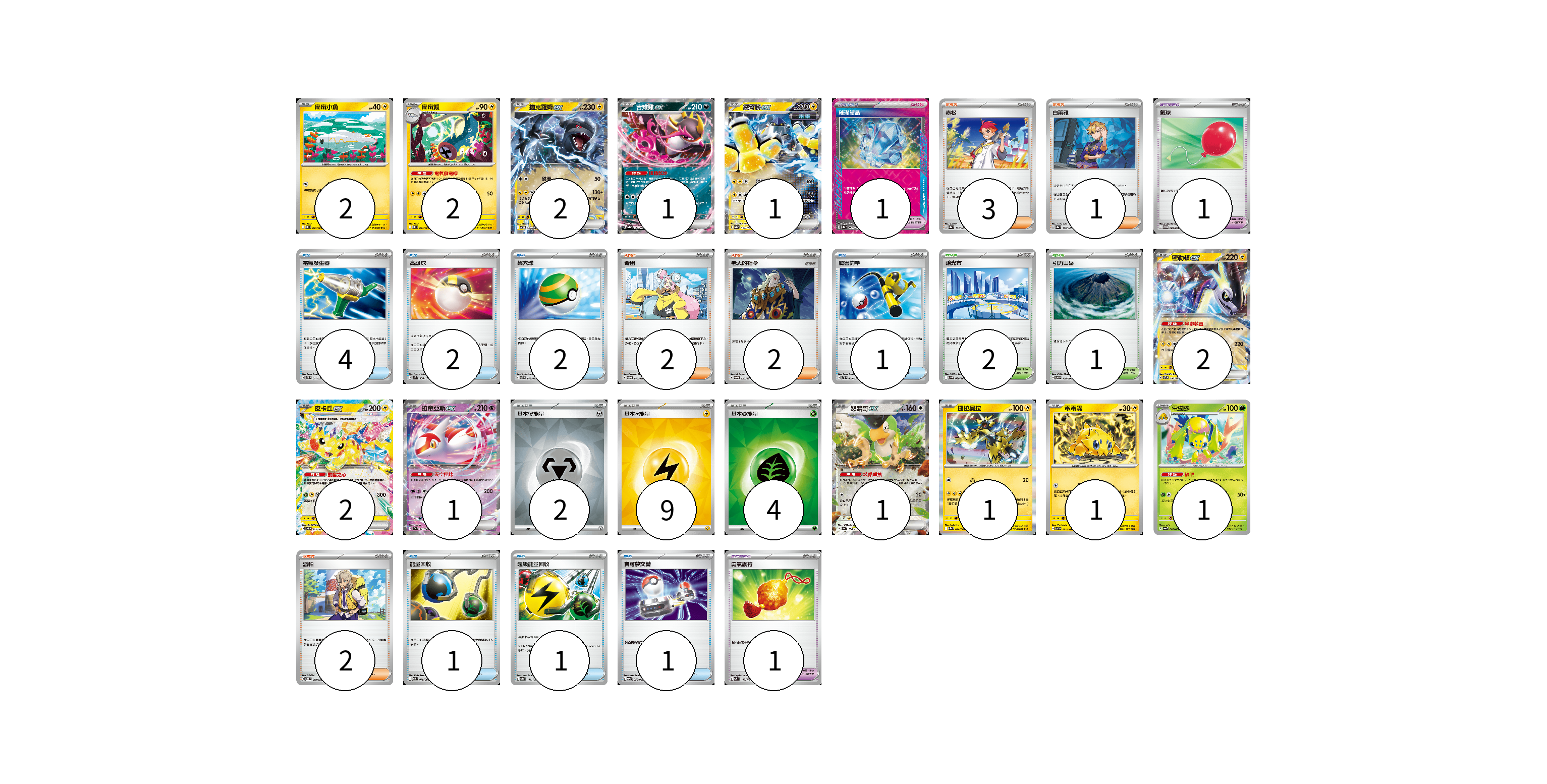 牌組構築方案 以此牌組為基礎新構築牌組 顯示卡面 顯示列表 寶可夢卡(17) 2 2 2 1 1 2 2 1 1 1 1 1 寶可夢道具(3) 1 1 1 物品卡(12) 4 2 2 1 1 1 1 支援者卡(10) 3 1 2 2 2 競技場卡(3) 2 1 能量卡(15) 2 9 4 寶可夢卡(17) 卡牌名稱 張數 卡牌名稱 張數 麻麻小魚 SV11B 033/086 02 麻麻鰻 SV11B 034/086 02 捷克羅姆ex SV11B 037/086 02 吉雉雞ex SV8a 104/187 01 鐵臂膀ex SV8a 054/187 01 密勒頓ex SVTR 008/021 02 皮卡丘ex SV8 033/106 02 拉帝亞斯ex SV7a 019/064 01 怒鸚哥ex SV4a 154/190 01 捷拉奧拉 SV9a 040/063 01 電電蟲 SV7 032/102 01 電蜘蛛 SV6a 002/064 01 寶可夢道具(3) 卡牌名稱 張數 卡牌名稱 張數 璀璨結晶 SV8a 152/187 01 氣球 SV11B 082/086 01 勇氣護符 SVM 142/175 01 物品卡(12) 卡牌名稱 張數 卡牌名稱 張數 電氣發生器 SVTR 011/021 04 高級球 SVM 134/175 02 巢穴球 SVTS 013/022 02 厲害釣竿 SVTL 009/021 01 能量回收 SV11W 079/086 01 超級能量回收 SV8a 141/187 01 寶可夢交替 SV9a 058/063 01 支援者卡(10) 卡牌名稱 張數 卡牌名稱 張數 赤松 SV8a 163/187 03 白蕾雅 SV8a 176/187 01 奇樹 SVOD 016/020 02 老大的指令 SVOM 020/021 02 派帕 SVOD 018/020 02 競技場卡(3) 卡牌名稱 張數 卡牌名稱 張數 釀光市 SV9 098/100 02 引力山岳 SV8 106/106 01 能量卡(15) 卡牌名稱 張數 卡牌名稱 張數 基本【鋼】能量 SVOD MET 02 基本【雷】能量 SVM LIG 09 基本【草】能量 SVM GRA 04 以此牌組為基礎新構築牌組 牌組編碼 jWgghV-RrZkjS-jiWowX copy 列印牌組單 牌組編碼已複製 分享至SNS