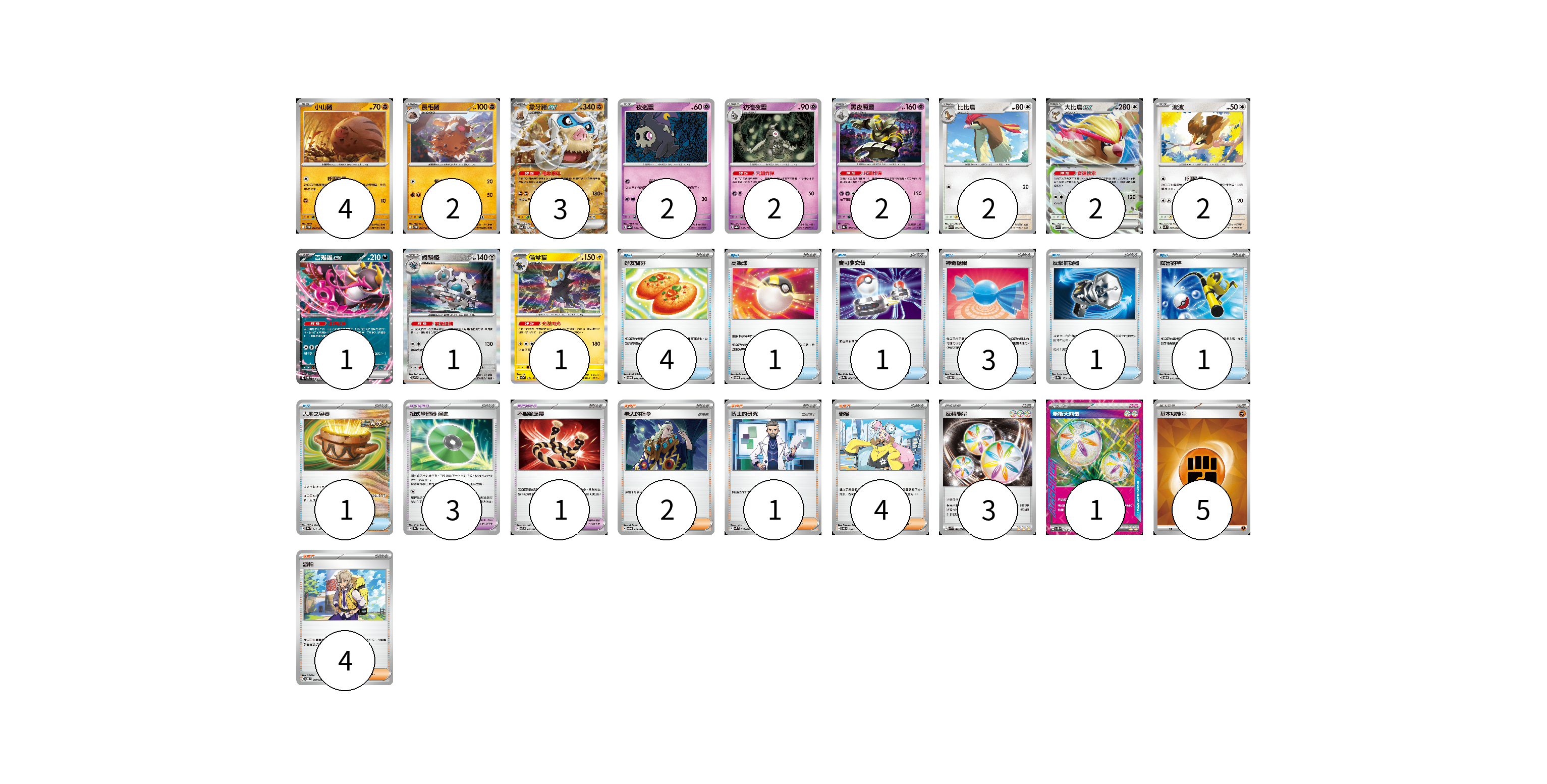 牌組構築方案 以此牌組為基礎新構築牌組 顯示卡面 顯示列表 寶可夢卡(24) 4 2 3 2 2 2 2 2 2 1 1 1 寶可夢道具(4) 3 1 物品卡(12) 4 1 1 3 1 1 1 支援者卡(11) 2 1 4 4 能量卡(9) 3 1 5 寶可夢卡(24) 卡牌名稱 張數 卡牌名稱 張數 小山豬 SV9 044/100 04 長毛豬 SV9 045/100 02 象牙豬ex SV9 046/100 03 夜巡靈 SV8a 064/187 02 彷徨夜靈 SV8a 065/187 02 黑夜魔靈 SV8a 066/187 02 比比鳥 SVK 004/042 02 大比鳥ex SVK 005/042 02 波波 SVK 003/042 02 吉雉雞ex SVOD 004/020 01 齒輪怪 SV7 069/102 01 倫琴貓 SV2D 021/071 01 寶可夢道具(4) 卡牌名稱 張數 卡牌名稱 張數 招式學習器 演進 SV8a 160/187 03 不服輸頭帶 SVTL 016/021 01 物品卡(12) 卡牌名稱 張數 卡牌名稱 張數 好友寶芬 SVOD 011/020 04 高級球 SVOD 012/020 01 寶可夢交替 SV9a 058/063 01 神奇糖果 SVOD 013/020 03 反擊捕捉器 SV8a 139/187 01 厲害釣竿 SVOD 010/020 01 大地之容器 SV8a 143/187 01 支援者卡(11) 卡牌名稱 張數 卡牌名稱 張數 老大的指令 SVOD 019/020 02 博士的研究 SVK 033/042 01 奇樹 SVOD 016/020 04 派帕 SVOD 018/020 04 能量卡(9) 卡牌名稱 張數 卡牌名稱 張數 反轉能量 SVK 041/042 03 新衝天能量 SV5K 071/071 01 基本【鬥】能量 SVK FIG 05 以此牌組為基礎新構築牌組 牌組編碼 jXCFUz-NrzIPu-ClBrQs copy 列印牌組單 牌組編碼已複製 分享至SNS