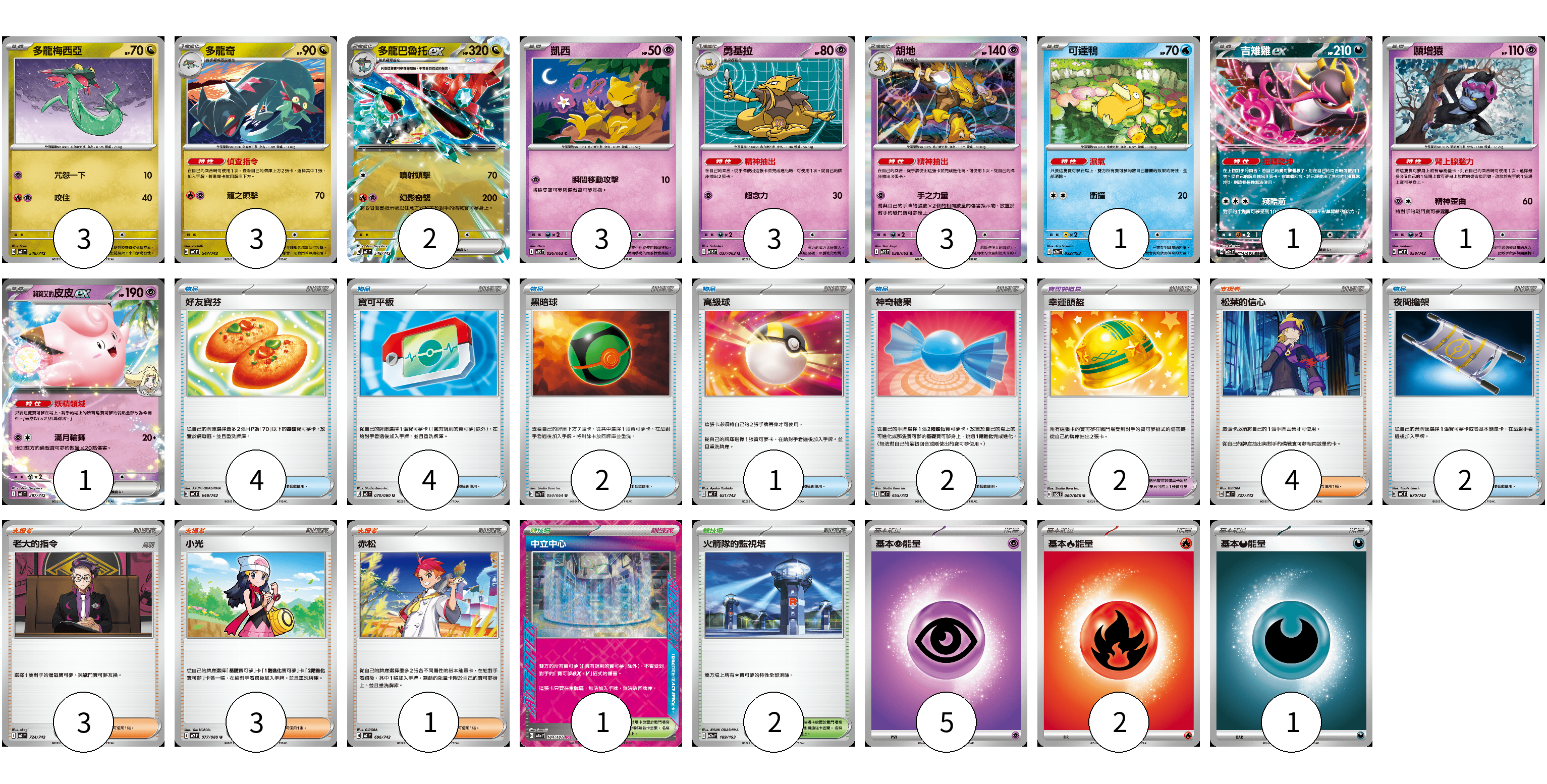 牌組構築方案 以此牌組為基礎新構築牌組 顯示卡面 顯示列表 寶可夢卡(21) 3 3 2 3 3 3 1 1 1 1 寶可夢道具(2) 2 物品卡(15) 4 4 2 1 2 2 支援者卡(11) 4 3 3 1 競技場卡(3) 1 2 能量卡(8) 5 2 1 寶可夢卡(21) 卡牌名稱 張數 卡牌名稱 張數 多龍梅西亞 MC 546/742 03 多龍奇 MC 547/742 03 多龍巴魯托ex MC 548/742 02 凱西 M1S 036/063 03 勇基拉 M1S 037/063 03 胡地 M1S 038/063 03 可達鴨 M2a 032/193 01 吉雉雞ex M2a 114/193 01 願增猿 MC 358/742 01 莉莉艾的皮皮ex MC 287/742 01 寶可夢道具(2) 卡牌名稱 張數 卡牌名稱 張數 幸運頭盔 SV5a 060/066 02 物品卡(15) 卡牌名稱 張數 卡牌名稱 張數 好友寶芬 MC 648/742 04 寶可平板 M3 070/080 04 黑暗球 SV7a 054/064 02 高級球 MC 651/742 01 神奇糖果 MC 655/742 02 夜間擔架 MC 670/742 02 支援者卡(11) 卡牌名稱 張數 卡牌名稱 張數 松葉的信心 MC 727/742 04 老大的指令 MC 724/742 03 小光 M2 077/080 03 赤松 MC 696/742 01 競技場卡(3) 卡牌名稱 張數 卡牌名稱 張數 中立中心 SV8a 184/187 01 火箭隊的監視塔 M2a 189/193 02 能量卡(8) 卡牌名稱 張數 卡牌名稱 張數 基本【超】能量 MC PSY 05 基本【火】能量 MC FIR 02 基本【惡】能量 MC DAR 01 以此牌組為基礎新構築牌組 牌組編碼 jYMMwu-zxrOQJ-rUfHDp copy 列印牌組單 牌組編碼已複製 分享至SNS